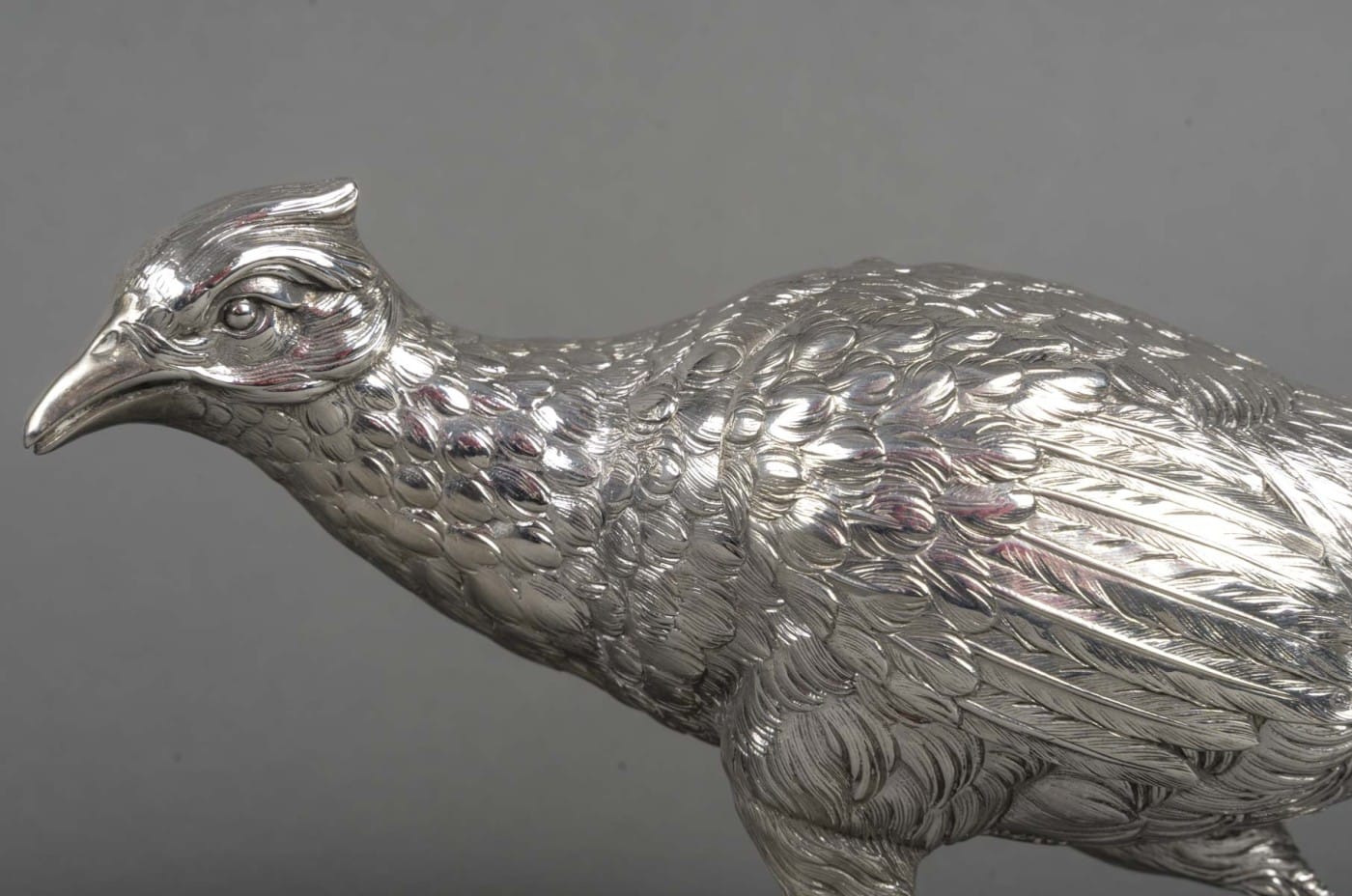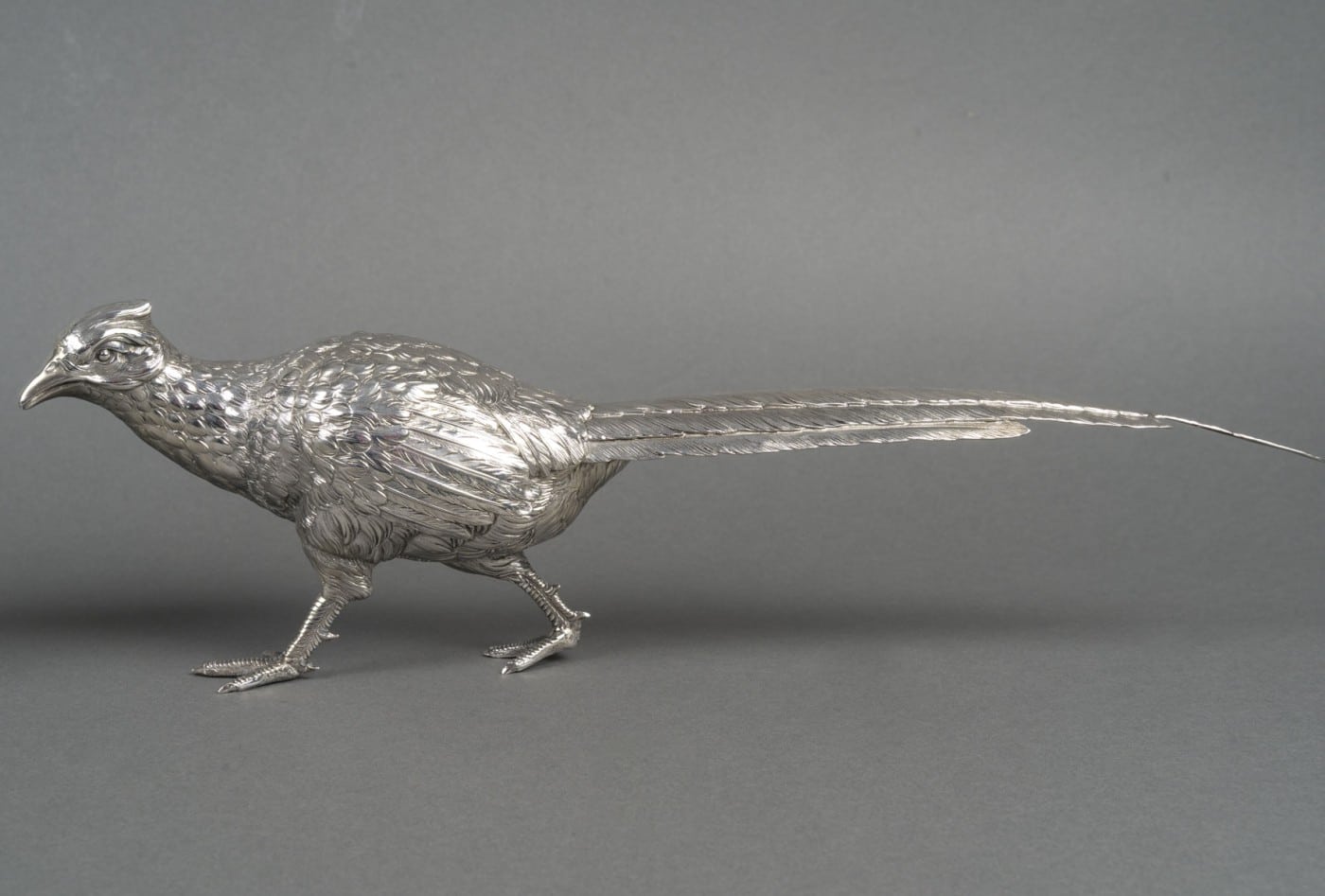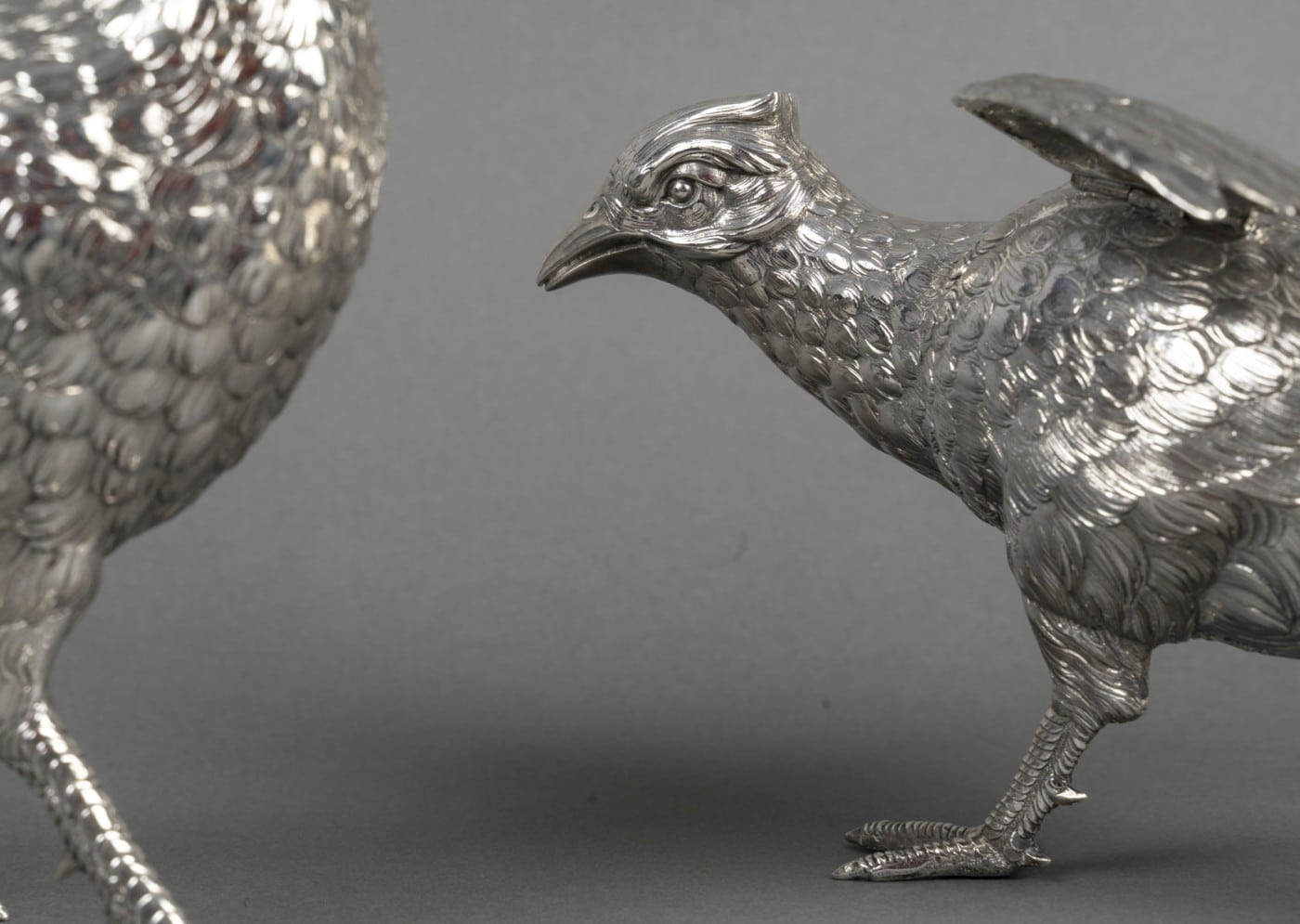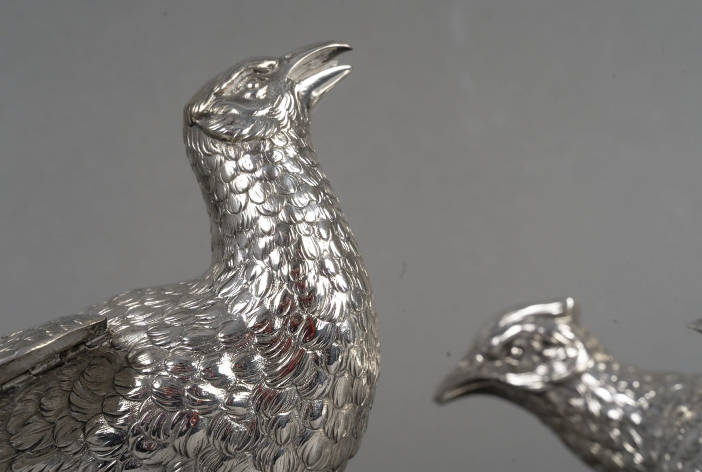 Paire de faisans mâle et femelle en argent massif entièrement ciselés de plumes, et dont les ailes articulées se soulèvent. L’un a la tête en bas et l’autre a la tête en haut.