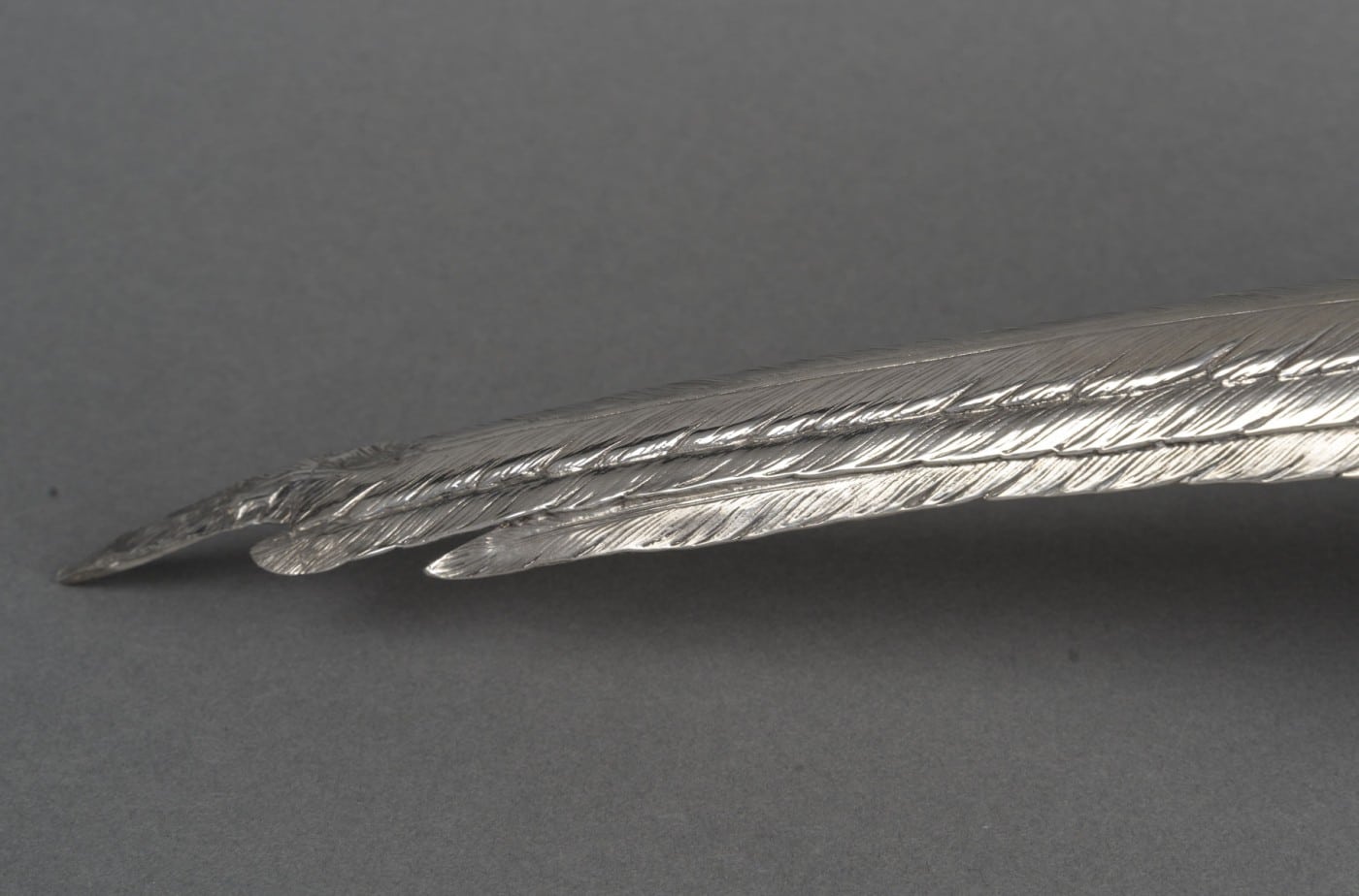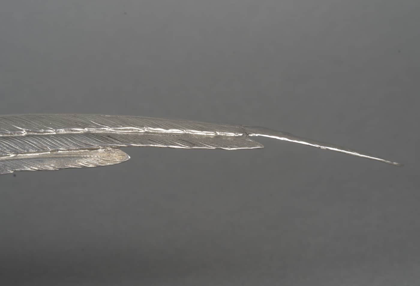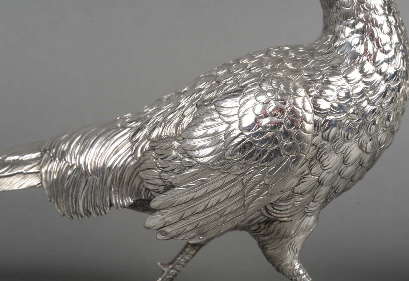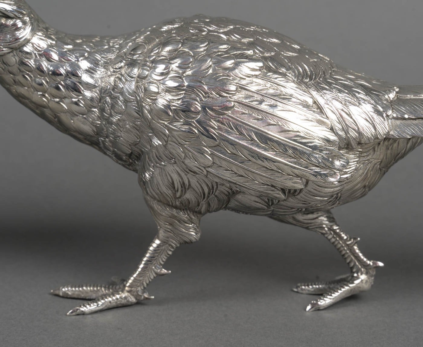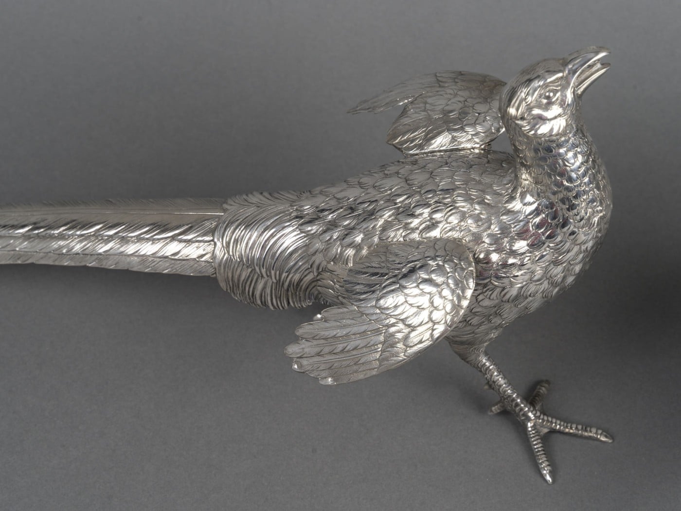 Paire de faisans mâle et femelle en argent massif entièrement ciselés de plumes, et dont les ailes articulées se soulèvent. L’un a la tête en bas et l’autre a la tête en haut.