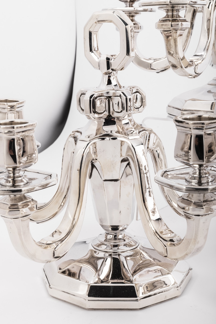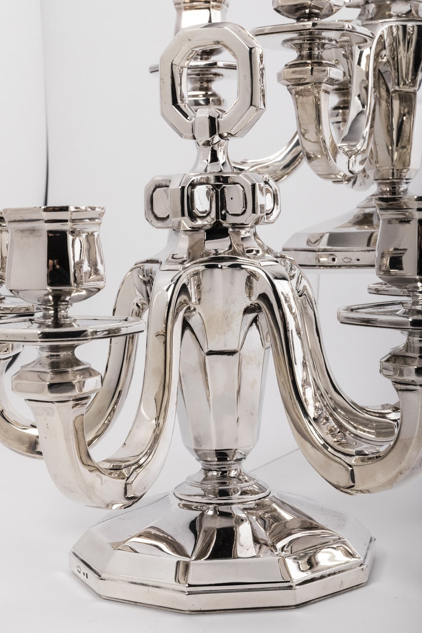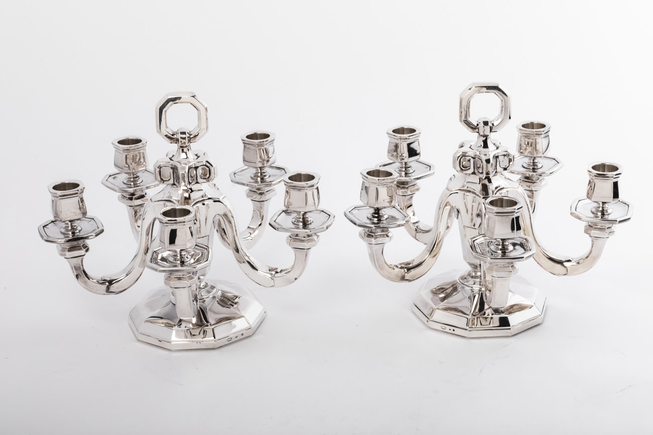Très belle paire de candélabres en argent massif, chaque candélabre a une base octogonale surmontée d’un bouquet à cinq bras de lumières travaillé à pans coupés, la prise au centre est en forme d’anneau octogonale.
