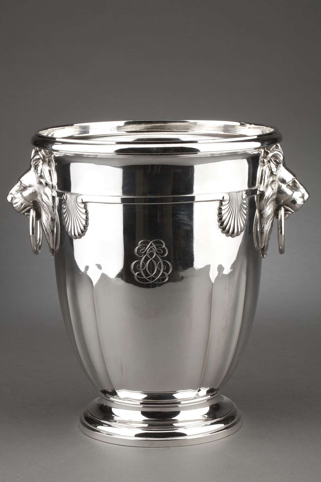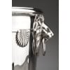Rafraichissoir en argent massif monté sur un pièdouche à doucine. Le corps uni est décoré de coquillages en applique, flanqué de chaque côté d’une prise zoomorphe représentée par une tête de lion tenant un anneau. Le col est ceinturé d’un simple bourrelet.