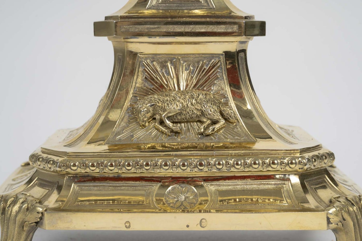Reposant sur une base quadrilobée ornée d’un agneau.