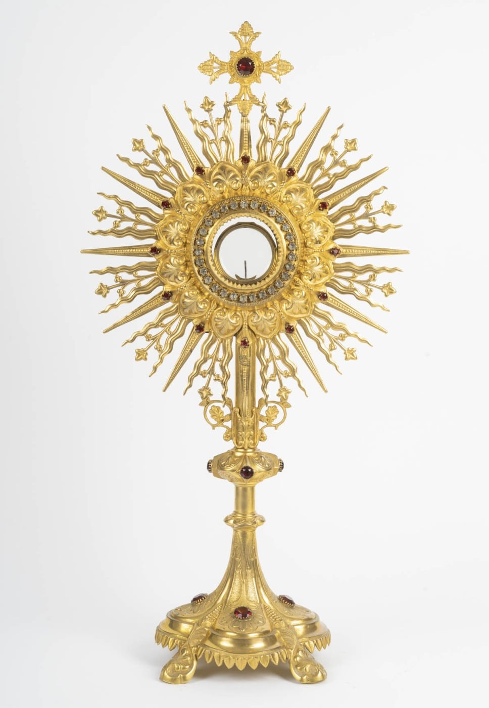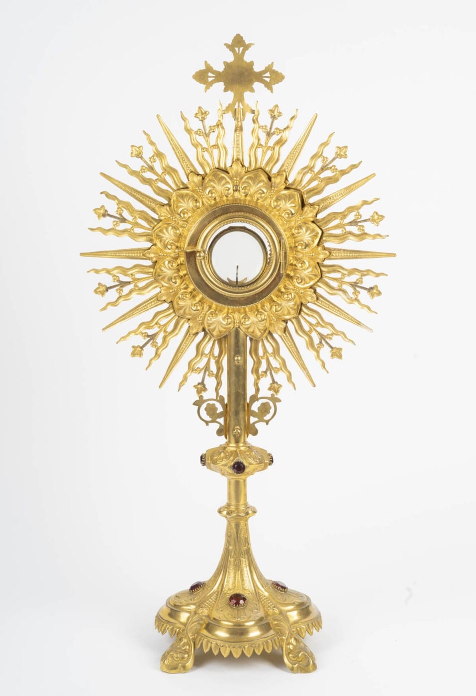 Très bel ostensoir en laiton doré serti de cristaux taillés et facetés couleur rubis de style néogothique, d’époque Napoléon III (1848-1870), XIXème siècle.