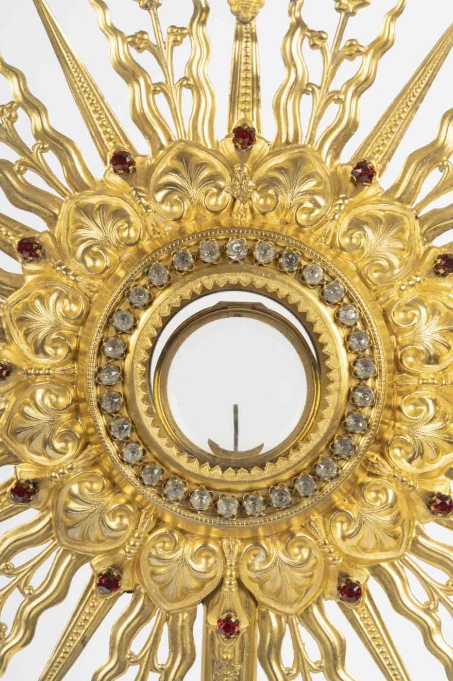La lunette rayonnante ornée d’un rang de cristaux translucides taillés et facetés est surmontée d’une croix.