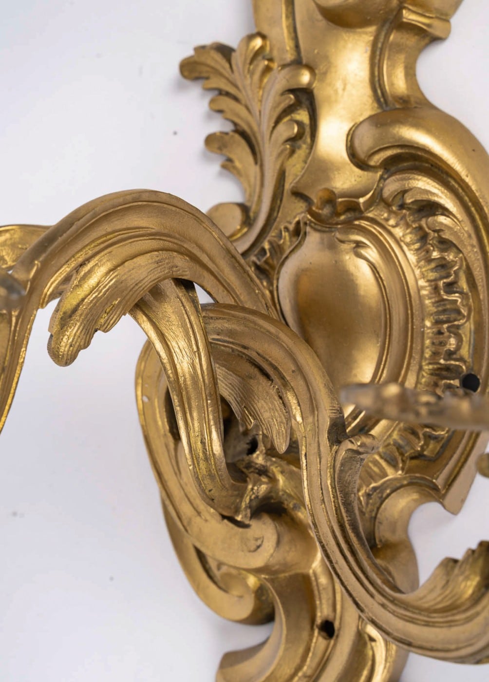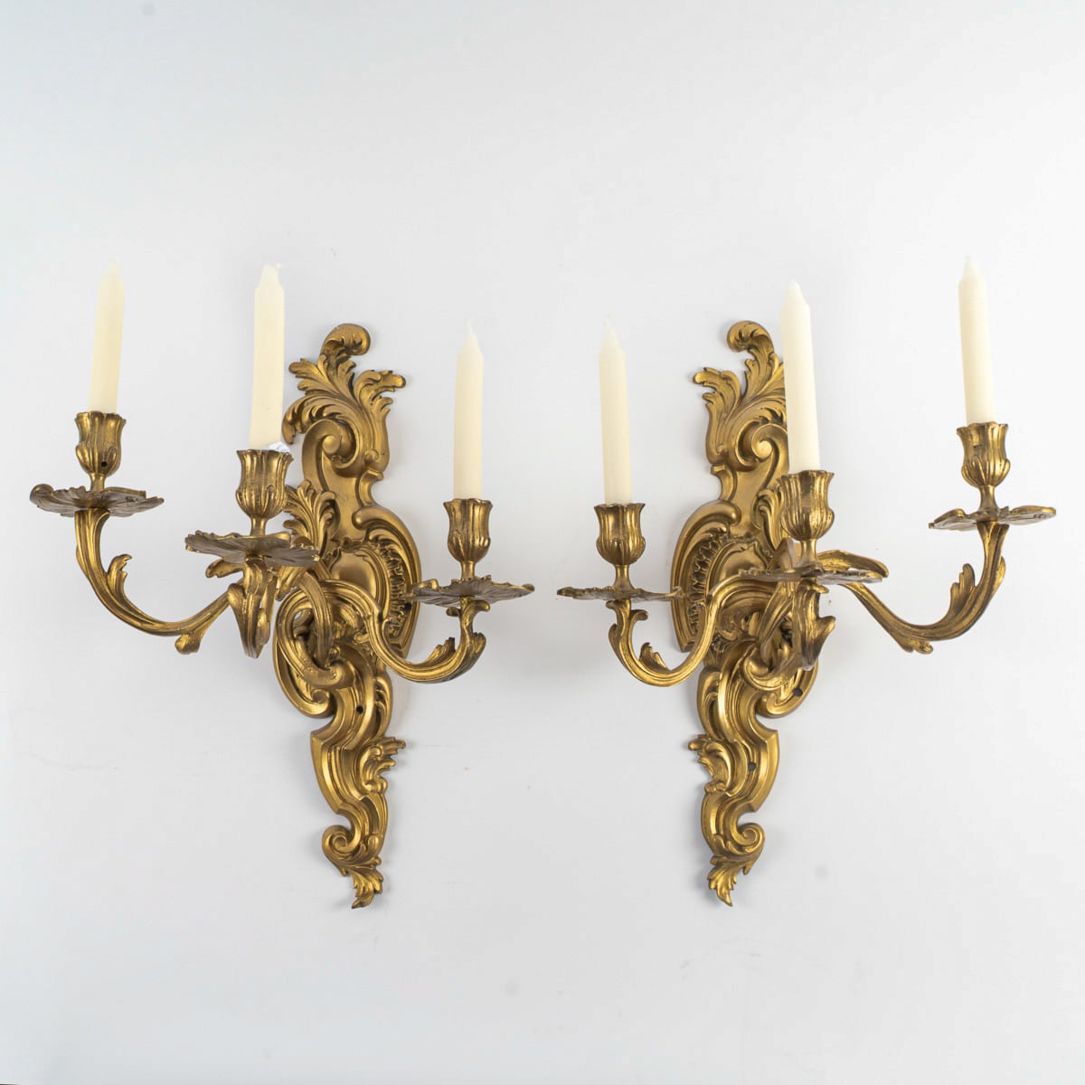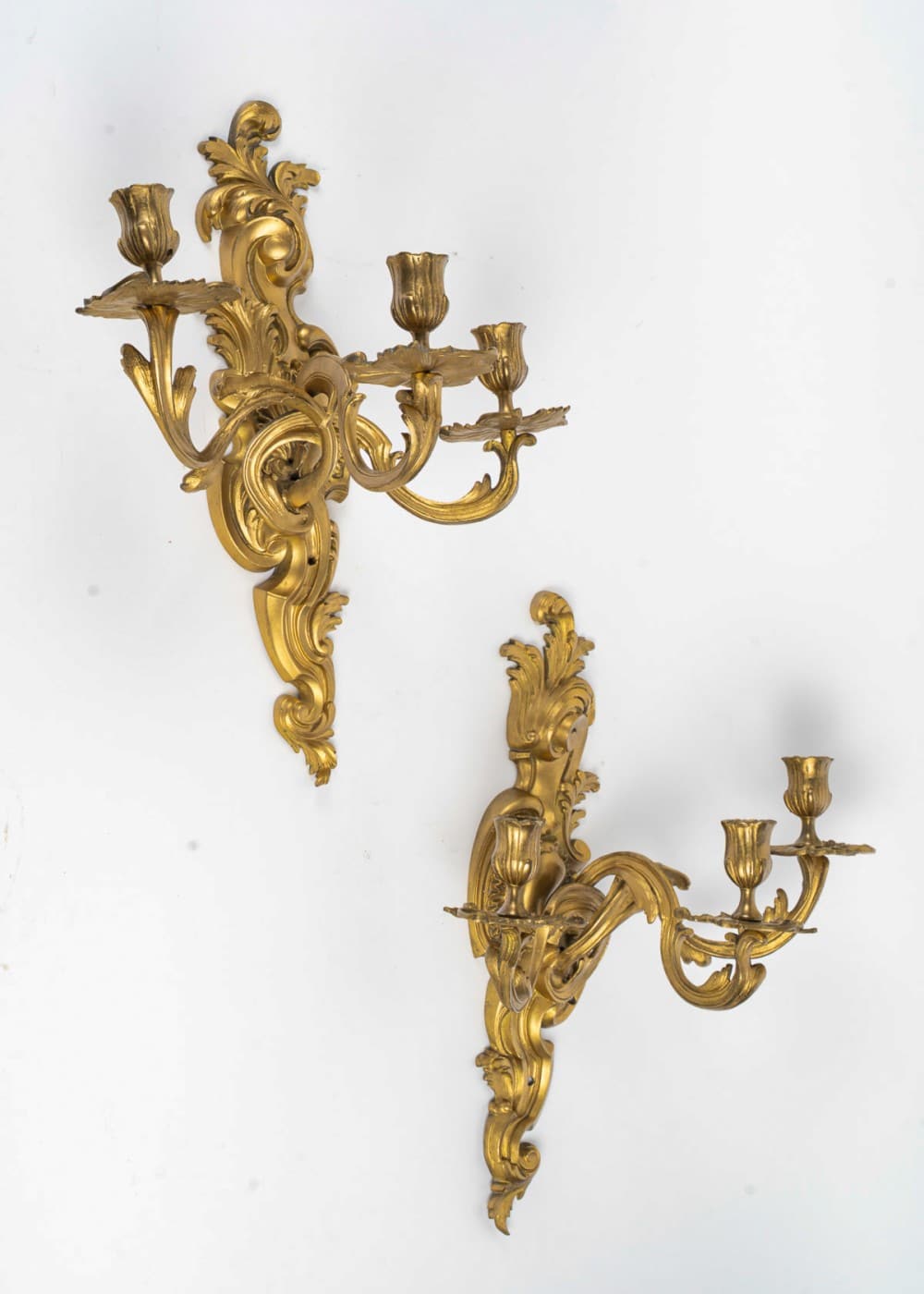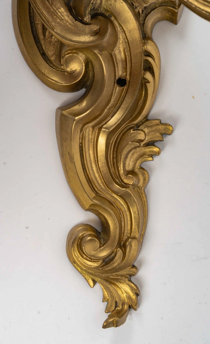 A finely crafted pair of three-arm wall sconces in the Louis XV Rocaille style, chiseled in gilt bronze. The design is adorned with scroll motifs and acanthus leaves.