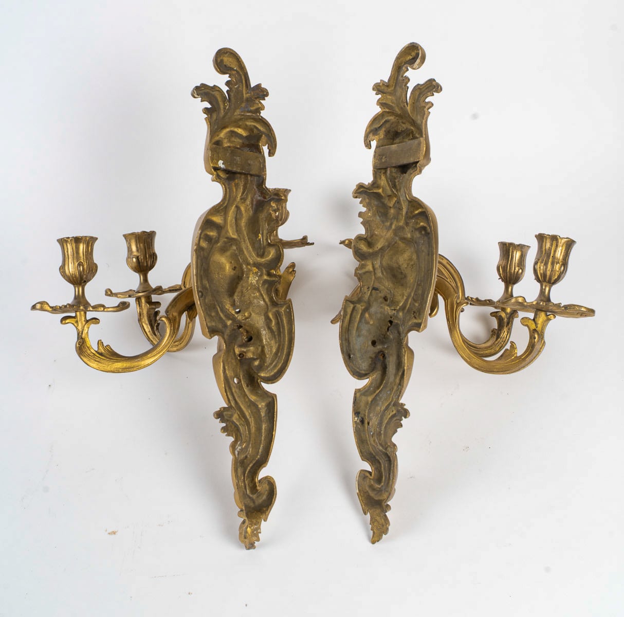 Pair of Rocaille- Louis XV Style Three Light Wall Sconces in Gilt Bronze, c. 1900