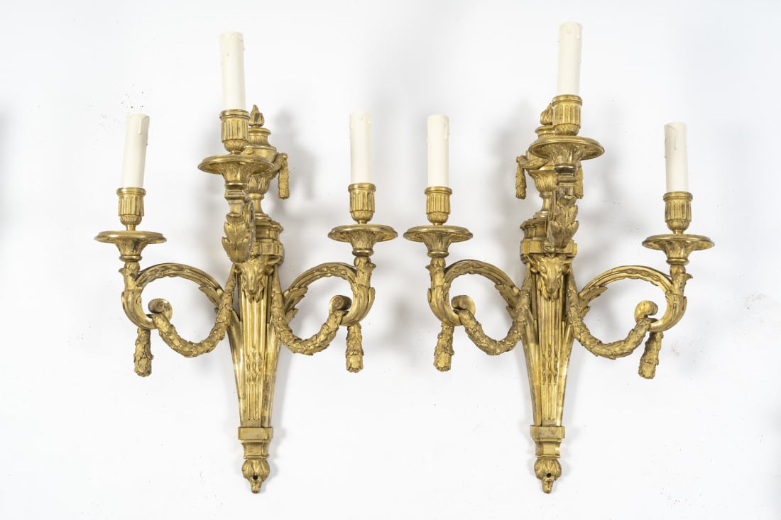 Paire d’appliques en bronze doré à trois bras de lumières, d’époque Louis XVI (1774 – 1793).