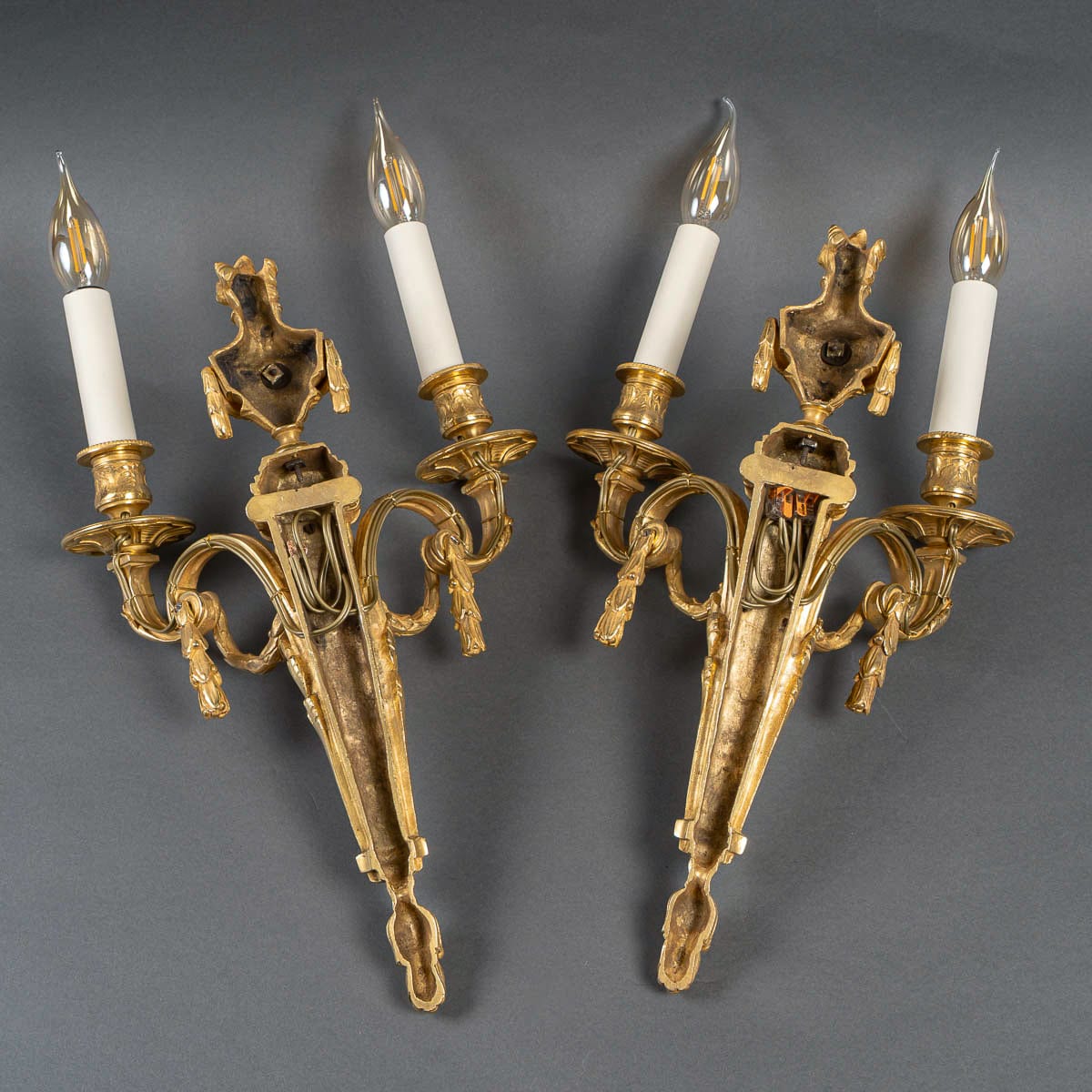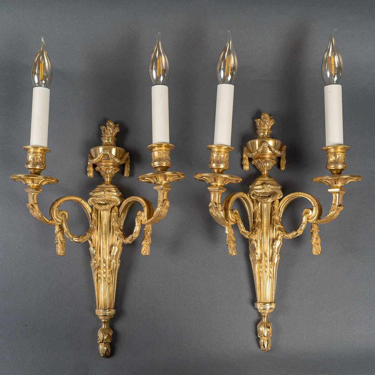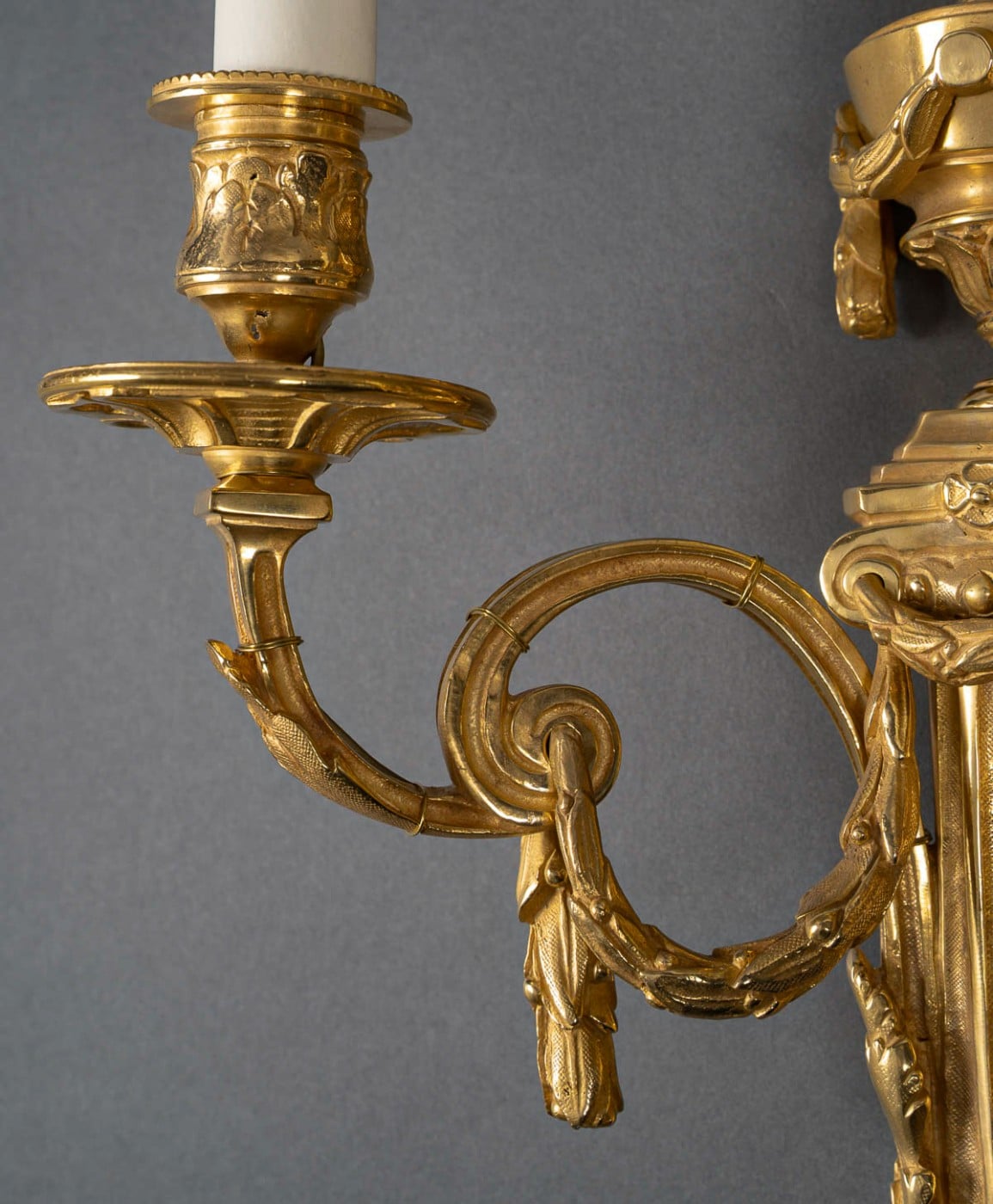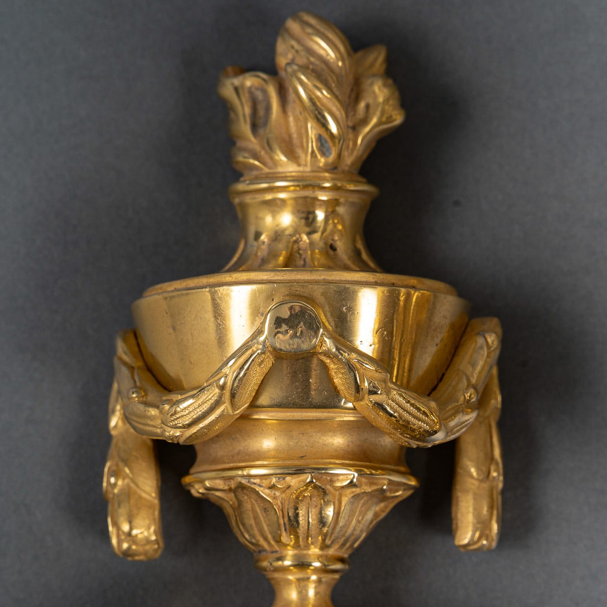 Une élégante et décorative paire d’appliques à deux bras de lumière en bronze ciselé et dore. Ces appliques sont ornées d’un décor symbolique, comprenant un pot à feu à l’amortissement et un fût à cannelures rudentées, agrémenté de tors de laurier.