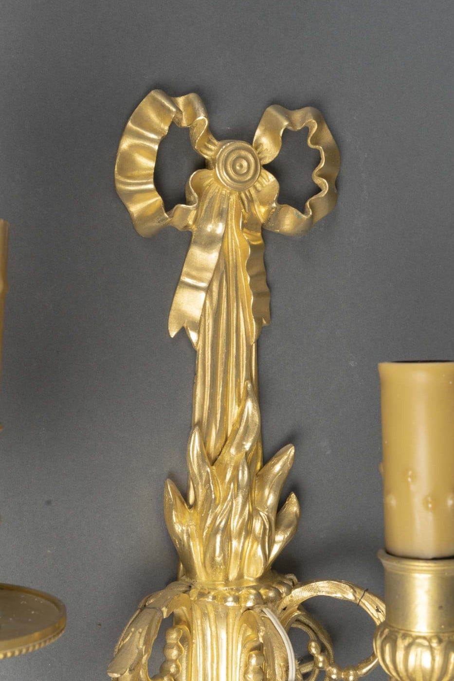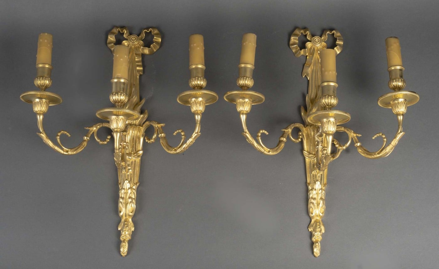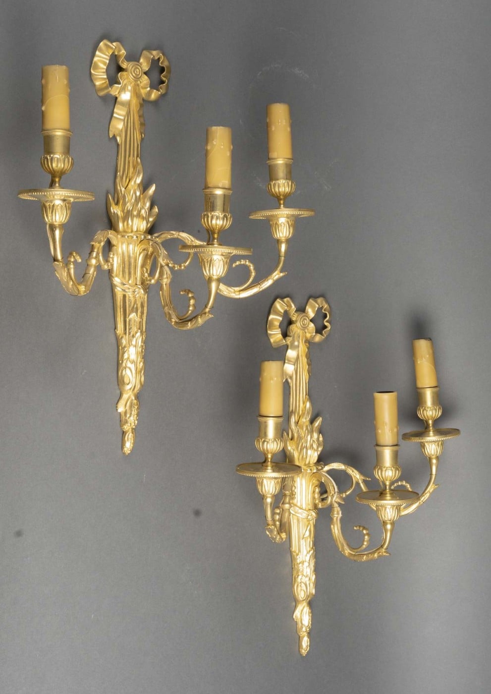Chaque applique présente en partie supérieure un nœud rubané richement travaillé, motif emblématique du répertoire Louis XVI, prolongé par un fût cannelé agrémenté d’une gerbe feuillagée. Les trois bras de lumière, harmonieusement galbés, sont ornés de bobèches moulurées et témoignent d’un travail de ciselure soigné et équilibré.