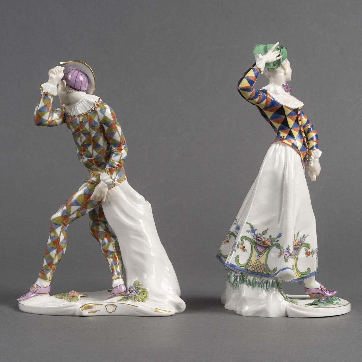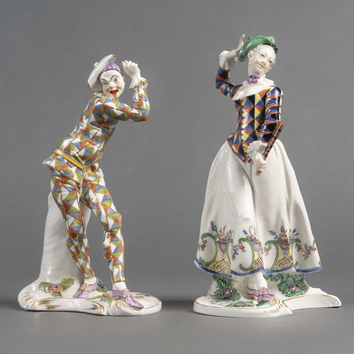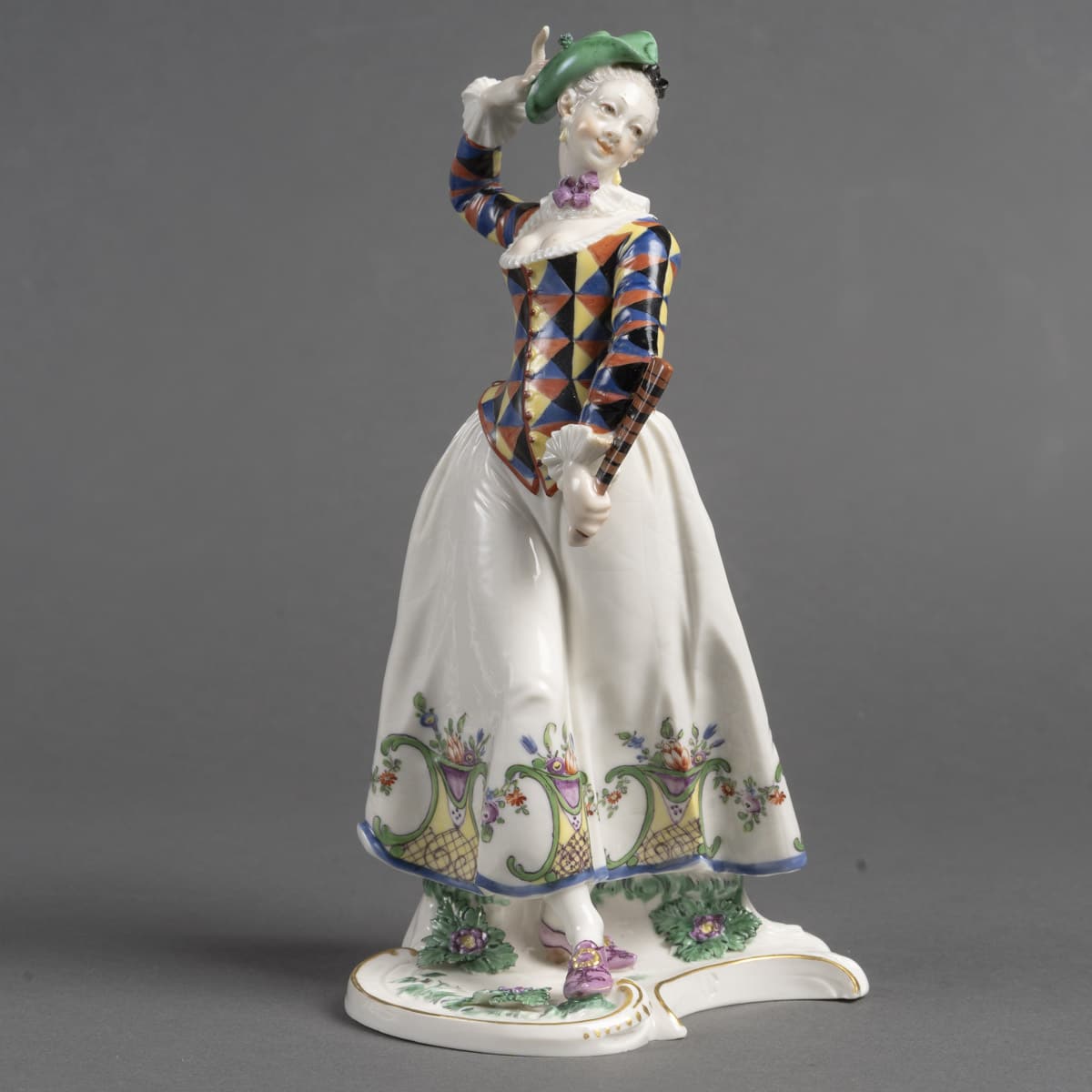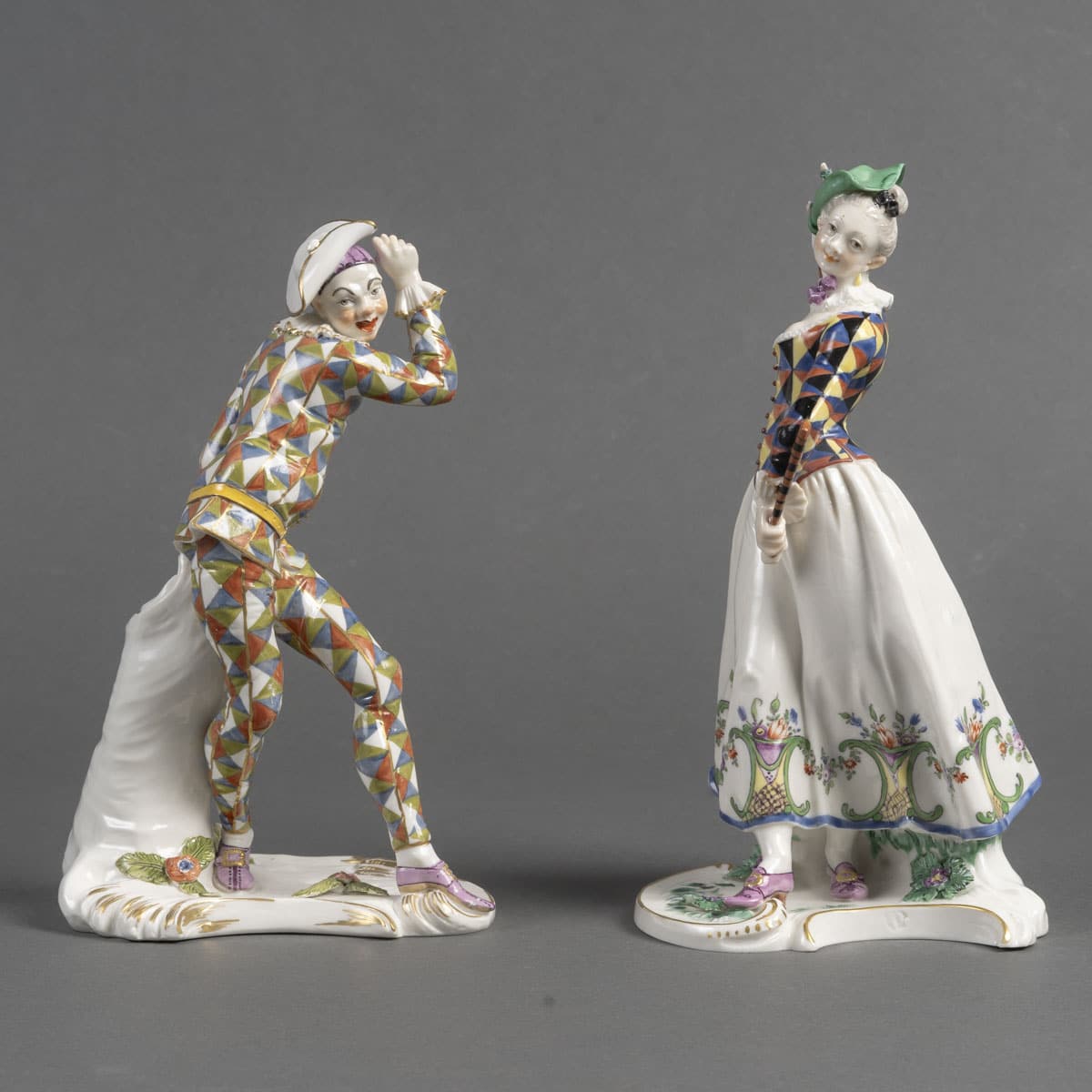 La figure d’Arlequin, issue de la commedia dell’arte, incarne l’esprit populaire, la mobilité du corps et la vivacité de l’expression, autant d’éléments qui trouvent un écho remarquable dans les figurines de porcelaine de la manufacture de Nymphenburg. Au XVIIIᵉ siècle, alors que la porcelaine devient un art de cour prestigieux, Nymphenburg s’approprie des personnages populaires du théâtre italien pour les transformer en objets raffinés, destinés à l’aristocratie.