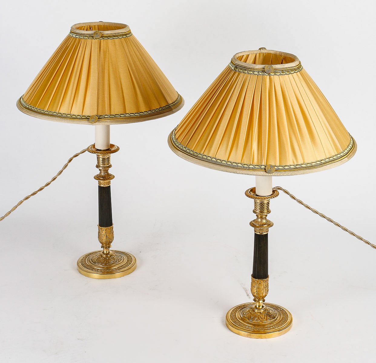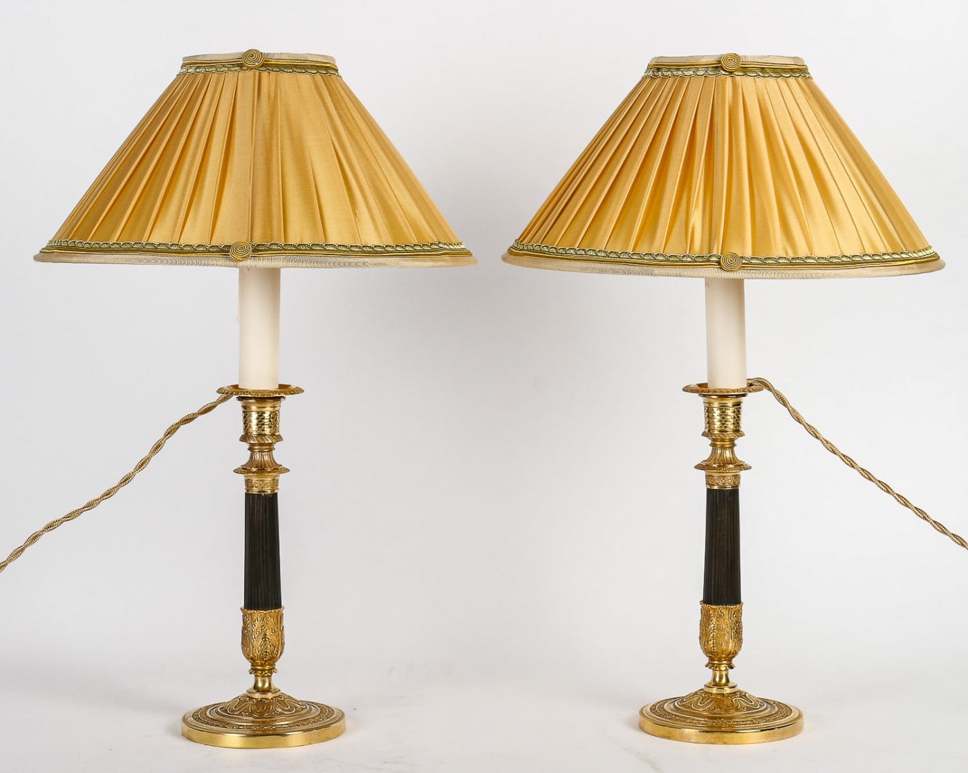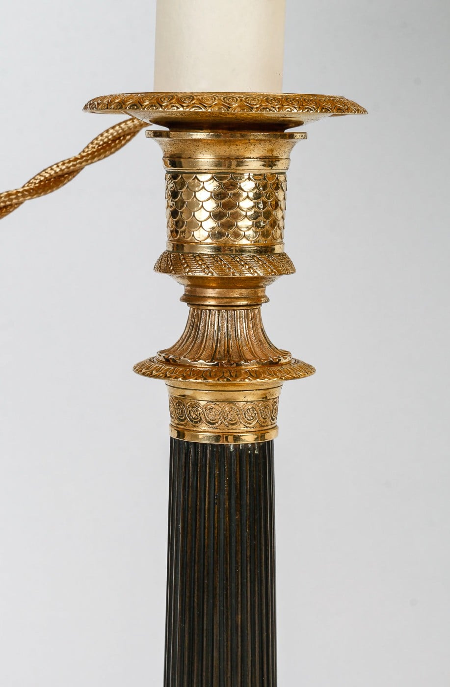 Paire de Bougeoirs d’époque Empire en Bronze Patiné et Doré montés en lampes vers 1810