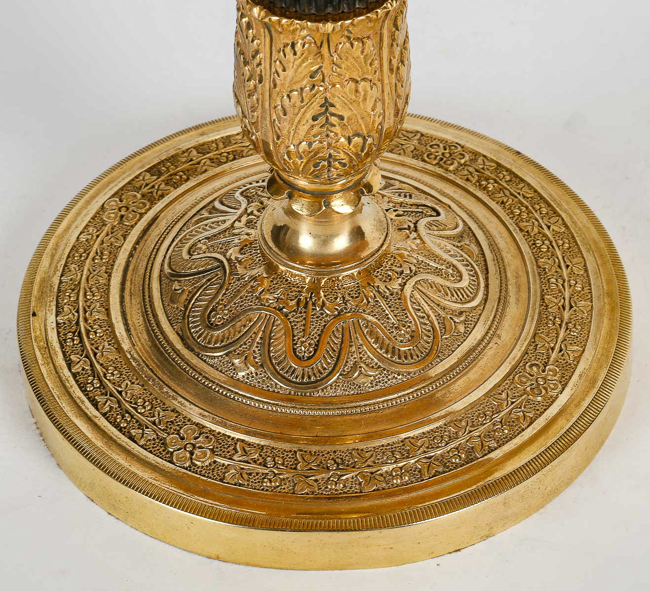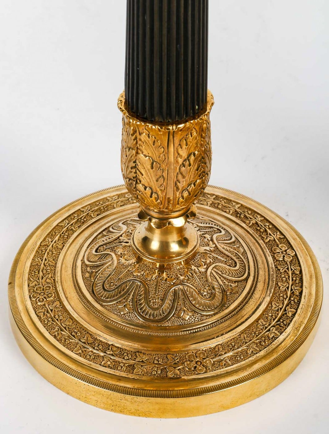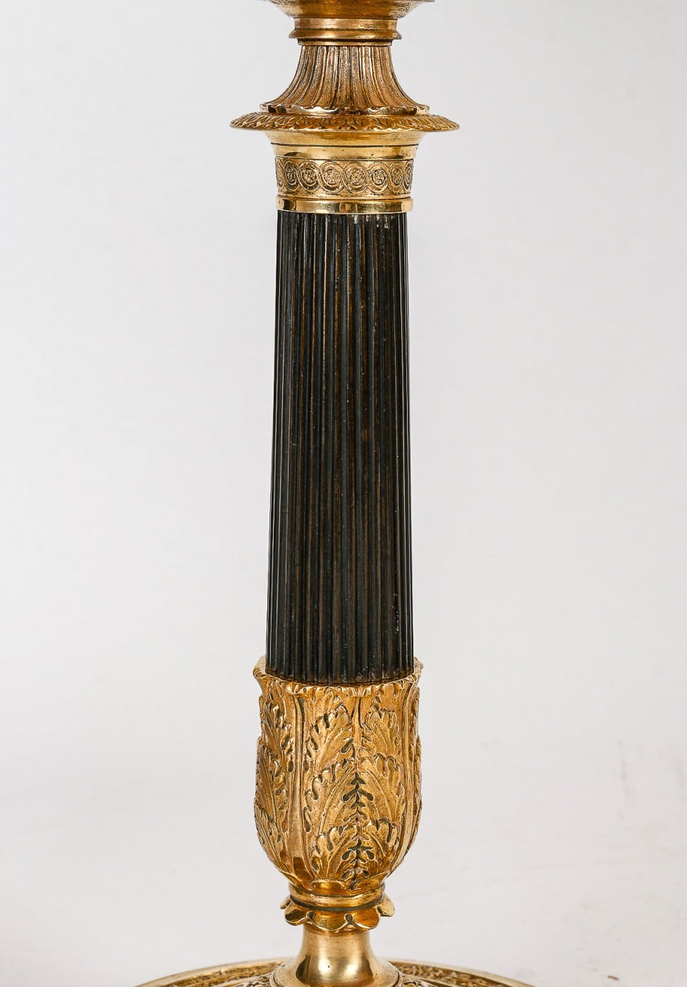 Paire de Bougeoirs d’époque Empire en Bronze Patiné et Doré montés en lampes vers 1810