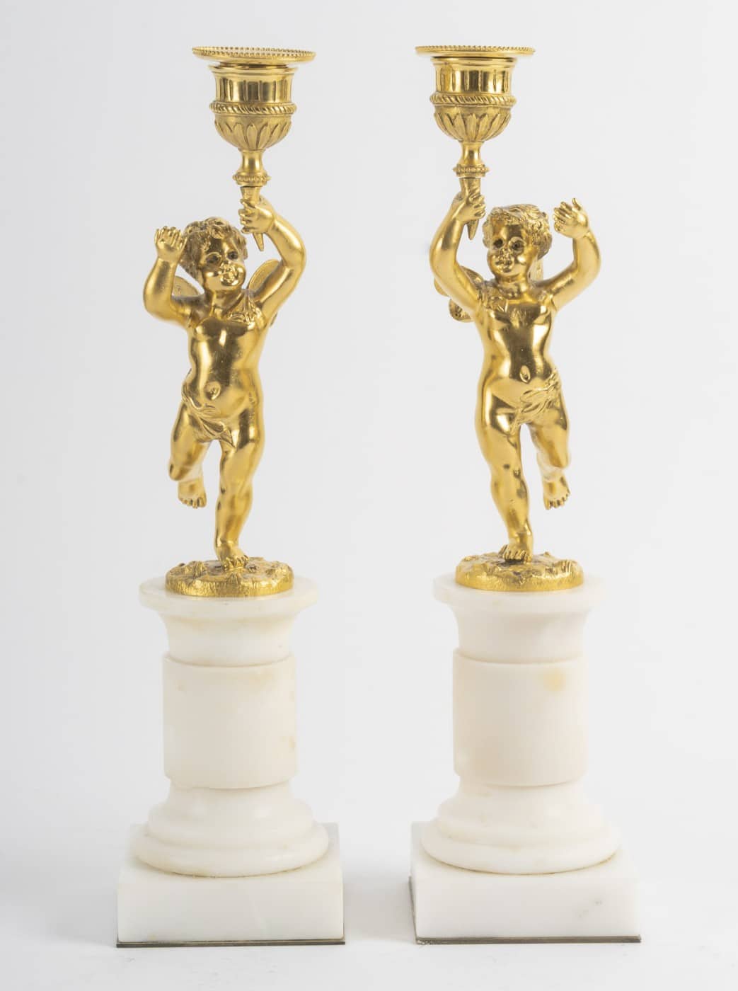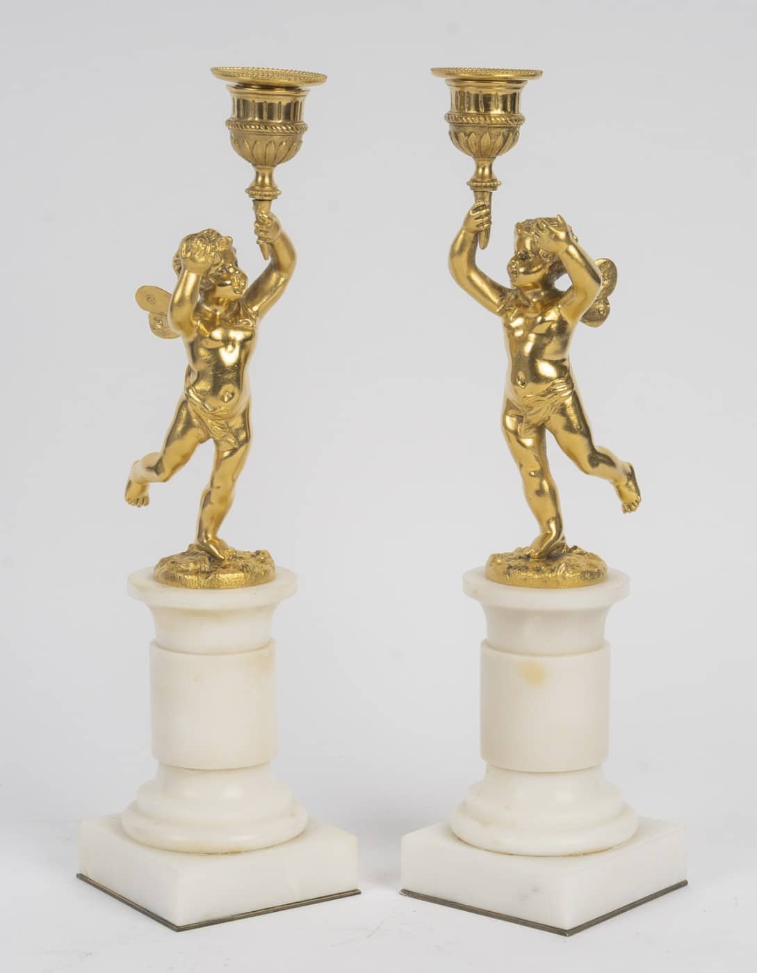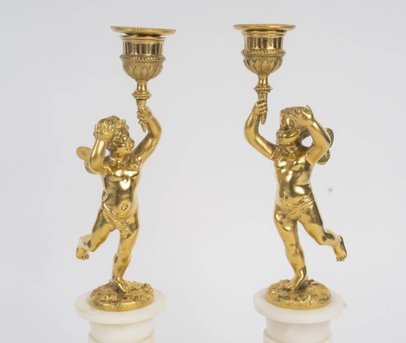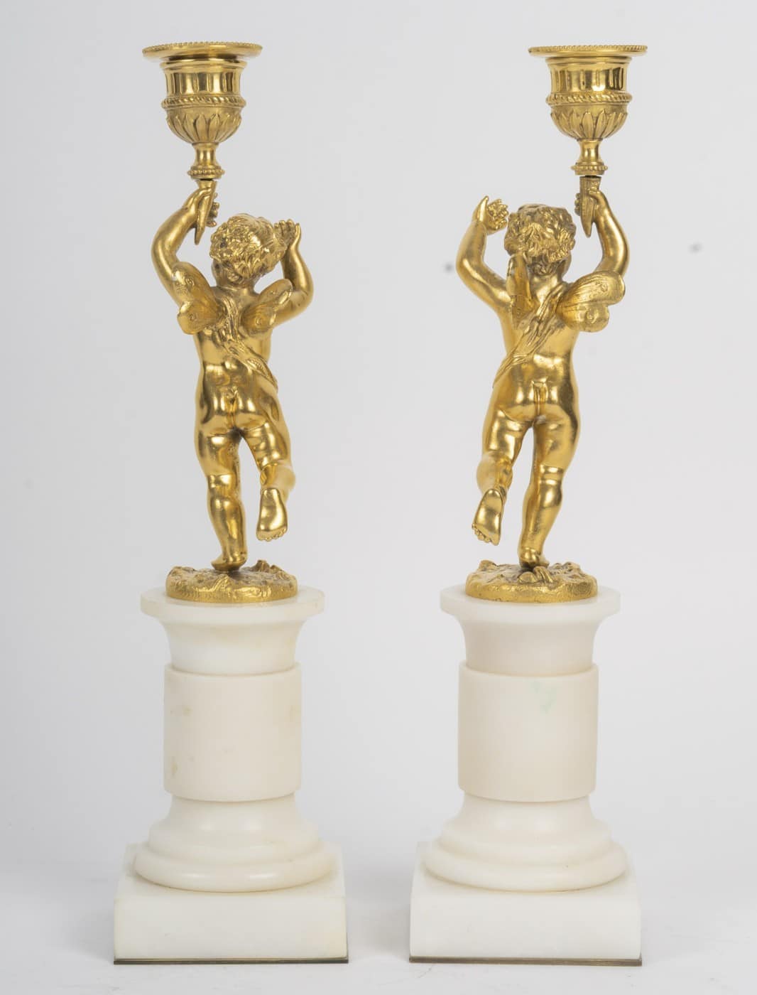 Paire de bougeoirs en bronze doré et marbre blanc circa 1900