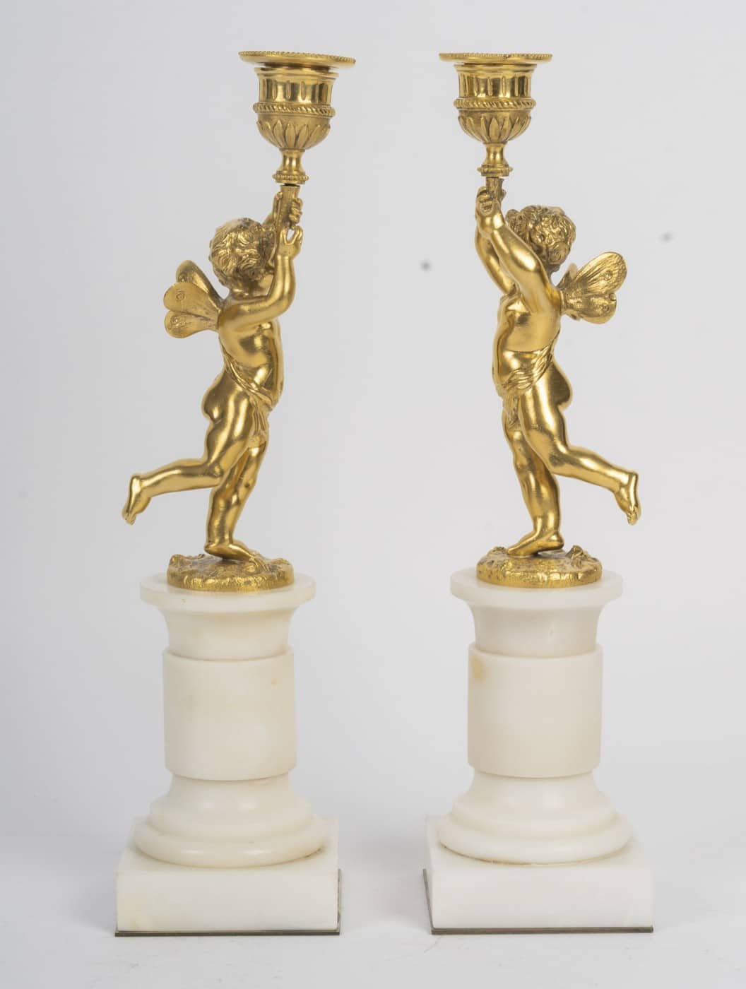 Paire de grands bougeoirs en bronze doré représentant un angelot soutenant 1 bras de lumière. Socle en marbre blanc. Époque Fin 19ème début 20ème siècle. Style Louis XVI