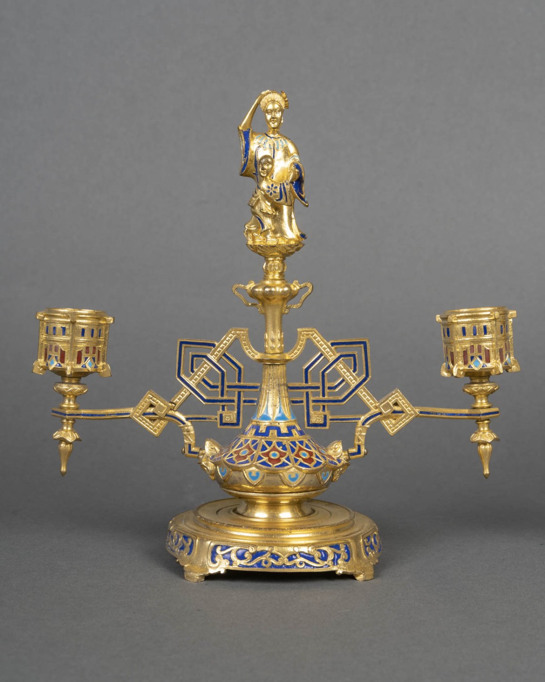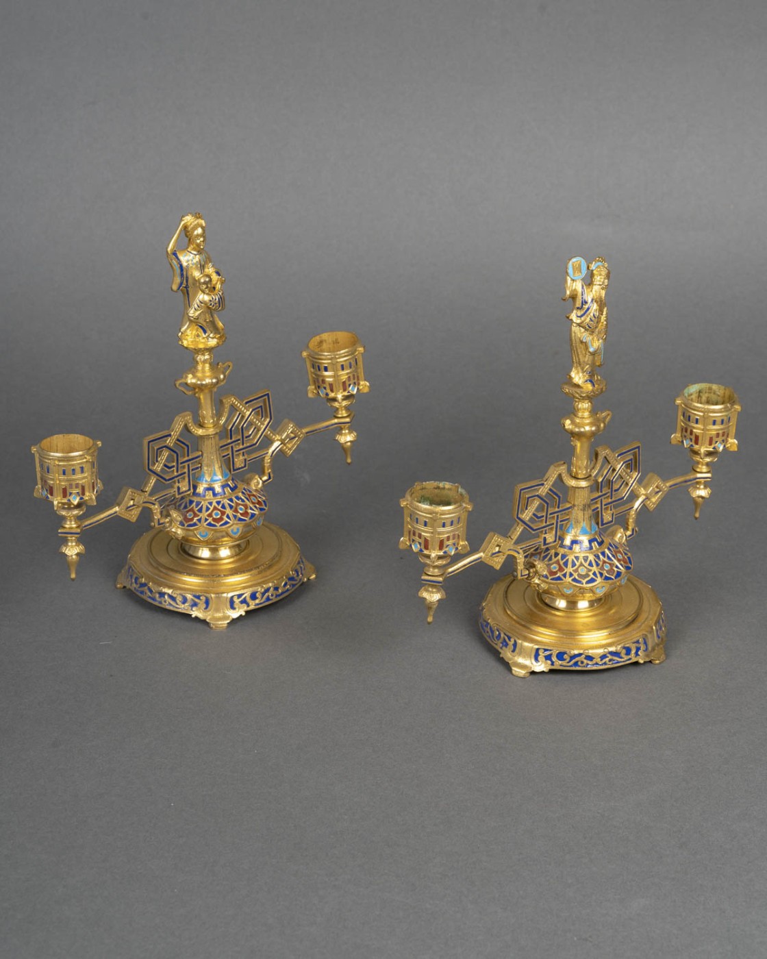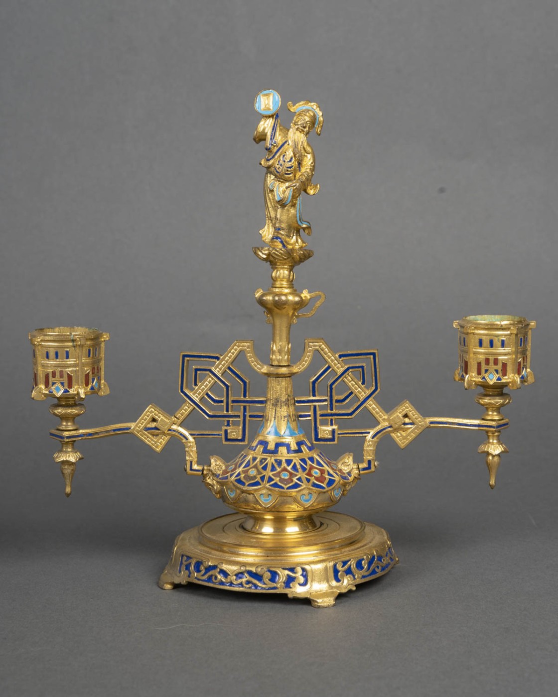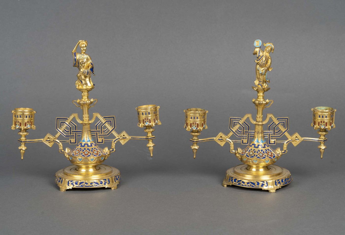 Paire de bougeoirs en bronze doré et émail à décor orientaliste. La base à décor d’une frise de volutes, le fut figurant un vase d’où s’échappent les binets, la partie haute sommée d’une figure d’un sage pour l’un et d’une femme pour l’autre. Le tout parcouru de motifs géométriques rehaussés d’émail.
