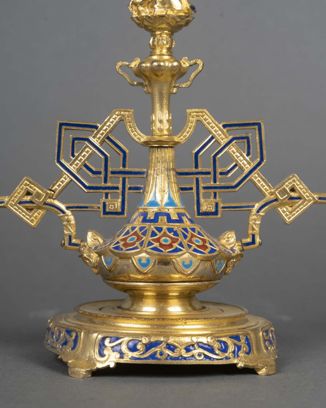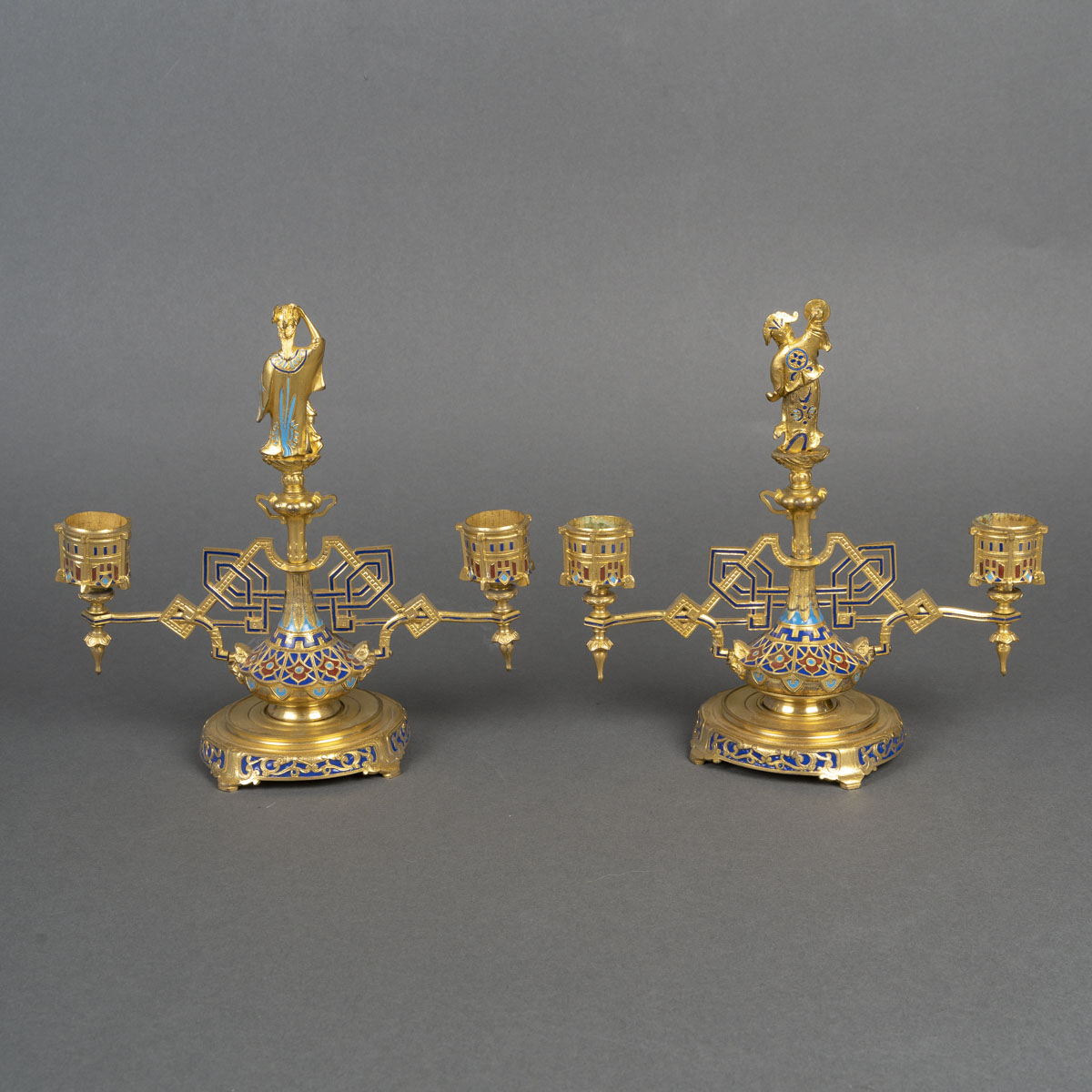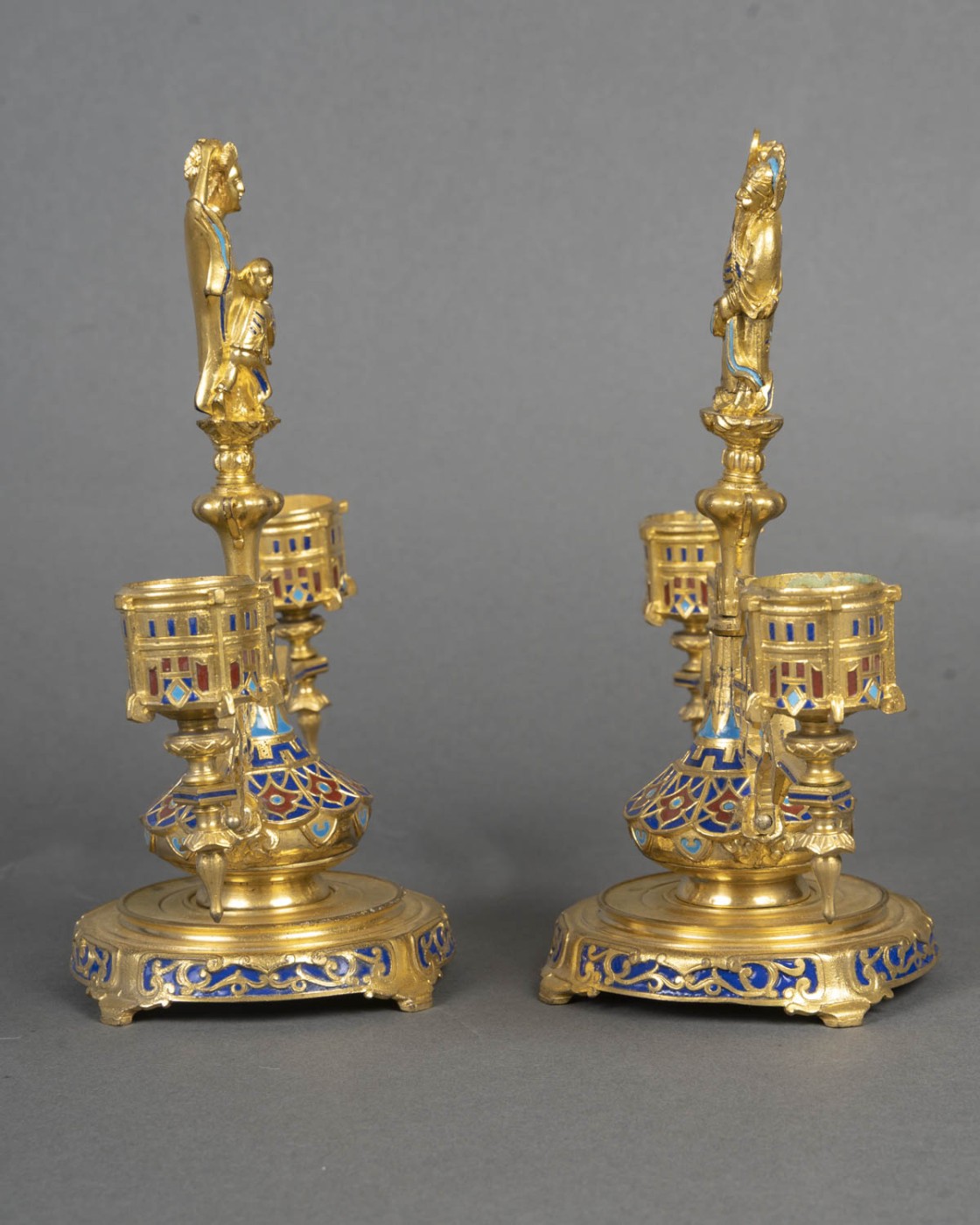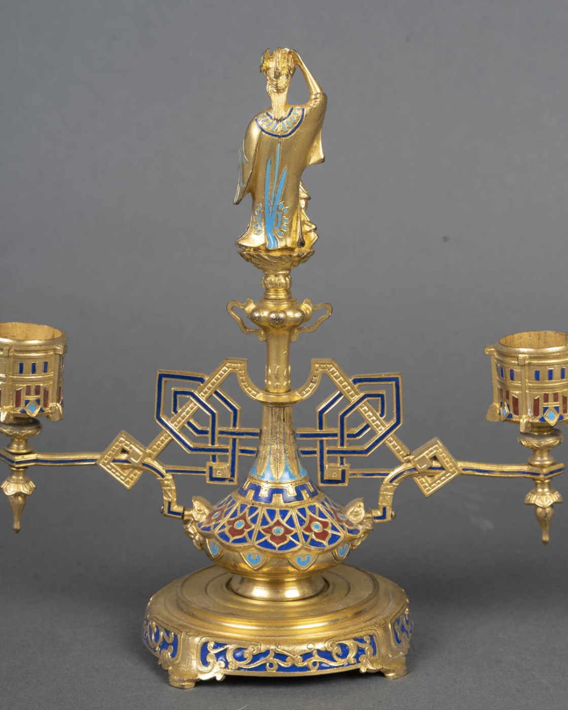 Paire de bougeoirs en bronze doré et émail à décor orientaliste. La base à décor d’une frise de volutes, le fut figurant un vase d’où s’échappent les binets, la partie haute sommée d’une figure d’un sage pour l’un et d’une femme pour l’autre. Le tout parcouru de motifs géométriques rehaussés d’émail.