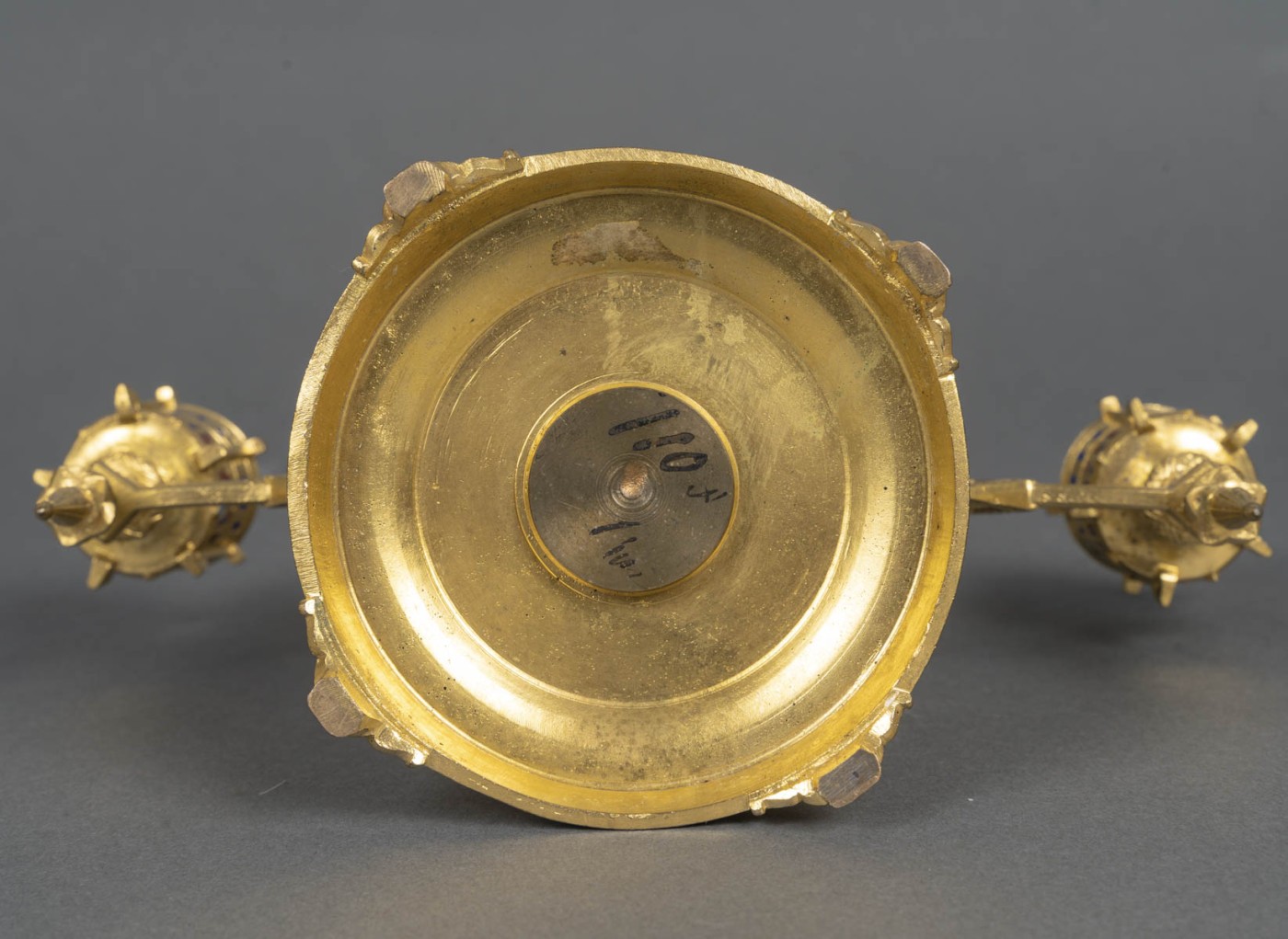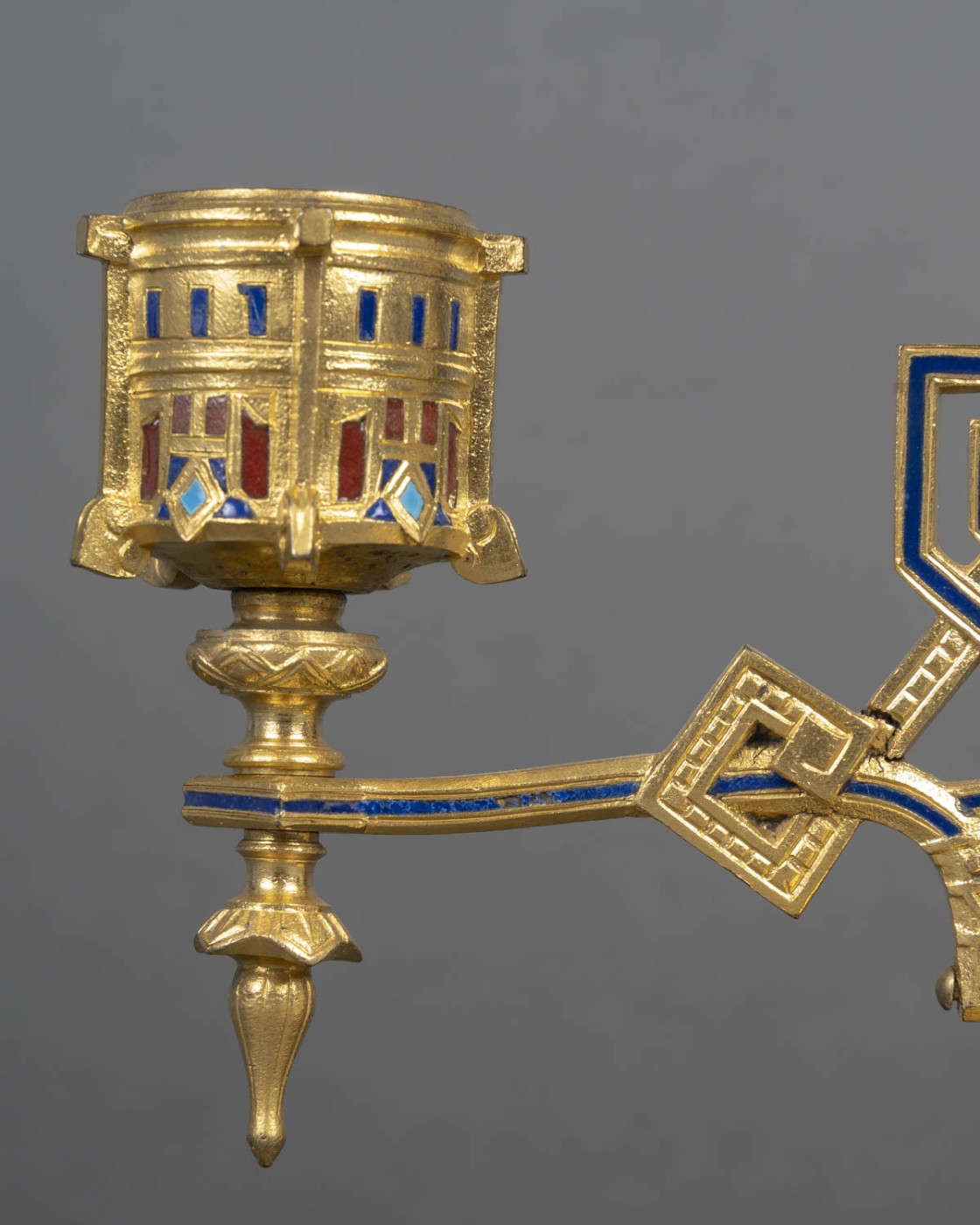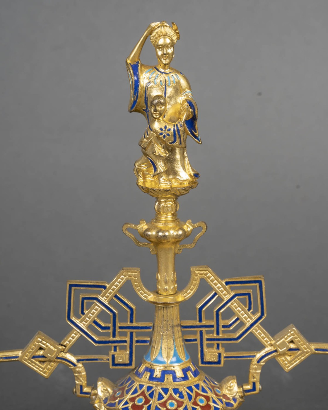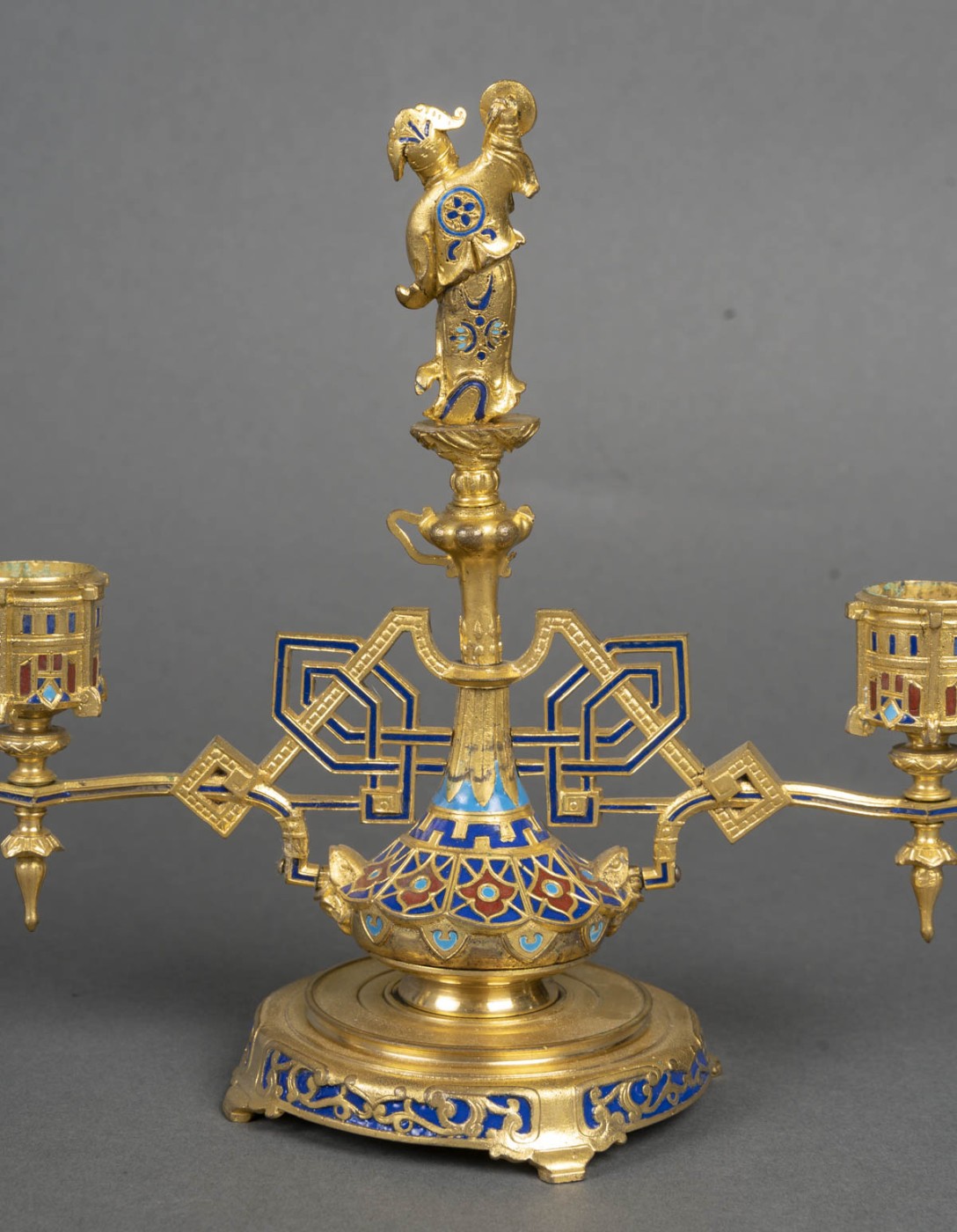 Paire de bougeoirs en bronze doré et émail à décor orientaliste. La base à décor d’une frise de volutes, le fut figurant un vase d’où s’échappent les binets, la partie haute sommée d’une figure d’un sage pour l’un et d’une femme pour l’autre. Le tout parcouru de motifs géométriques rehaussés d’émail.