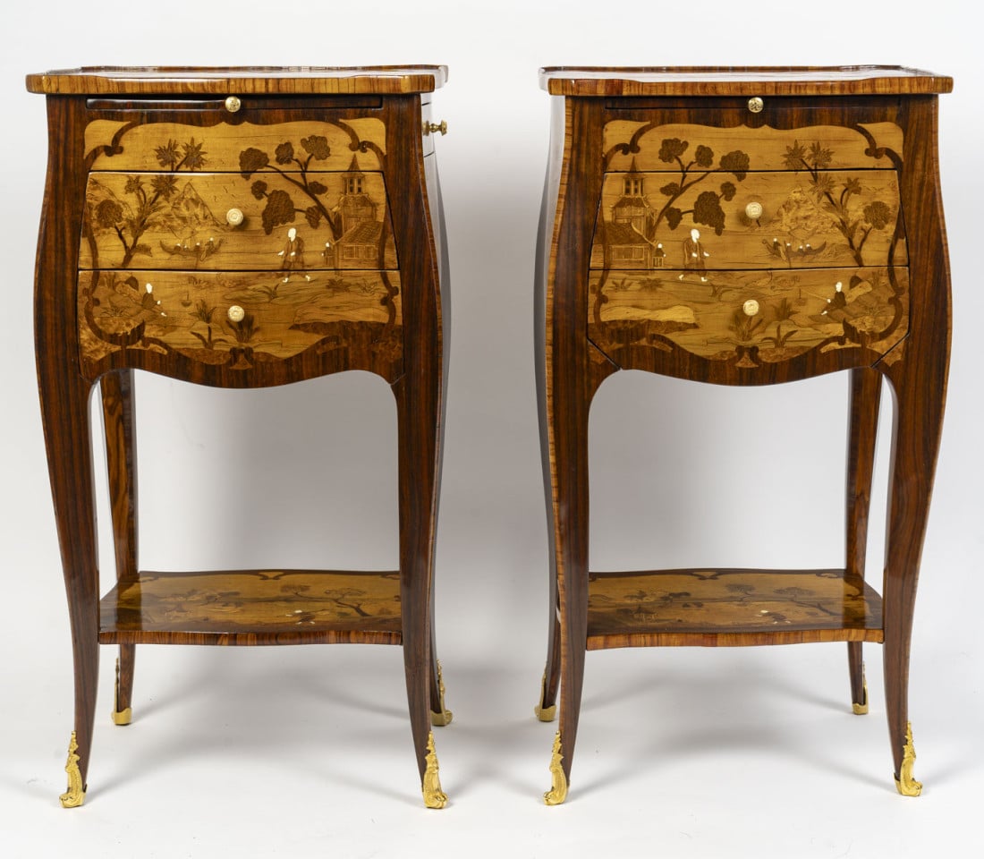 Paire de très belles et petites tables formant chevets en placage de marqueterie de satiné ouvrant par une tablette en ceinture avec son cuir d’époque, un tiroir latéral et deux en façade, les pieds cambrés réunis par une tablette d’entretoise. Décor sinisant toutes faces présentant des scènes de la vie courante dans des paysages lacustres avec pagodes. Boutons de tirage et sabots en bronze doré mat et bruni.