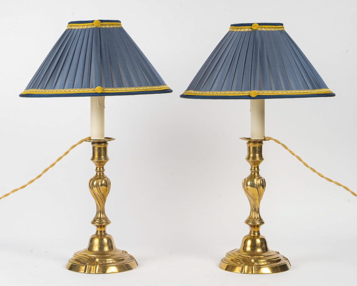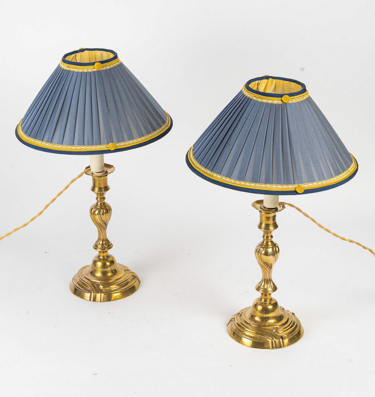 En très bon état de conservation, ces flambeaux conservent une belle dorure et ont été convertis en lampes. Ils sont parés de superbes abat-jours neufs en soie bleu à l’intérieur doré, ajoutant une touche de modernité à leur charme classique. L’électrification est conforme aux normes européennes et américaines, garantissant une utilisation sécurisée.