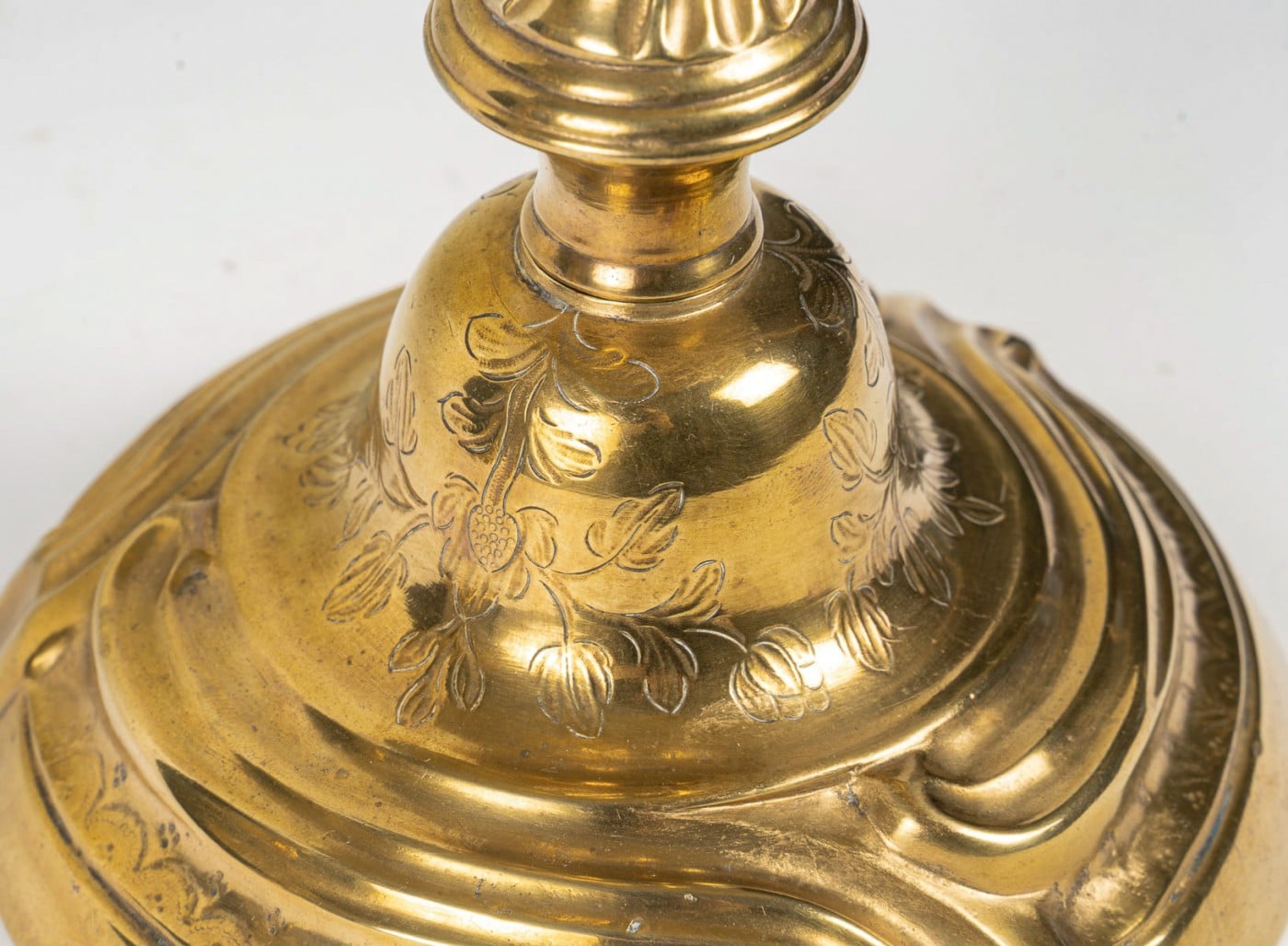 This elegant pair of gilt bronze candlesticks is distinguished by its refinement and craftsmanship. Finely chiseled, they feature rich classical Louis XV style motifs, showcasing remarkable artisanal skill.