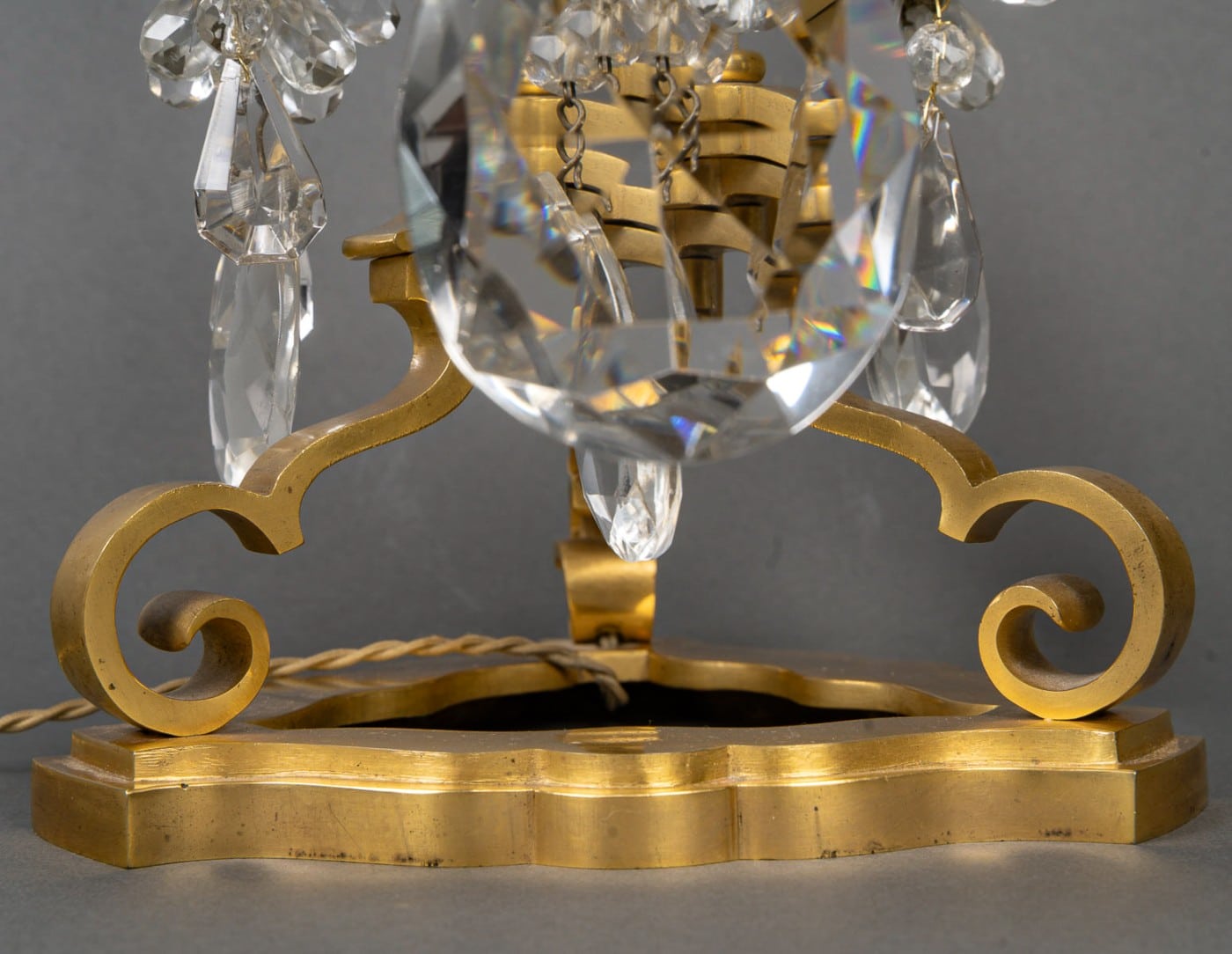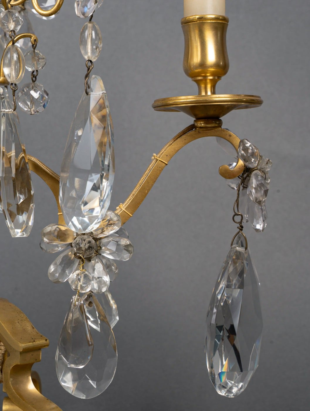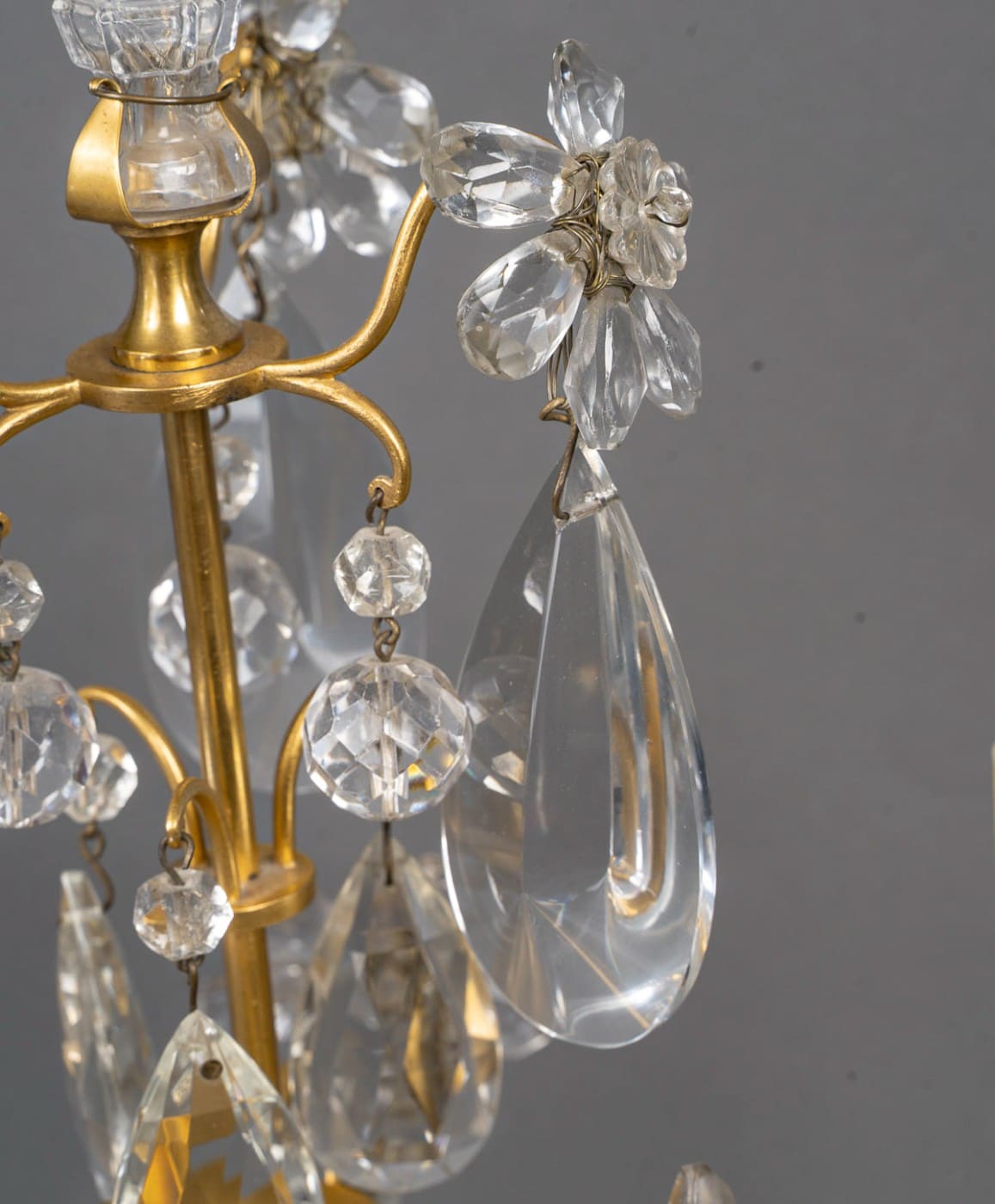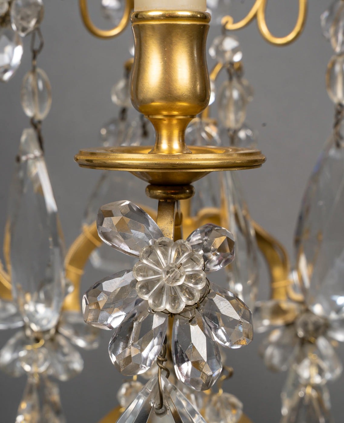 An elegant and decorative pair of Louis XV-style girandoles in gilt bronze, retaining their original gilding and featuring three candle arms adorned with « Grand Siècle » wax candles. The girandoles rest on a substantial gilt bronze base. They are beautifully embellished with cut-crystal elements, including large crystals, half-pears, and floral motifs, with the upper section crowned by a cut-crystal dagger finial.
