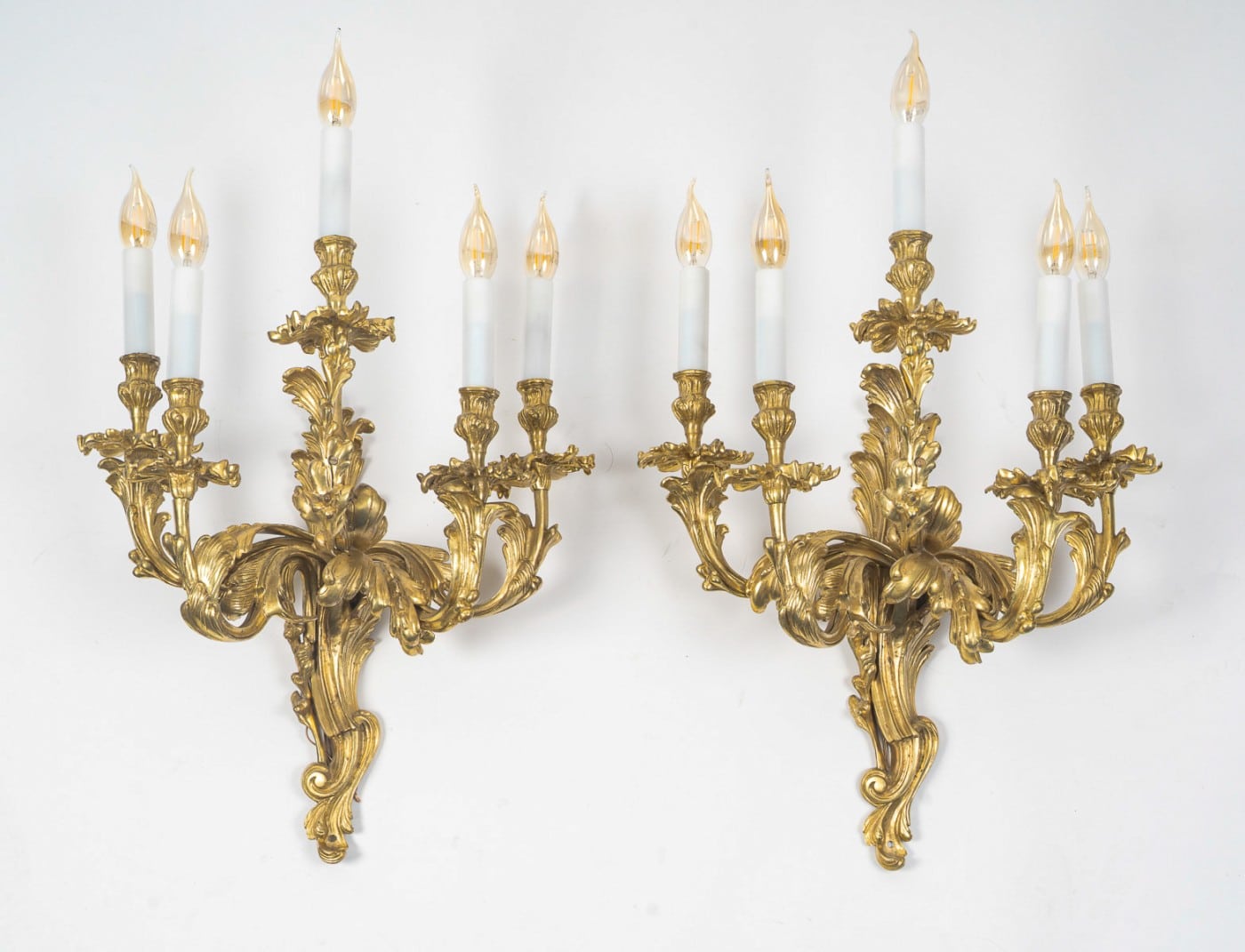 A Large Pair of Louis XV-Style Five-Light Wall Sconces in Gilt Bronze, c. 1890–1900