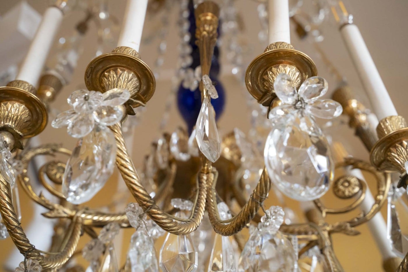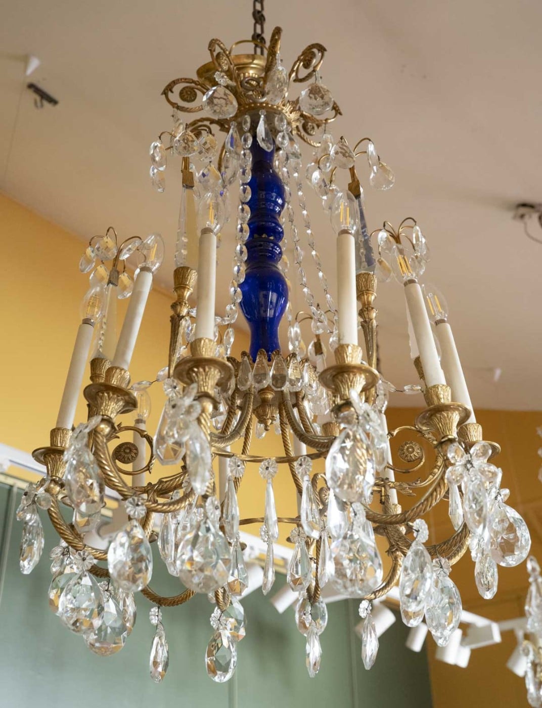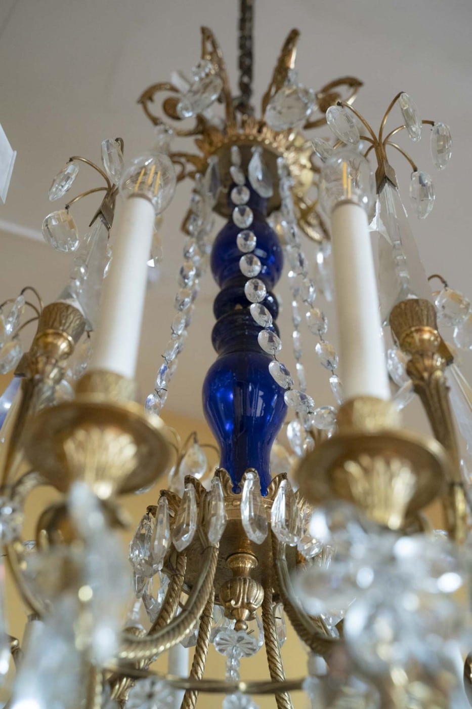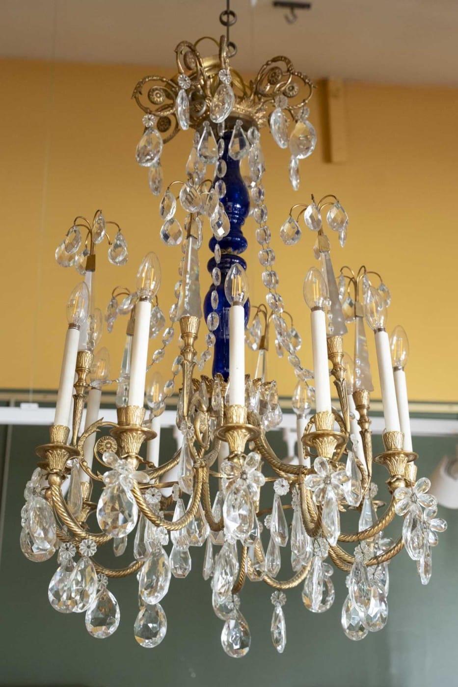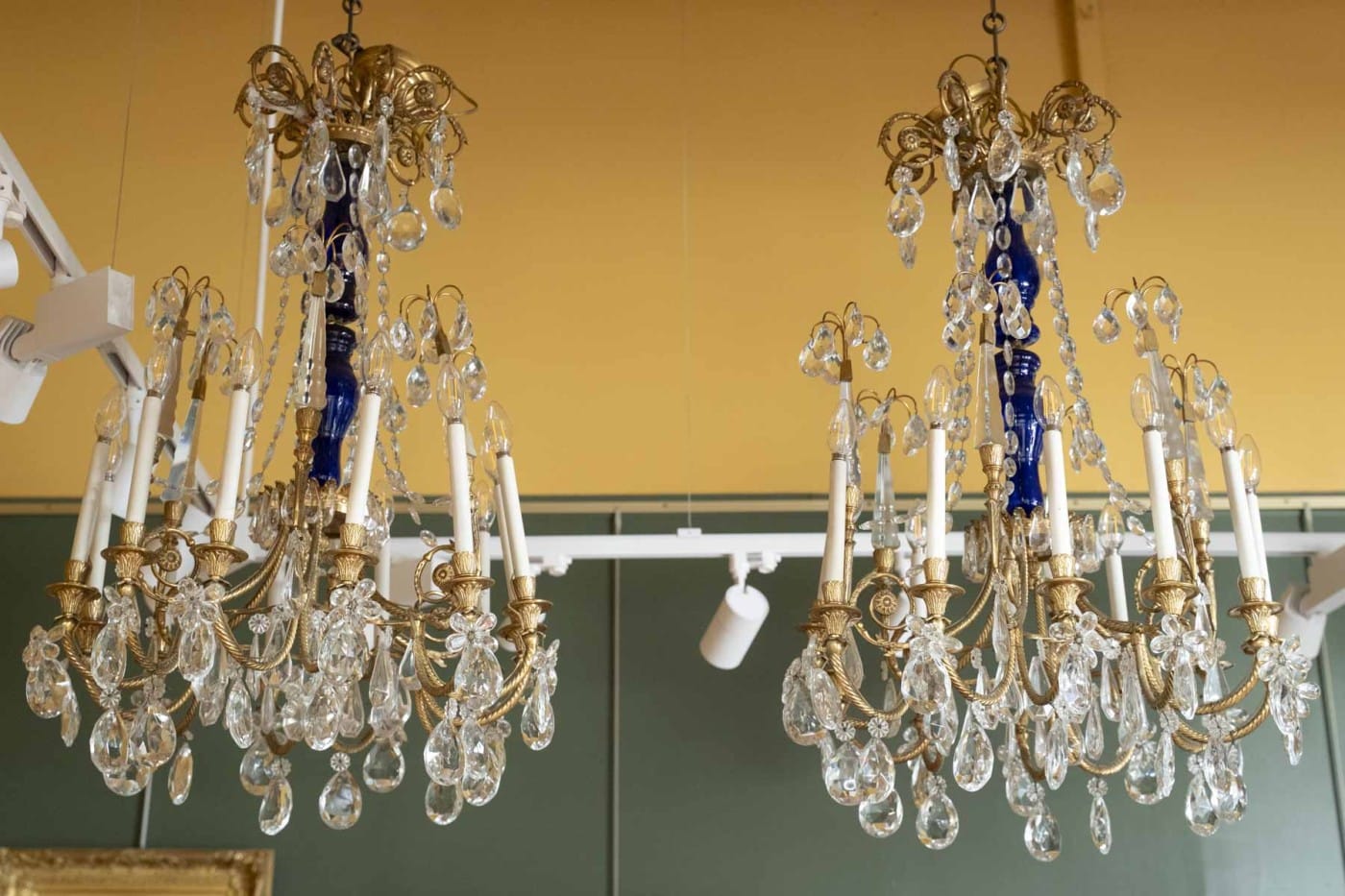 Composés d’un fut central de forme balustre en verre bleu surmonté d’une couronne. Ils éclairent par 12 bras de lumière et sont garnis de quatre poignards en cristal taillé portant un plumet. L’ensemble orné de guirlandes de perles, de fleurs et de pampilles en cristal taillé
