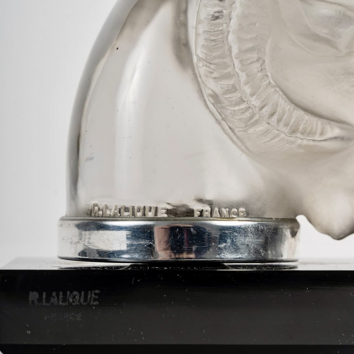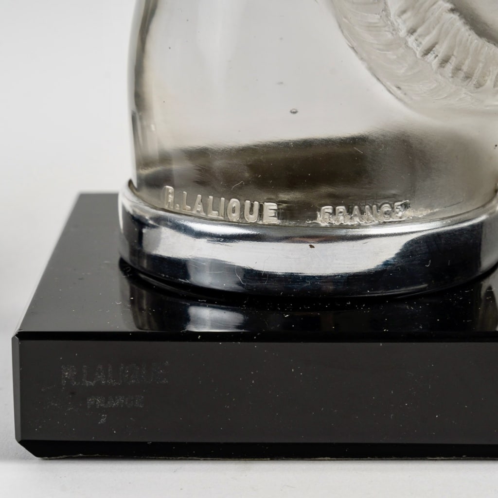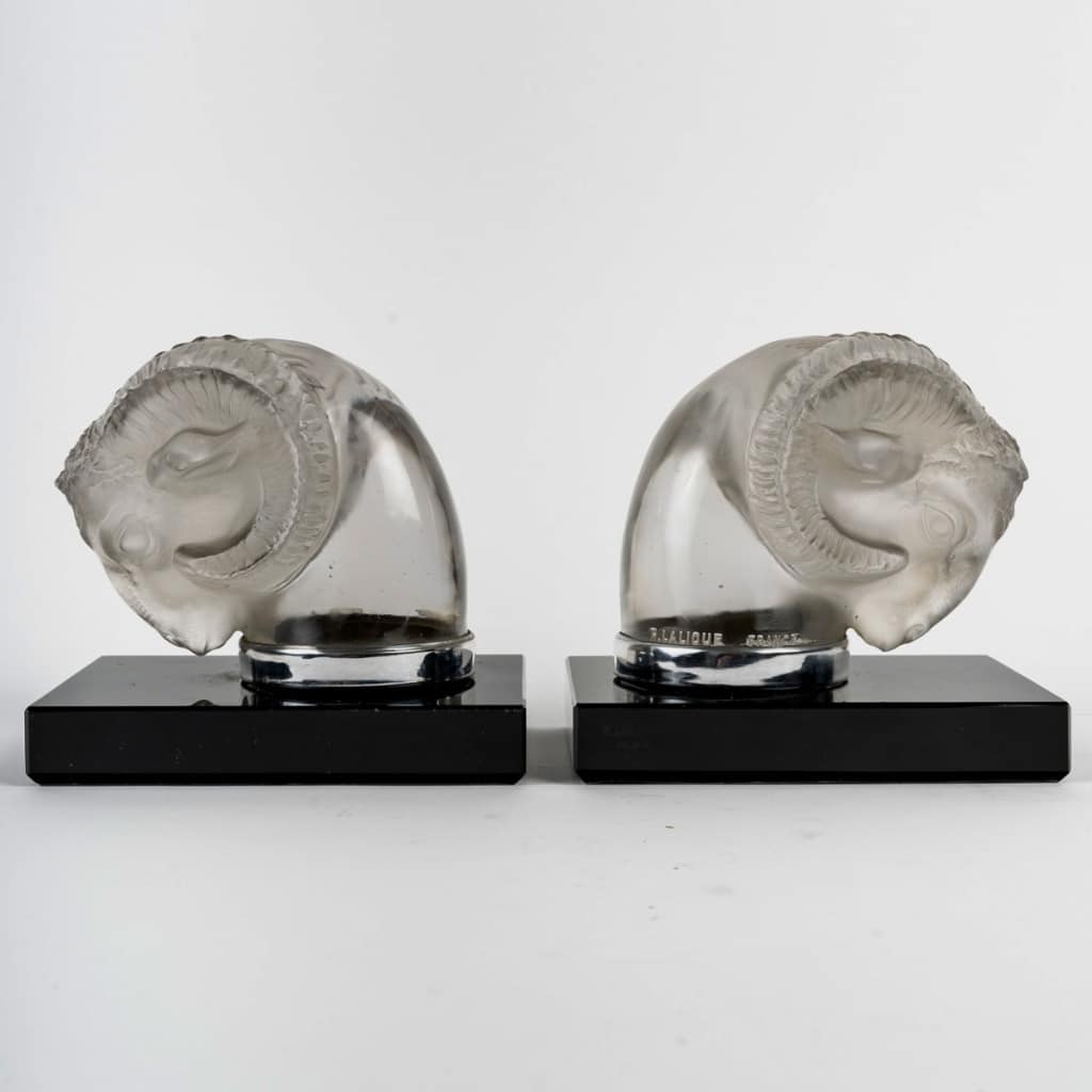 Paire de Mascottes Serre-Livres « Tête de Bélier » verre blanc sur socle verre opalin noir de René Lalique créé en 1928.