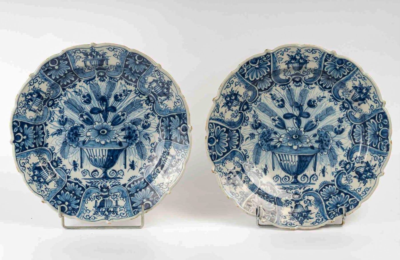 This rare pair of tin-glazed Delft faience plates features a deep blue monochrome floral design, centered on a large vase with a bouquet of flowers, foliage, and insects.