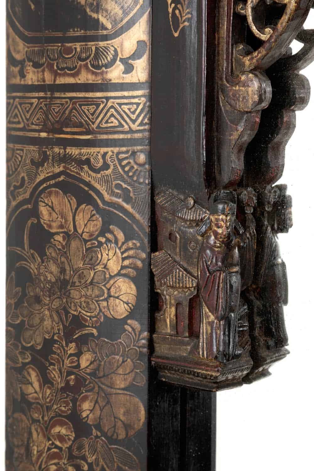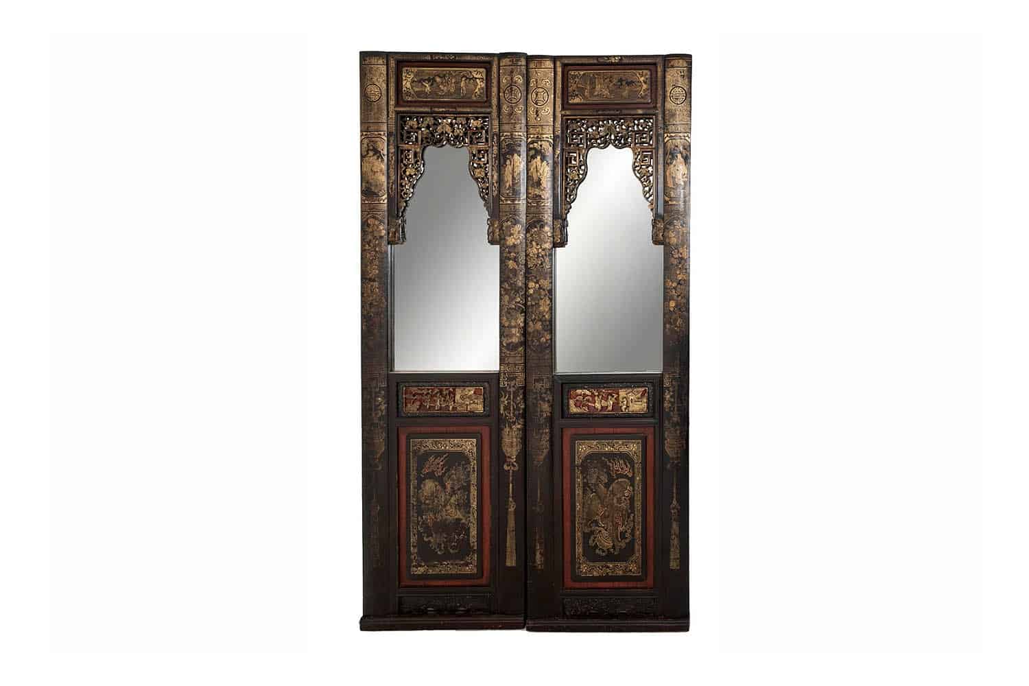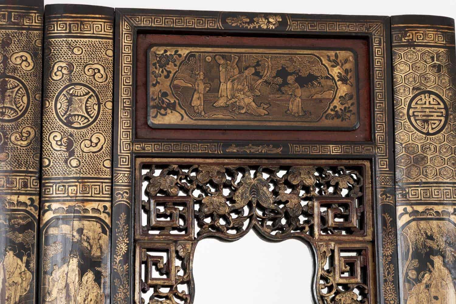 Le haut des portes est constitué d’un miroir encadré d’un décor ajouré en bois sculpté de motifs géométriques, fleurs et feuillages, papillon, pagodes et personnages. Il est encadré à l’or de fleurs et frises de grecques et surmonté d’un encadrement mouluré décoré à l’or d’un grand cartouche au centre duquel est représentée une scène impériale avec l’empereur d’un côté et l’impératrice de l’autre, entourés chacun de trois serviteurs.