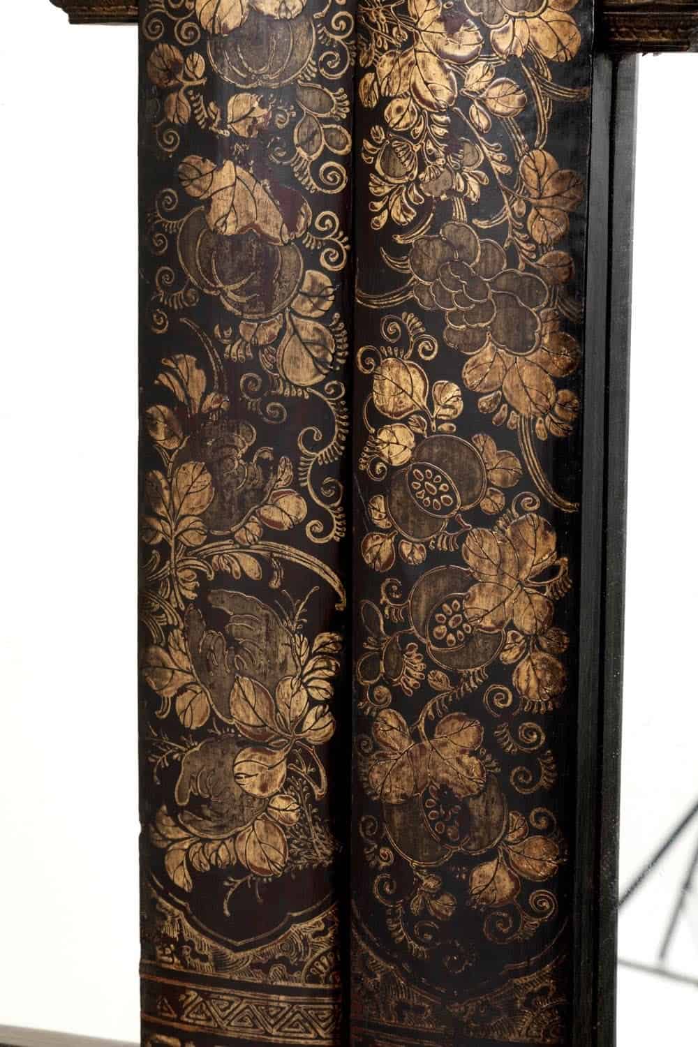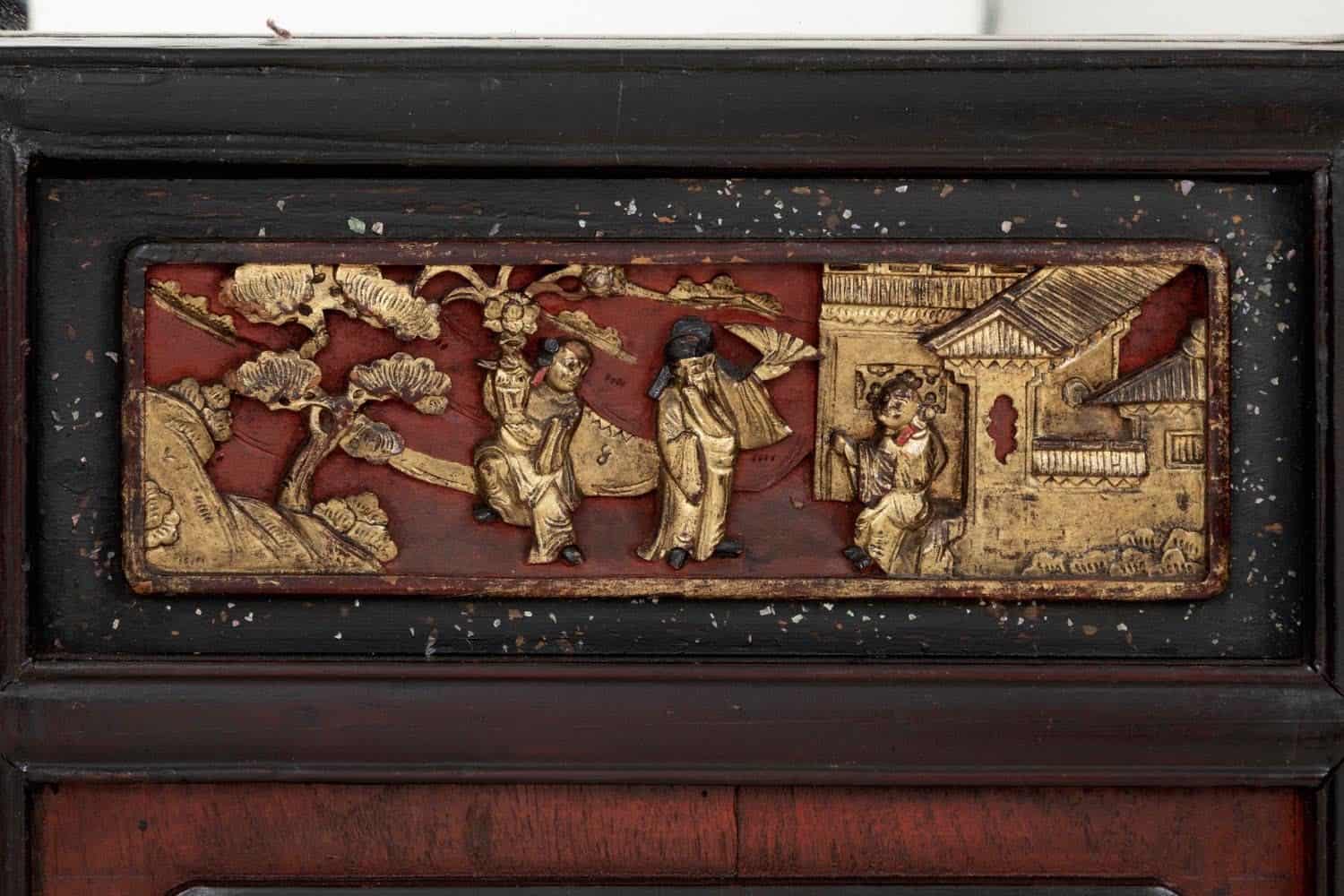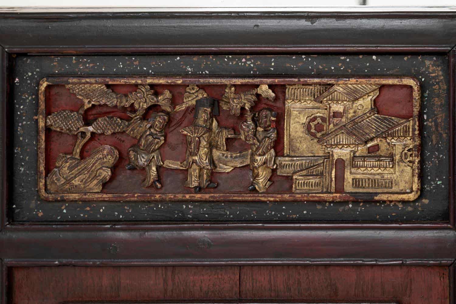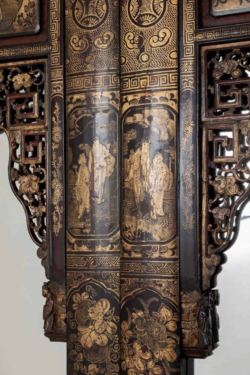 Le haut des portes est constitué d’un miroir encadré d’un décor ajouré en bois sculpté de motifs géométriques, fleurs et feuillages, papillon, pagodes et personnages. Il est encadré à l’or de fleurs et frises de grecques et surmonté d’un encadrement mouluré décoré à l’or d’un grand cartouche au centre duquel est représentée une scène impériale avec l’empereur d’un côté et l’impératrice de l’autre, entourés chacun de trois serviteurs.