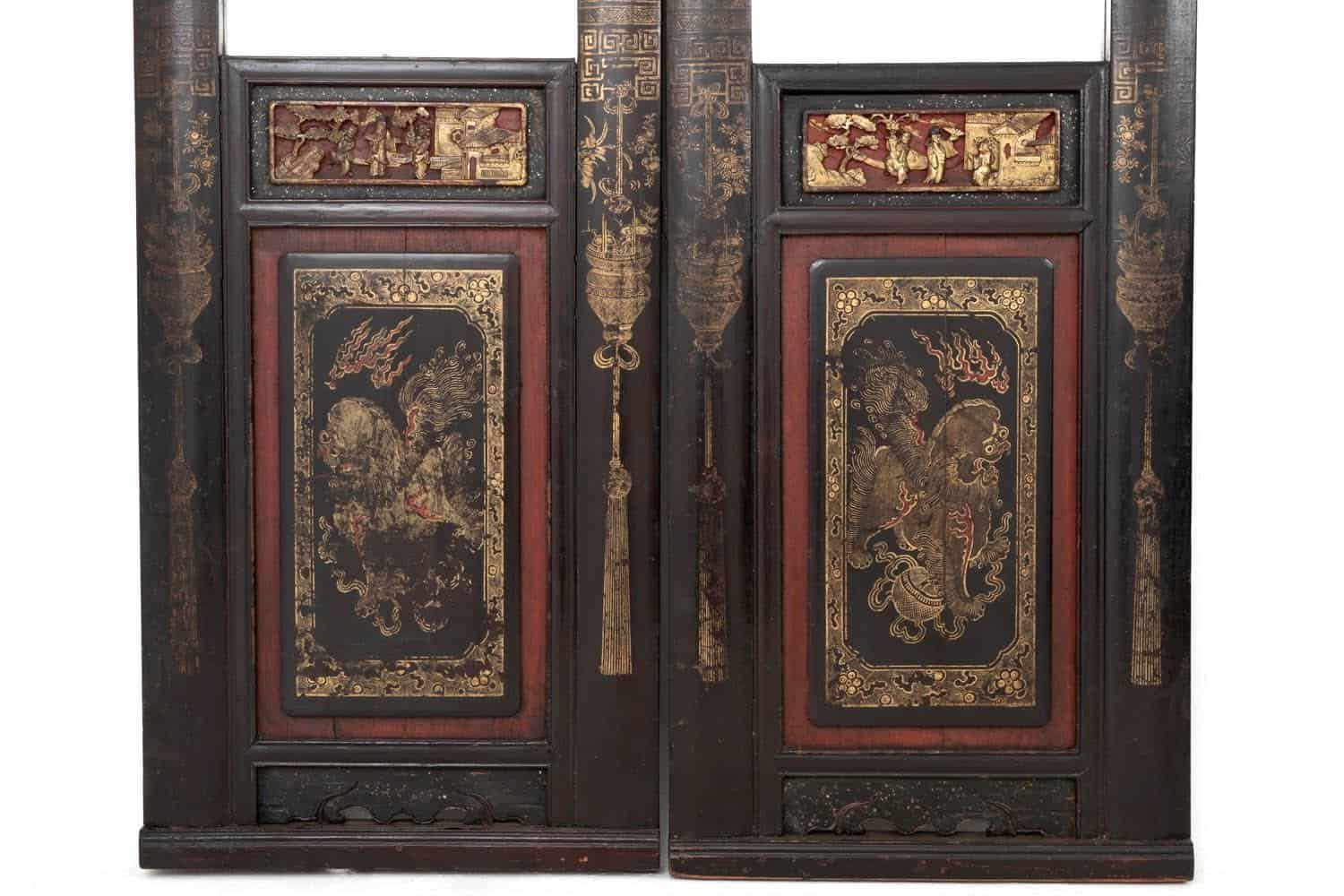 Paire de portes en laque brune à décor chinoisant rouge et or. Portes flanquées de montants moulurés et bas de porte organisé en trois compartiments: celui du bas à bord inférieur mouvementé ; celui du milieu encadré de bois laqué rouge représentant au centre un cadre à motifs floraux à l’or dans lequel s’inscrit un lion asiatique enflammé rouge et or posant sa patte sur un globe – représentant sûrement le lion gardien chinois mâle, qui dans un contexte impérial représente la suprématie de l’Empereur sur le monde ; et celui du haut est un bas-relief à fond rouge à décor doré de scène de cour dans des jardins, à côté d’un palais, avec trois personnages asiatiques.