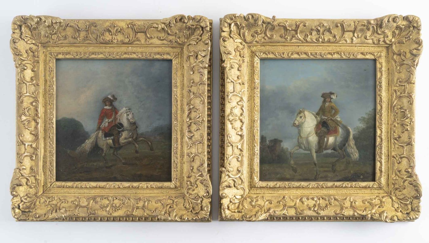Paire de portraits de cavaliers sur leur monture.
