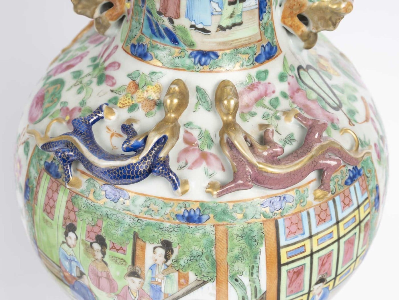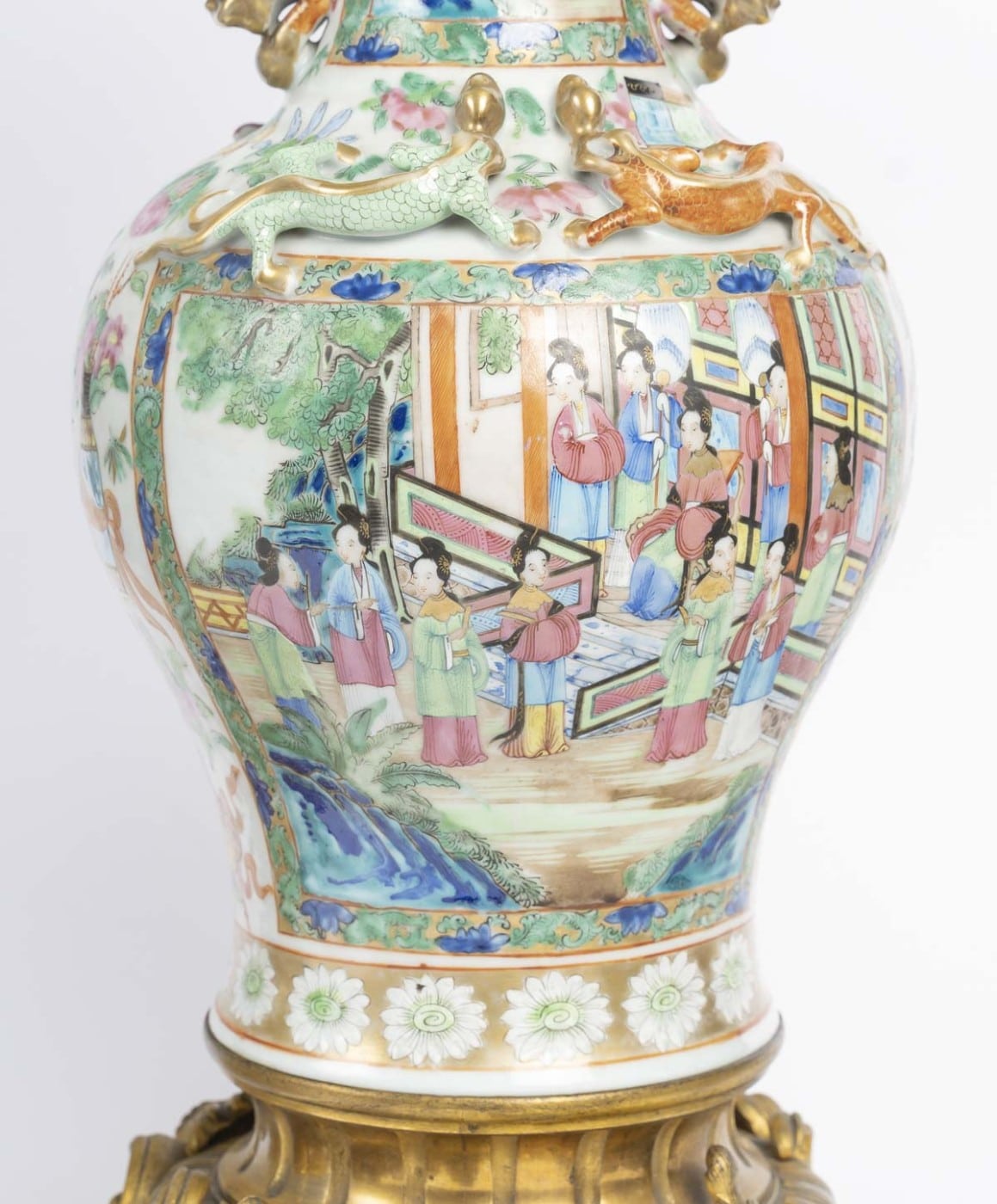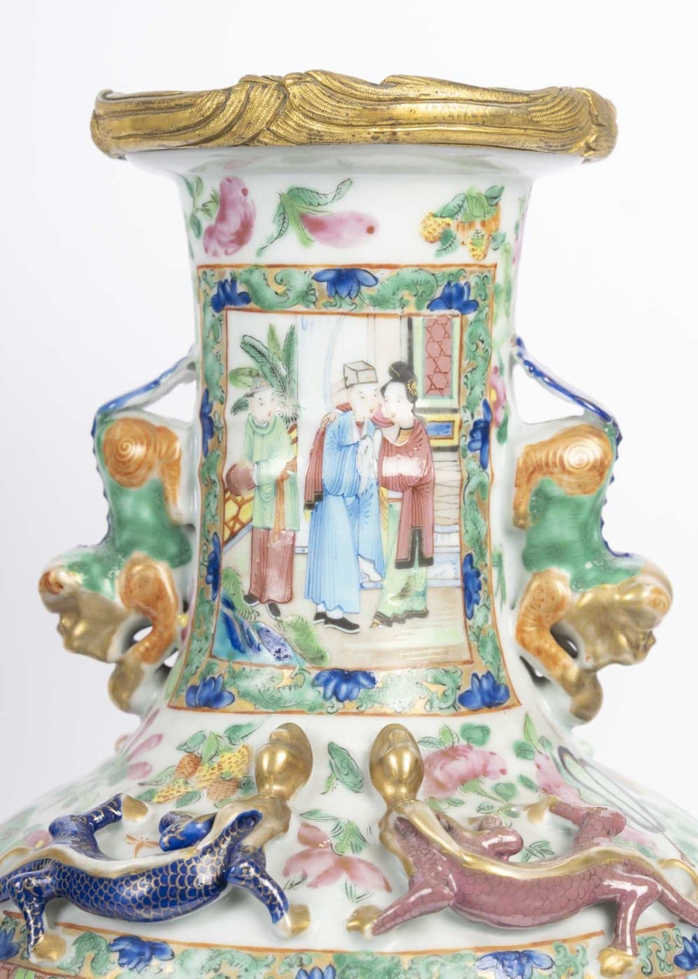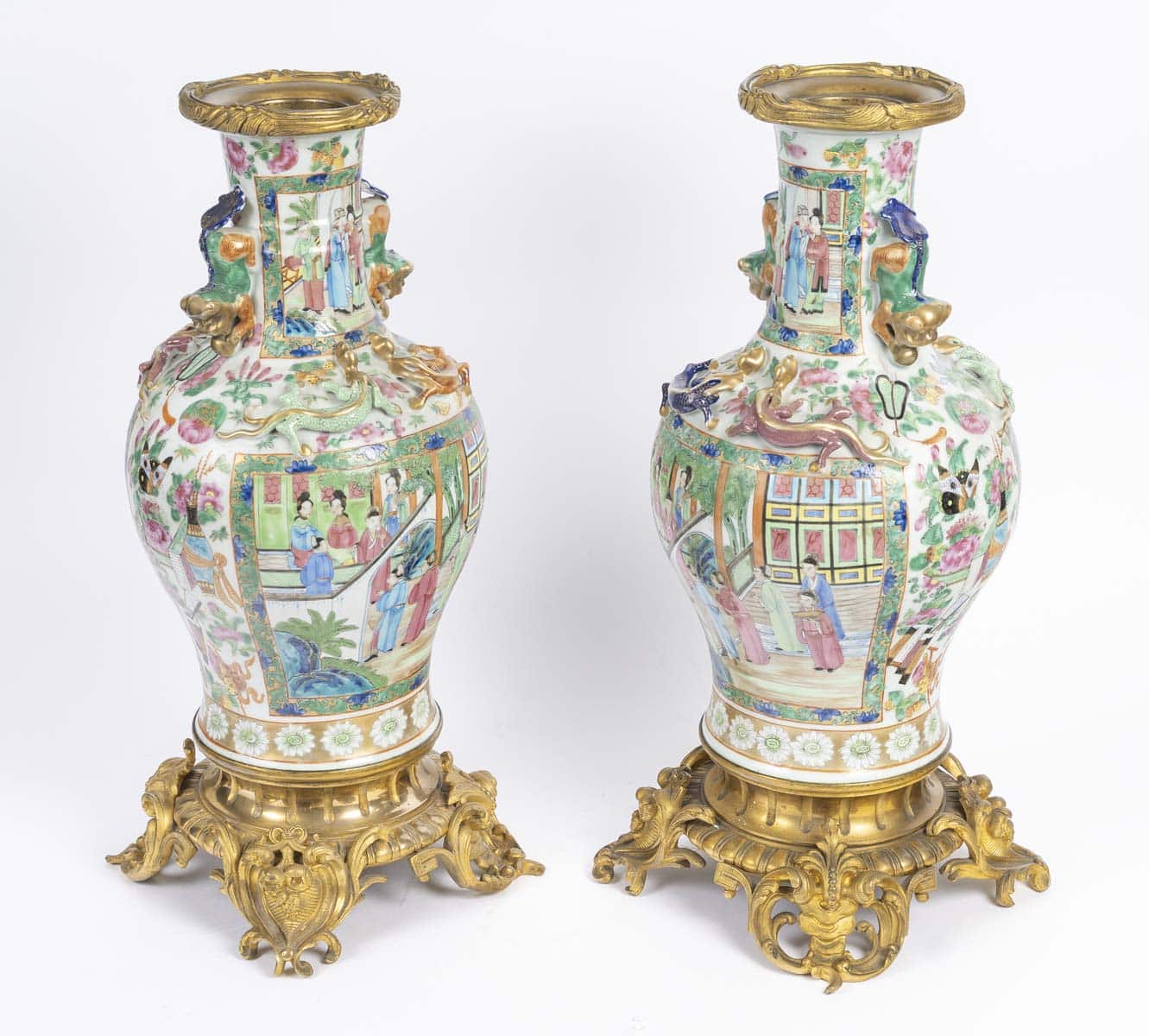 Grande paire de vases en porcelaine de Canton du XIXème siècle. Merveilleux décor riche en couleurs et aux motifs en relief de chiens de Fo, de reptiles et de formes géométriques. Des scènes de la vie de cour sont peints dans des réserves sur fond de paysage. Ils reposent sur des socles en bronze ciselés de fruits et de feuillage.
