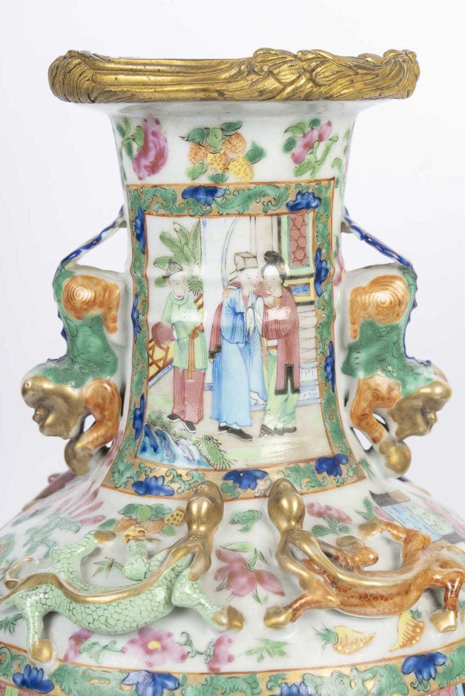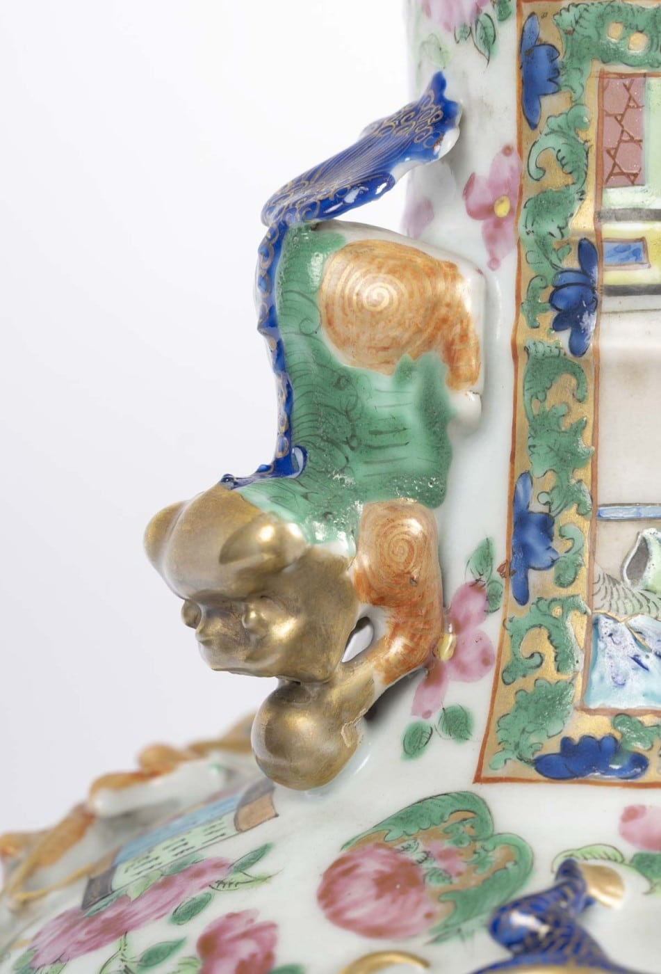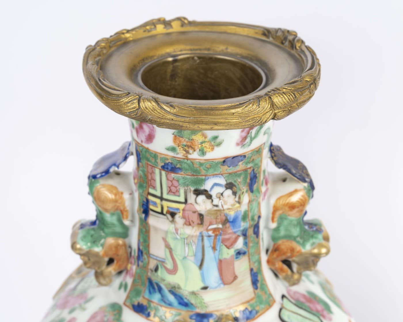 Grande paire de vases en porcelaine de Canton du XIXème siècle. Merveilleux décor riche en couleurs et aux motifs en relief de chiens de Fo, de reptiles et de formes géométriques. Des scènes de la vie de cour sont peints dans des réserves sur fond de paysage. Ils reposent sur des socles en bronze ciselés de fruits et de feuillage.