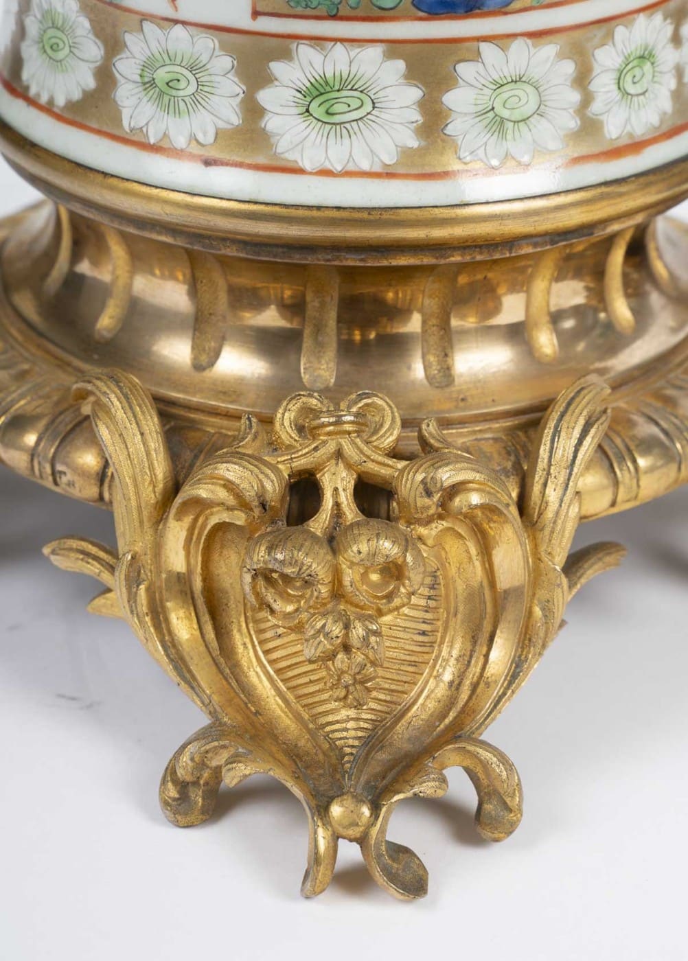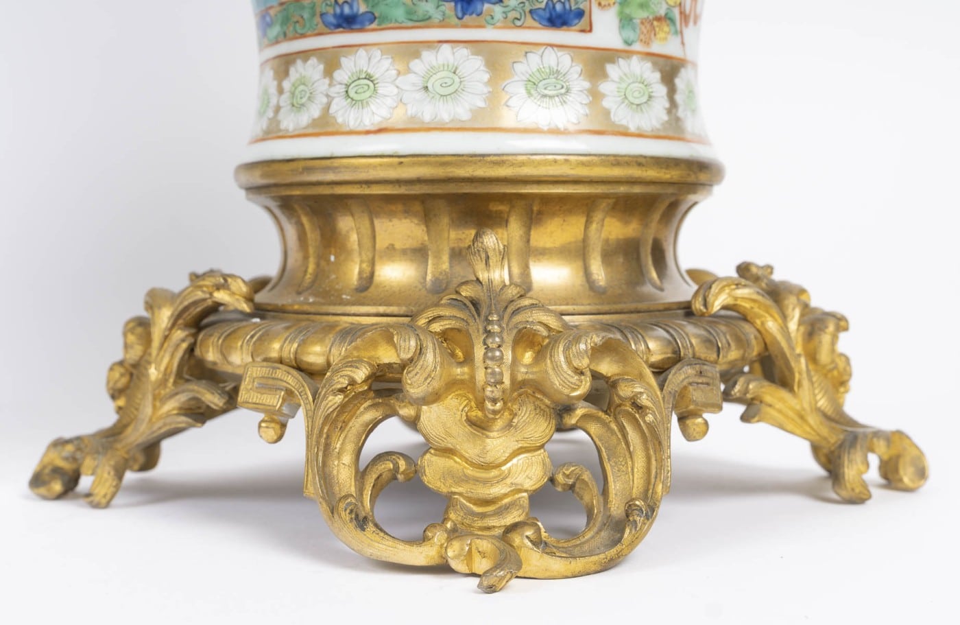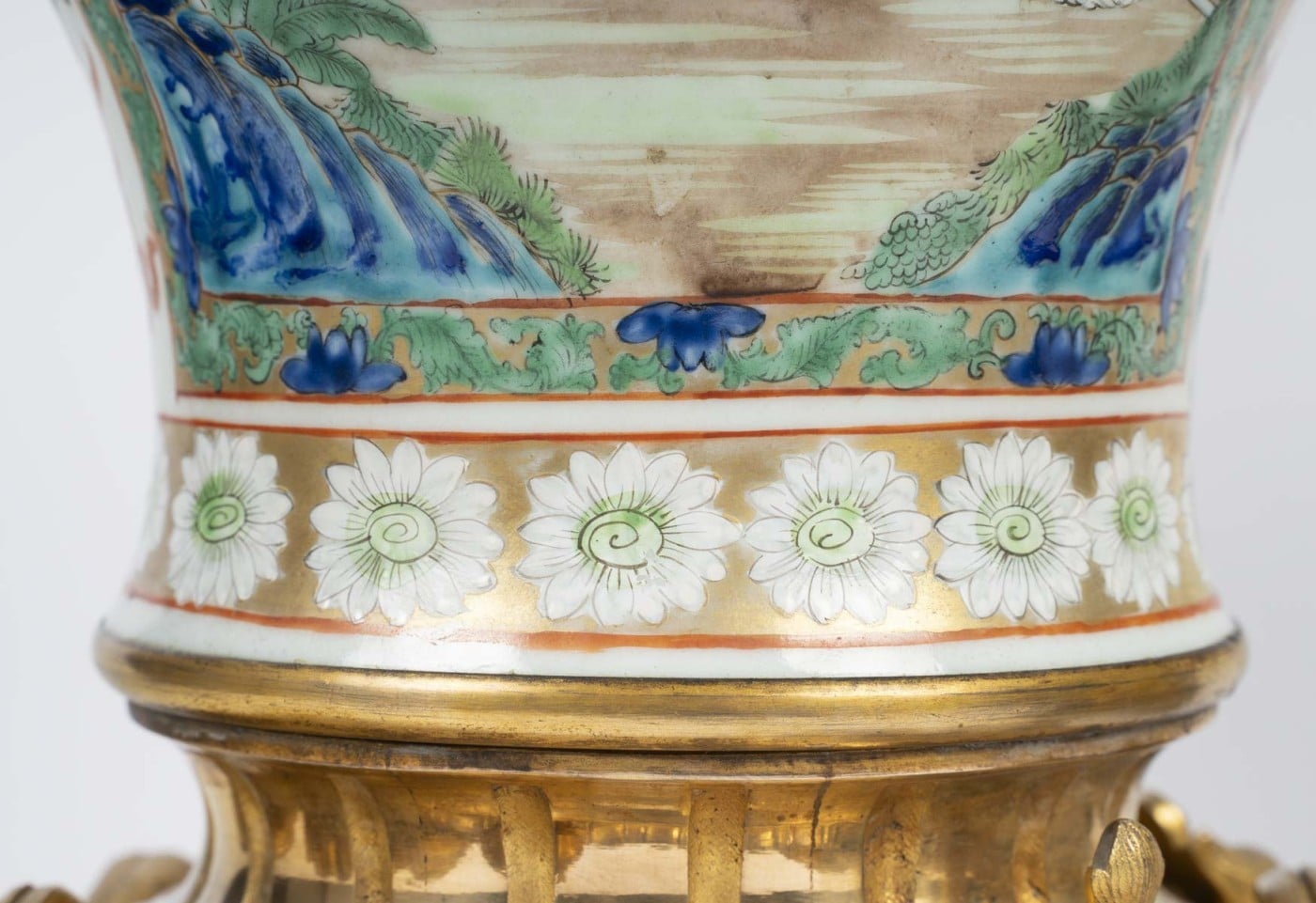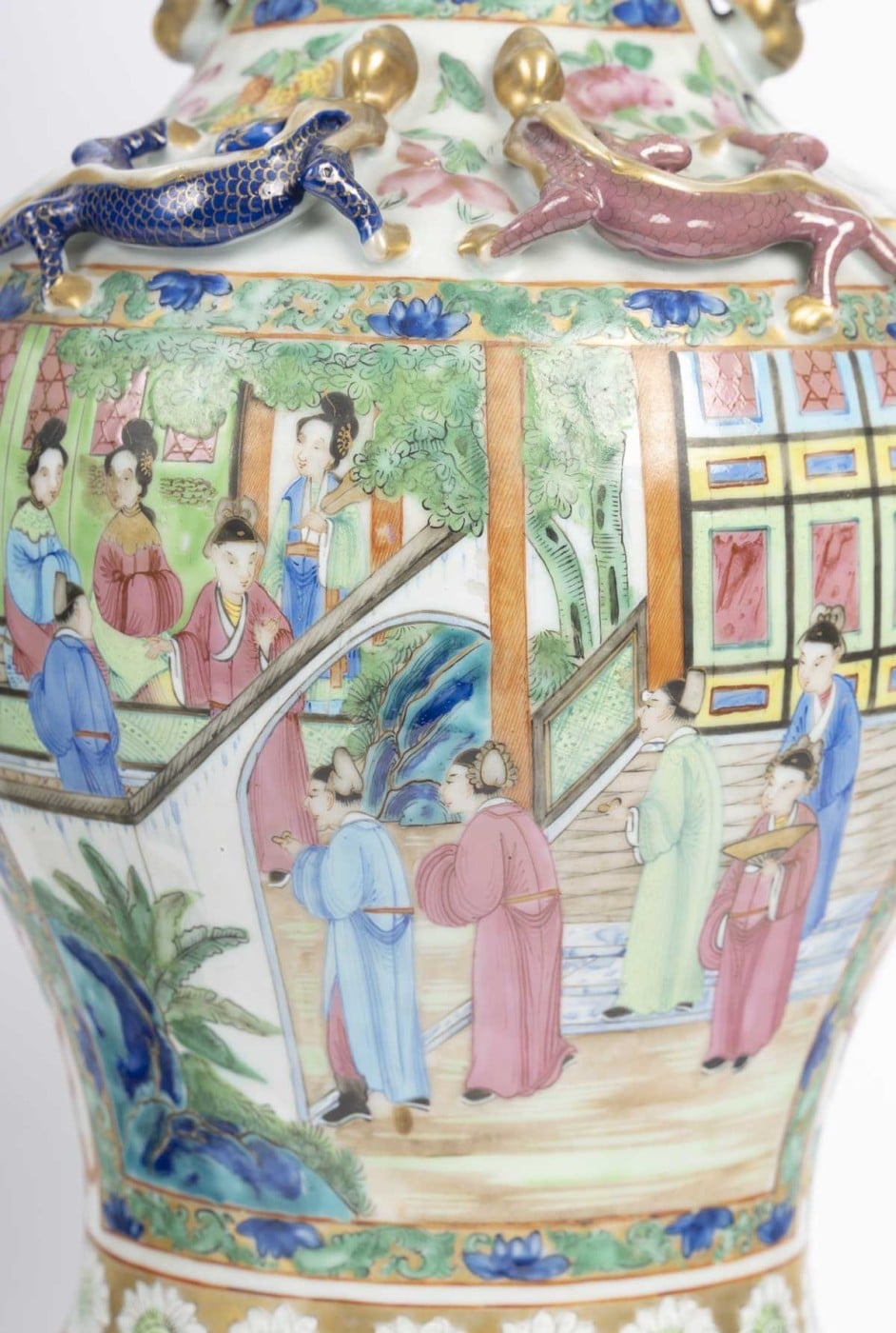 Grande paire de vases en porcelaine de Canton du XIXème siècle. Merveilleux décor riche en couleurs et aux motifs en relief de chiens de Fo, de reptiles et de formes géométriques. Des scènes de la vie de cour sont peints dans des réserves sur fond de paysage. Ils reposent sur des socles en bronze ciselés de fruits et de feuillage.