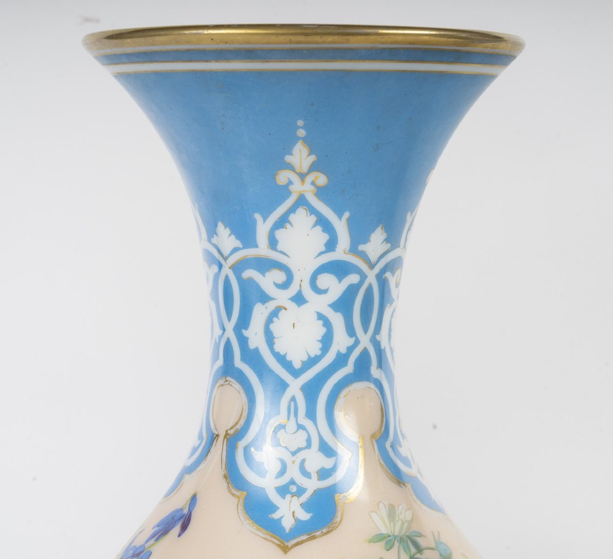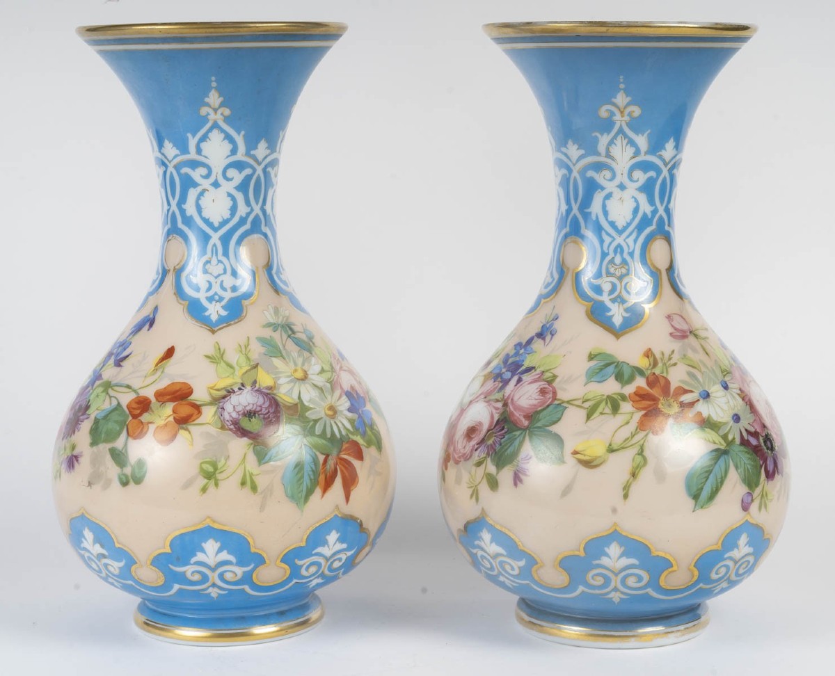 Charmante paire de vases en opaline à fond bleu céleste, ornée d’un élégant décor or et blanc de rinceaux et motifs d’inspiration Louis XV.