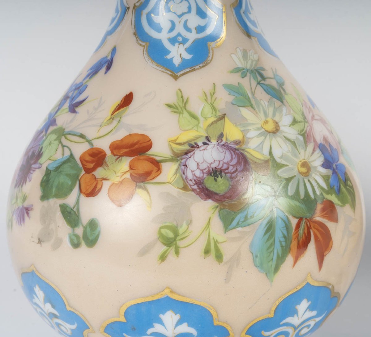 La panse est enrichie d’un délicat décor floral polychrome peint à la main, typique des productions décoratives du XIXe siècle / époque Napoléon III.