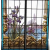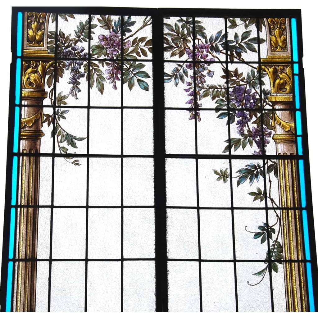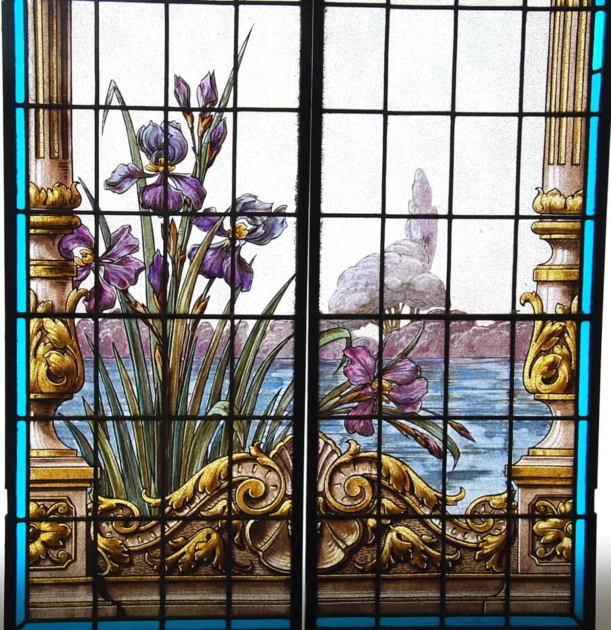 – Paire de vitraux aux Iris peint en grisaille et aux émaux sur verre translucide craquelé représentant au premier plan des iris avec un plan d’eau dans le fond et une glycine dans le haut. L’ensemble de ce décor est entouré de part et d’autre de demi-colonne.