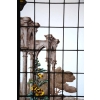 Paire de vitraux en verres cathédrale incolores peints à la grisaille et à l’émail représentant un paysage architecturé orné d’une rose trémière et d’une vigne vierge.