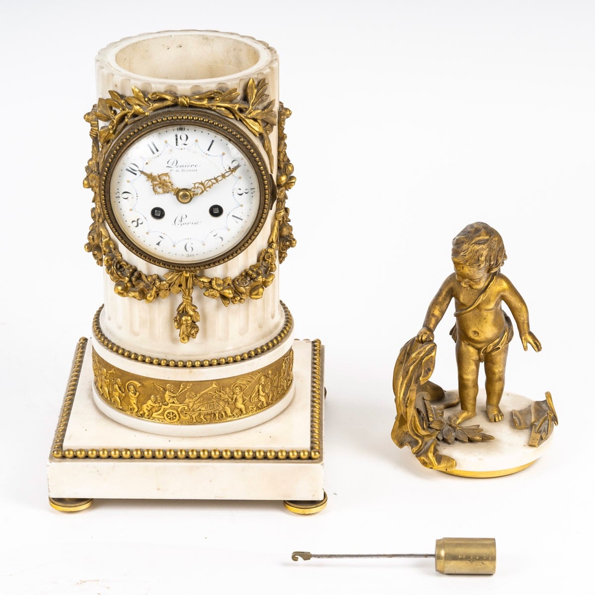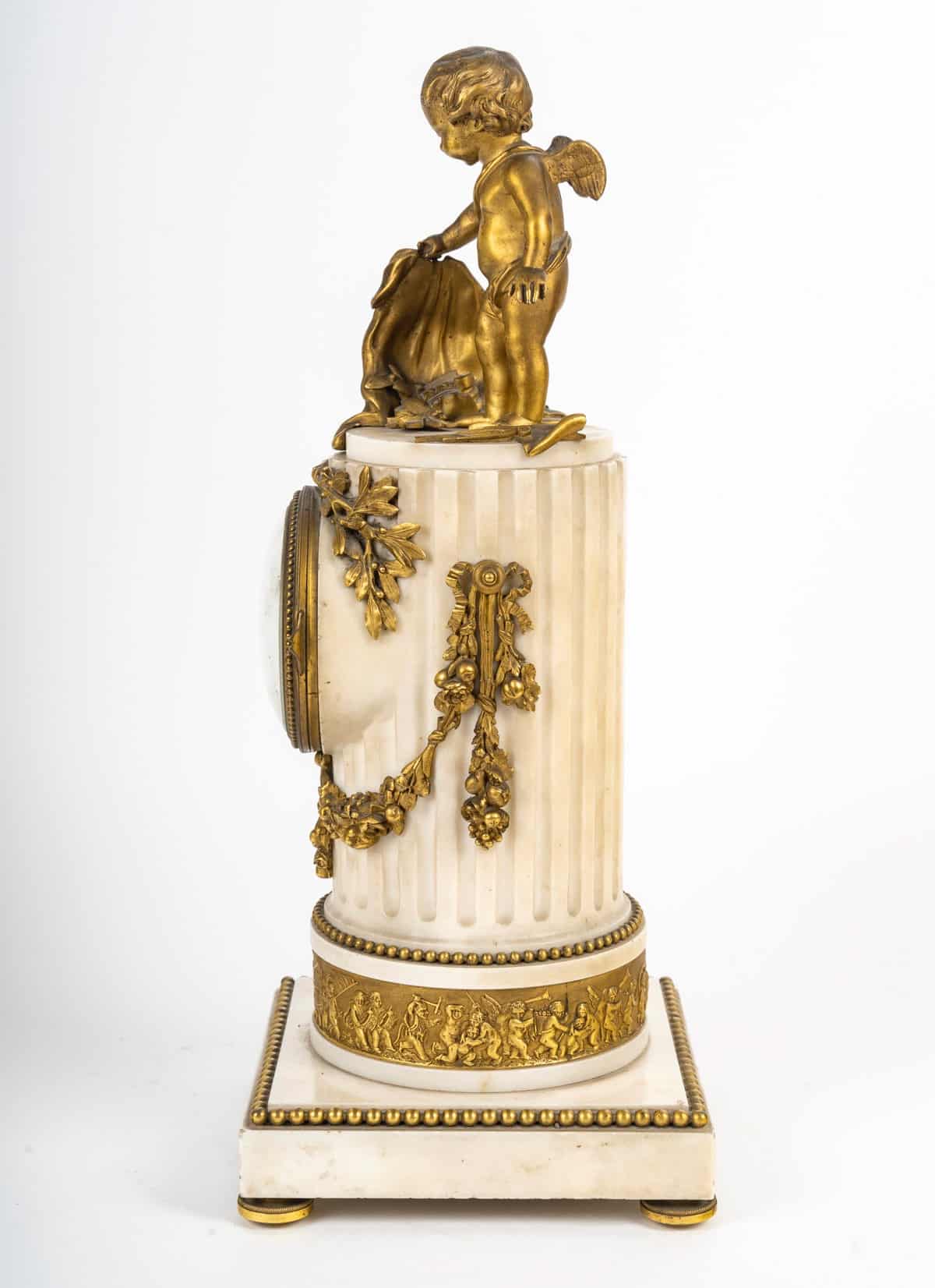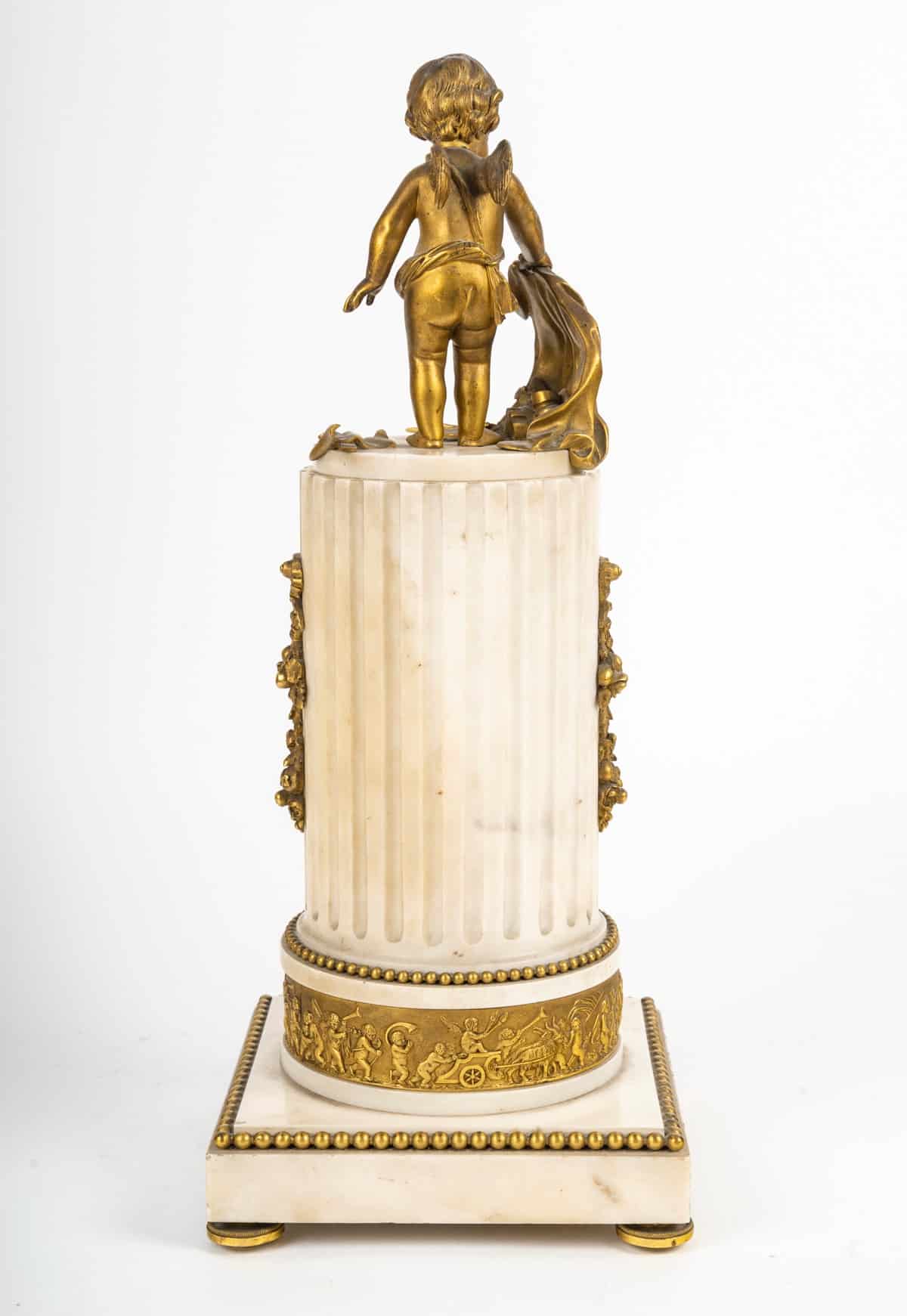 En forme de colonne cannelée, le cadran circulaire en émail avec des chapitres arabes et des aiguilles en métal doré en forme de lyre et de fleur de lys percées dans une lunette torsa-dée et une porte vitrée entourée de guirlandes de laurier et de feuillages, surmontée d’un putto, la base de la colonne avec un bas-relief de putti jouant, sur un socle carré perlé et des pieds tournés.