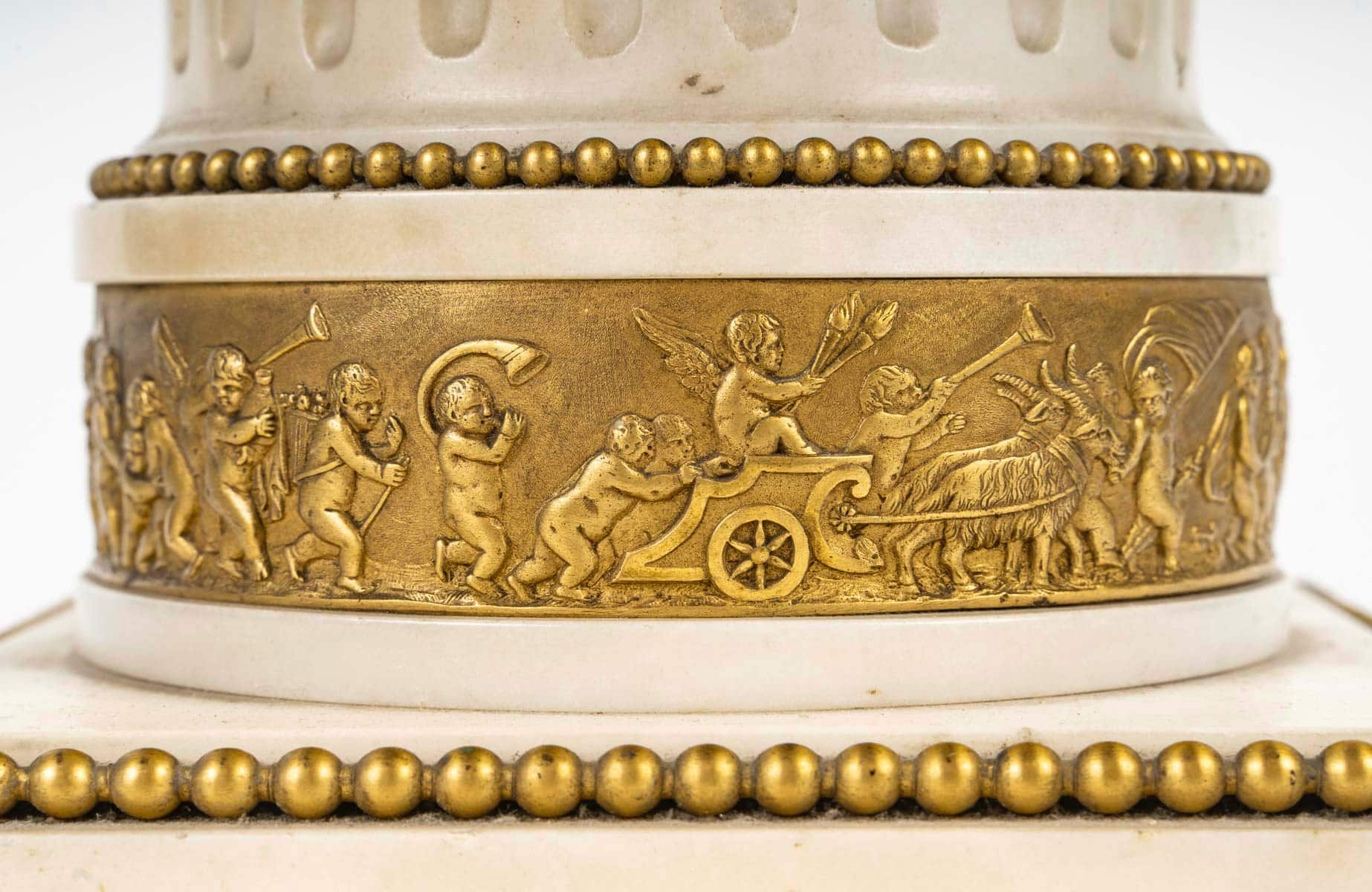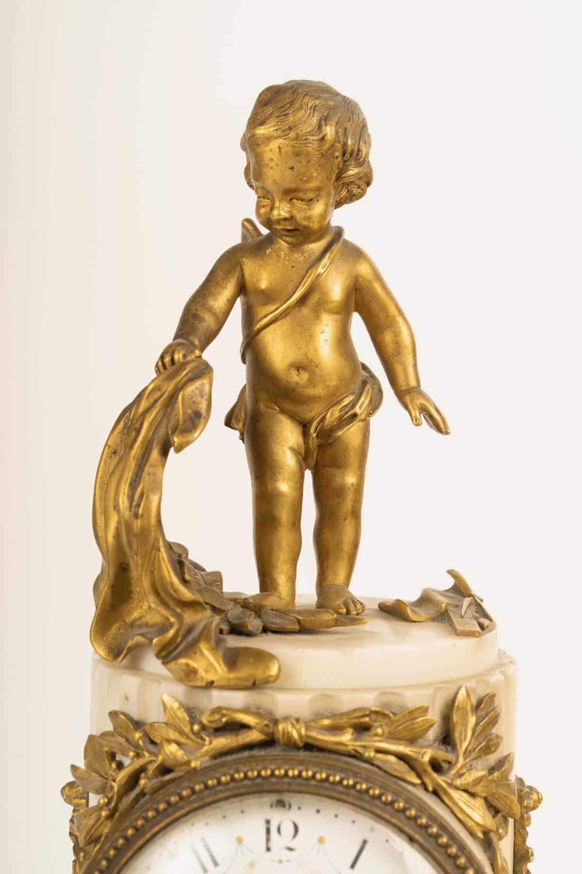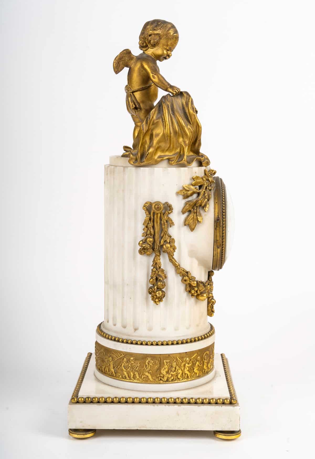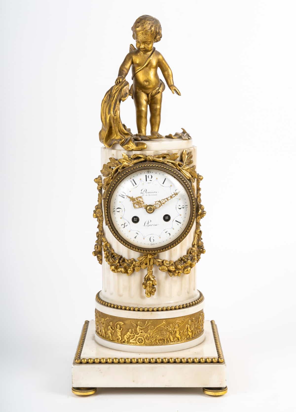 En forme de colonne cannelée, le cadran circulaire en émail avec des chapitres arabes et des aiguilles en métal doré en forme de lyre et de fleur de lys percées dans une lunette torsa-dée et une porte vitrée entourée de guirlandes de laurier et de feuillages, surmontée d’un putto, la base de la colonne avec un bas-relief de putti jouant, sur un socle carré perlé et des pieds tournés.