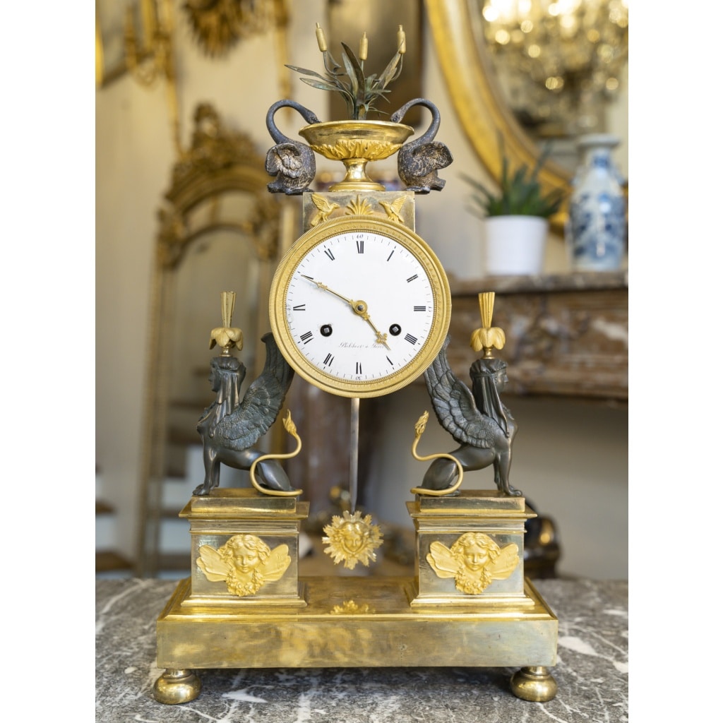 Posés sur des socles décorés d’angelots, des sphinges ailées patinés et dorés supportent le cadran émaillé à chiffres romains. Au sommet, deux cygnes en bronze argenté s’abreuvent dans une coupe en bronze doré décorée de feuilles d’acanthes, dans laquelle se dressent des roseaux à double patines.