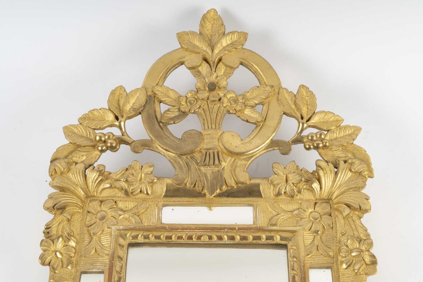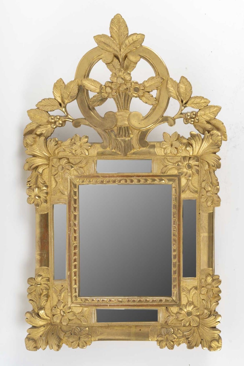 Surmonté d’un fronton en bois doré et sculpté d’un bouquet de fleurs entourré de volutes.