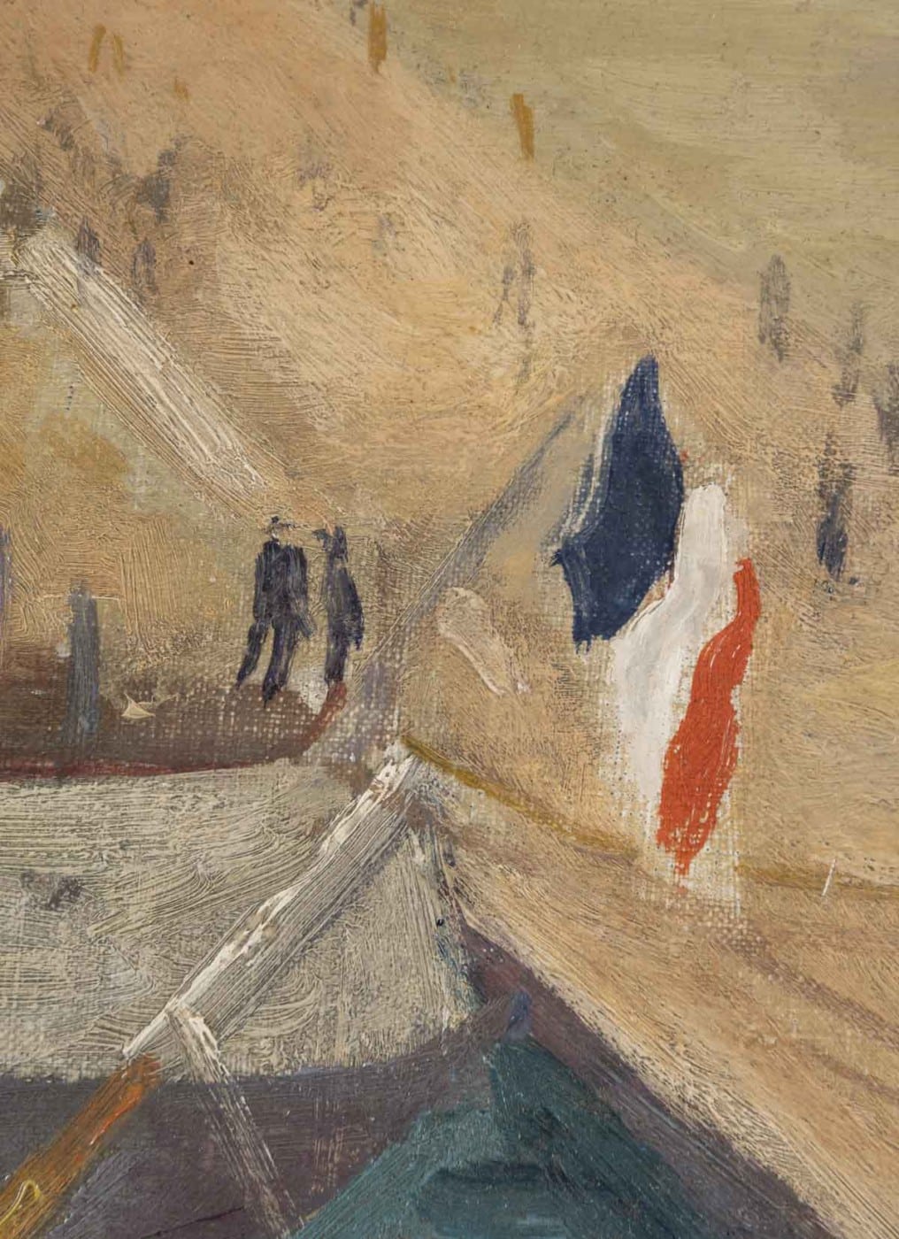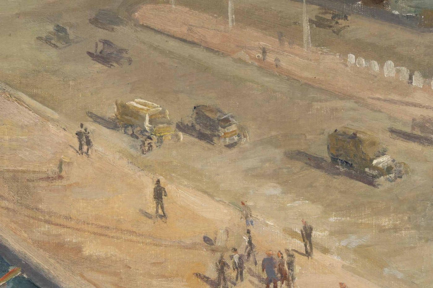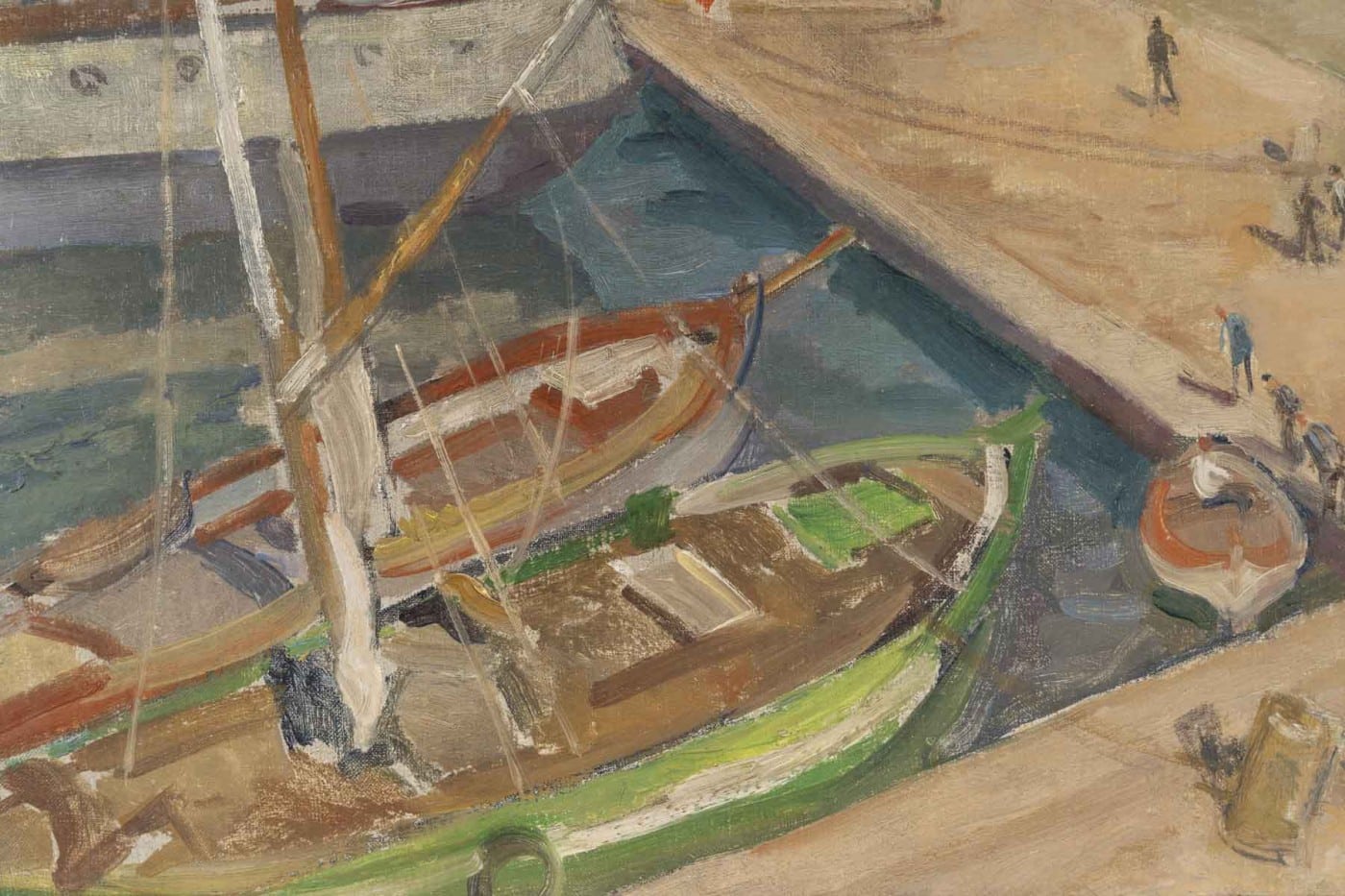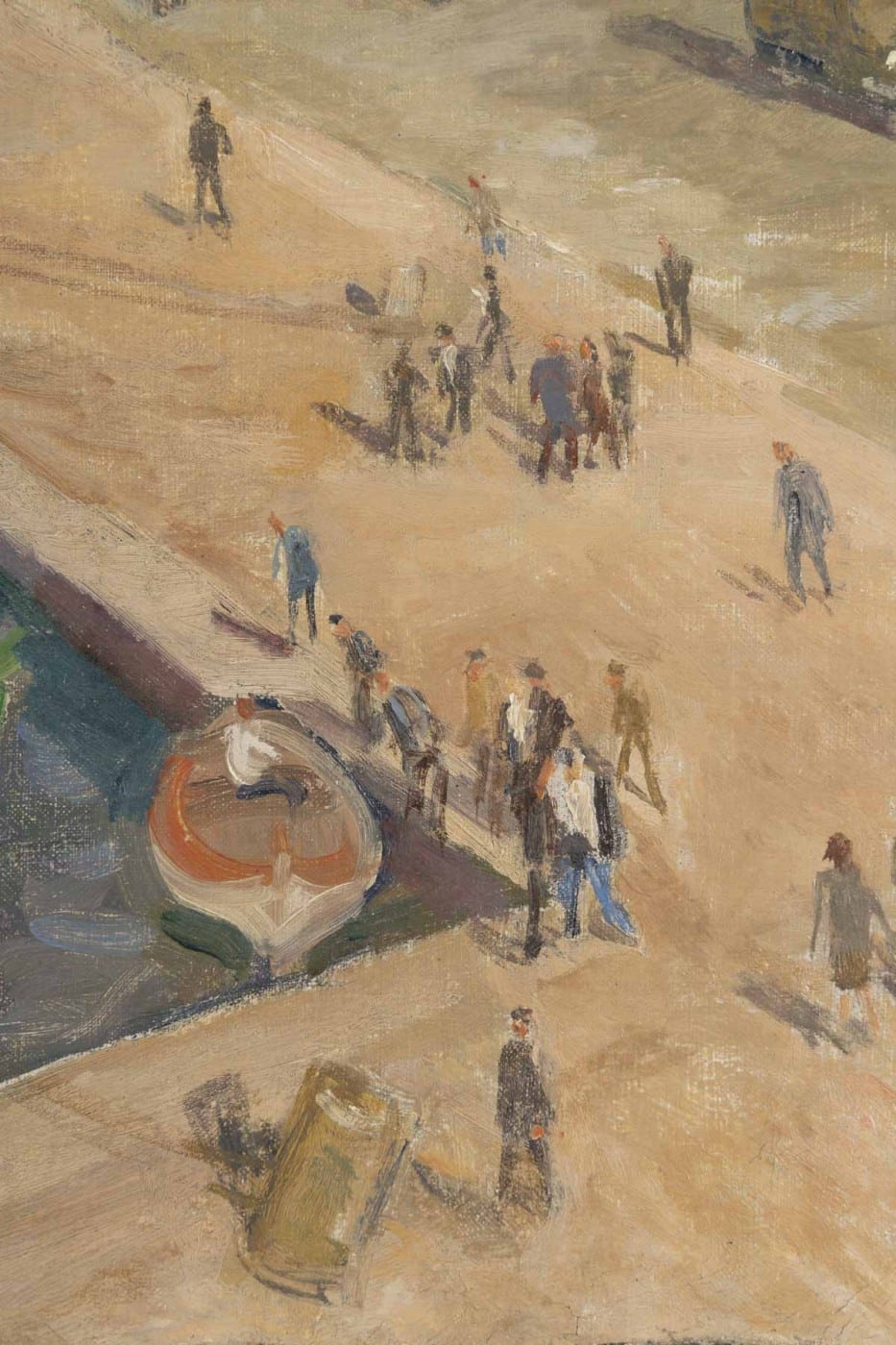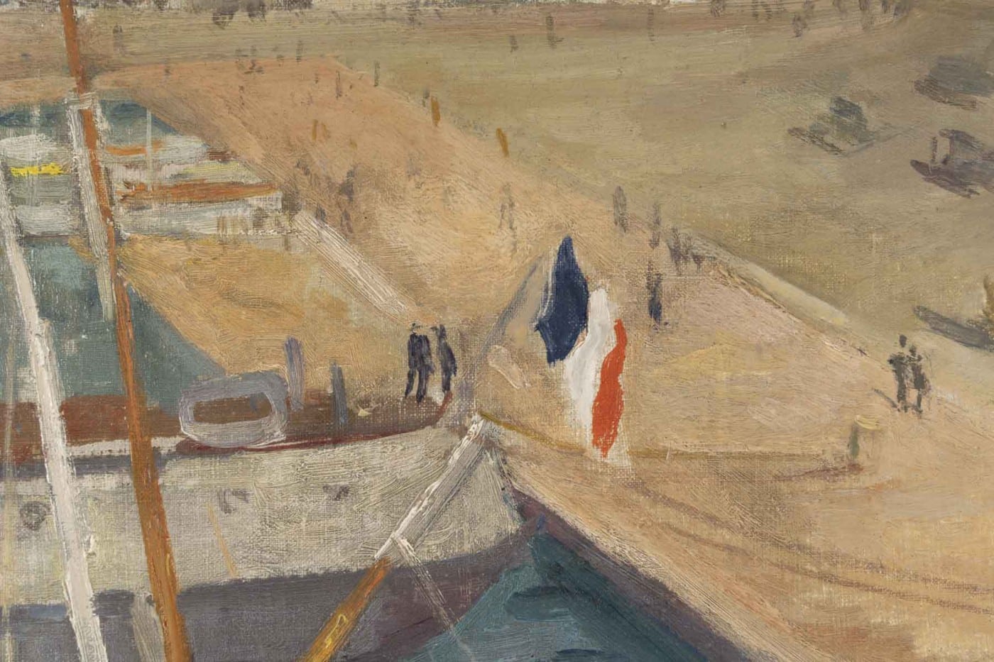 Avec vivacité et légèreté, Pierre FAVRE nous offre une vue plongeante sur le port de Marseille sous un soleil éclatant. Une palette aux couleurs chaudes avec quelques petites touches de rouge et de bleu.