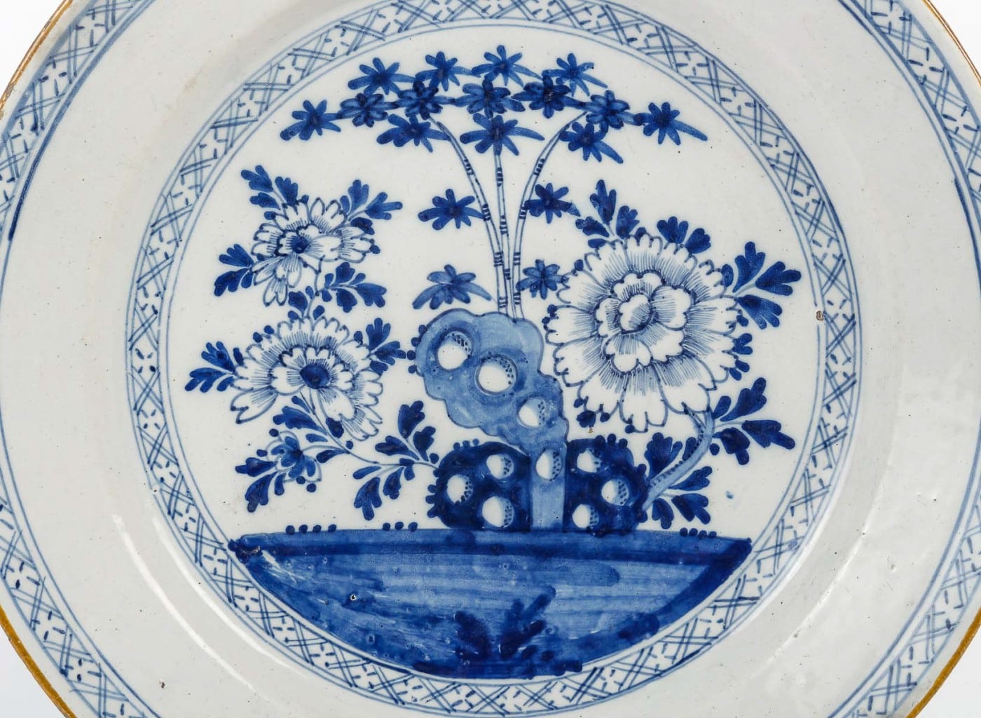 Un beau et décoratif plat rond en faïence de Delft, orné d’un décor bleu et blanc représentant d’élégantes fleurs et des branches de bambou, porte la marque de la manufacture L’Aiguière de Porcelaine (active de 1723 à 1780).