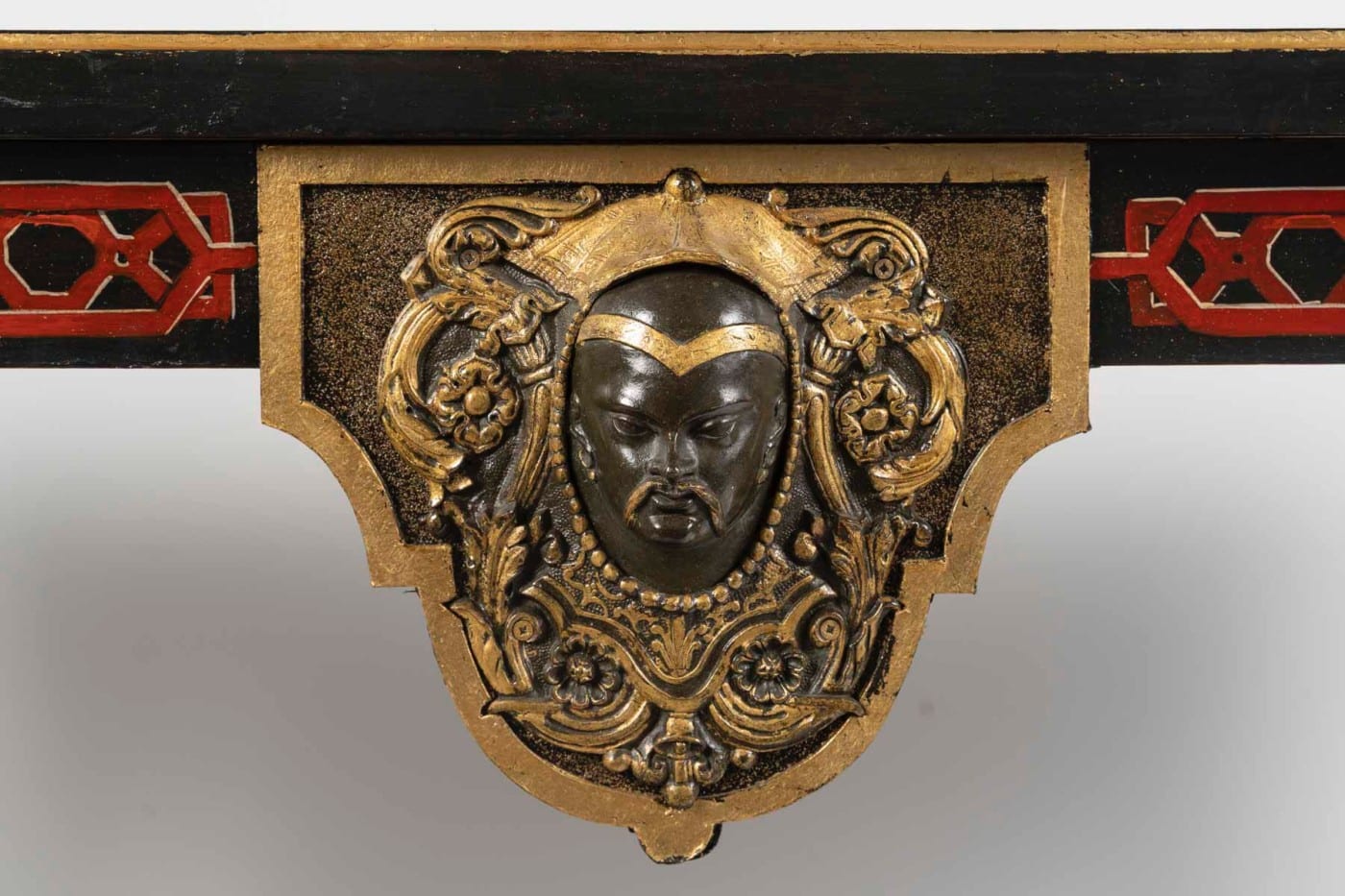 La ceinture est ornée d’un remarquable mascaron en fort relief figurant un dignitaire oriental, traité dans une interprétation occidentale raffinée du répertoire sino-japonais.