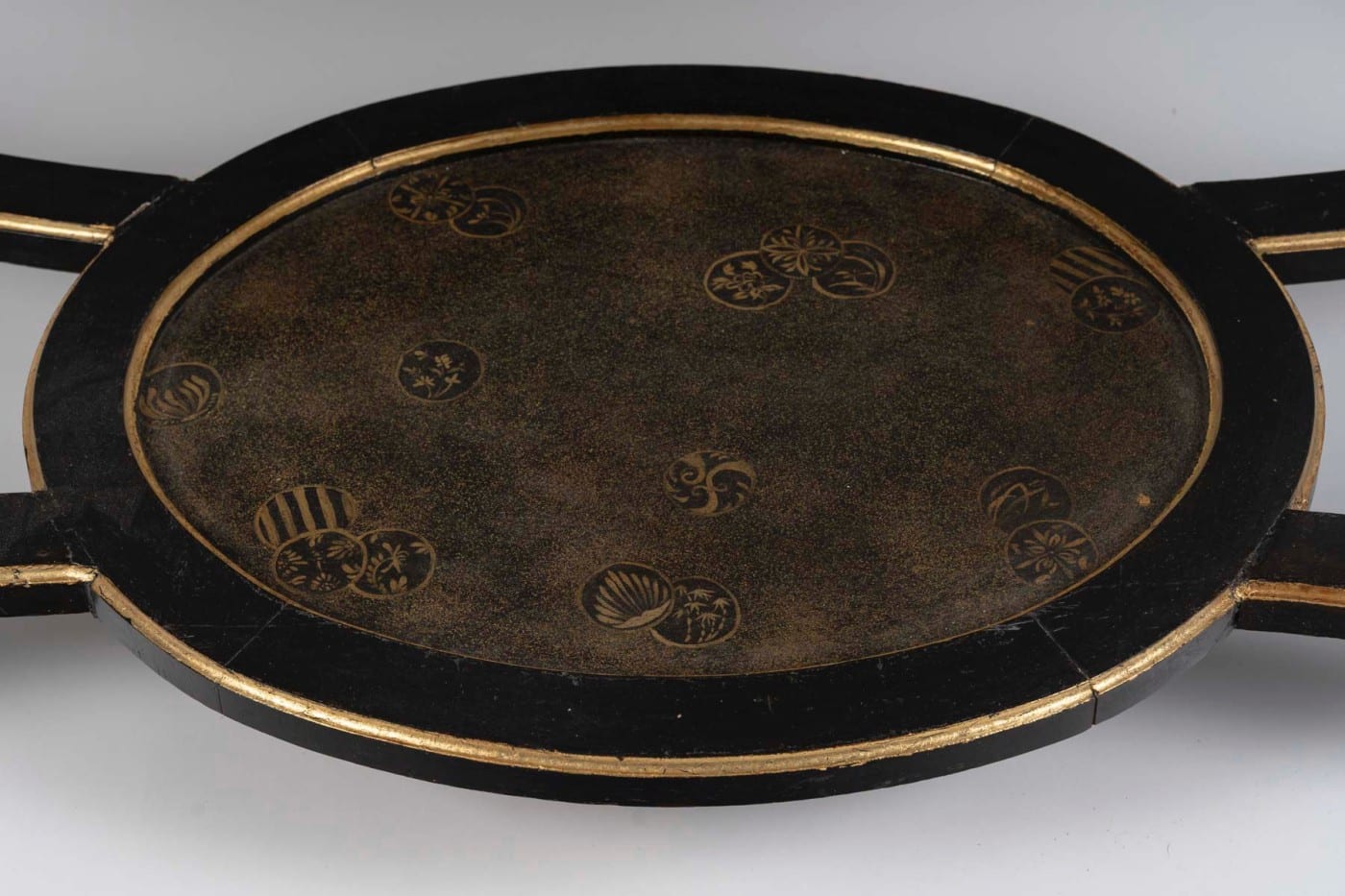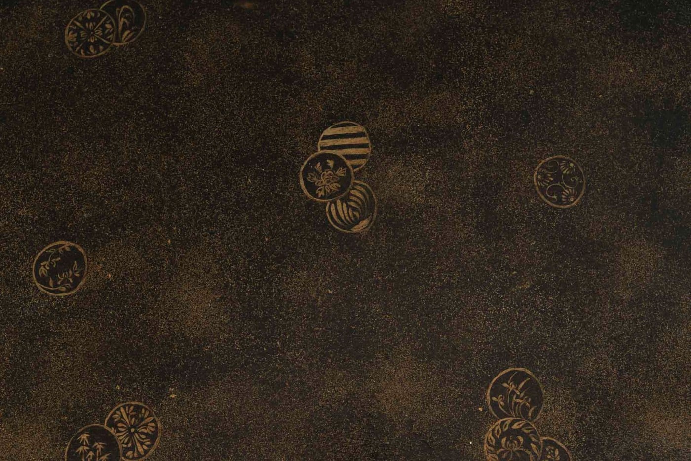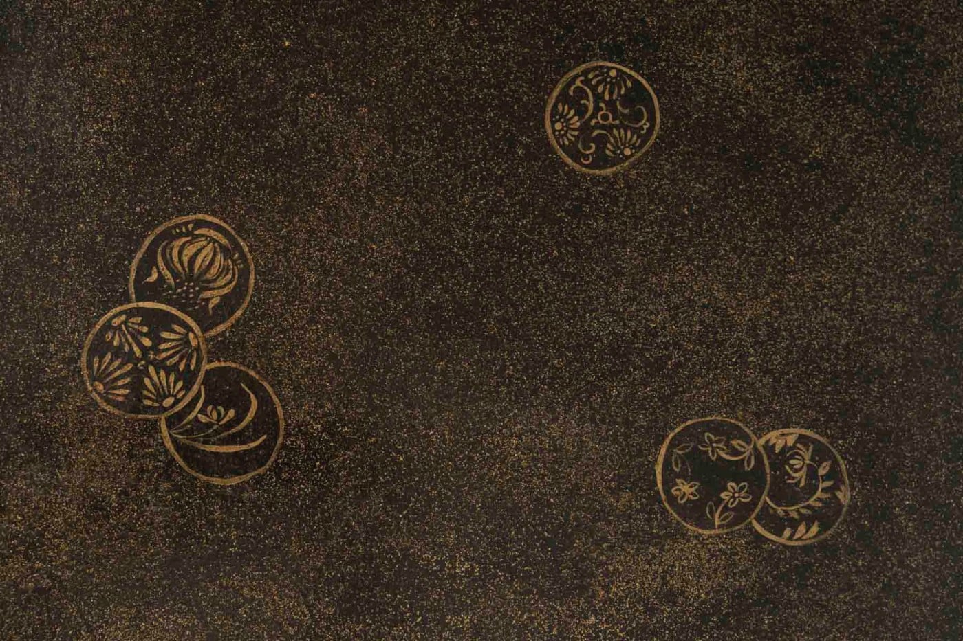 Le fond texturé imitant les laques à poudre d’or (maki-e) souligne la sophistication du décor. Les écoinçons et la frise développent une polychromie caractéristique du japonisme parisien : noir profond, dorure à la feuille et frises géométriques rouges.