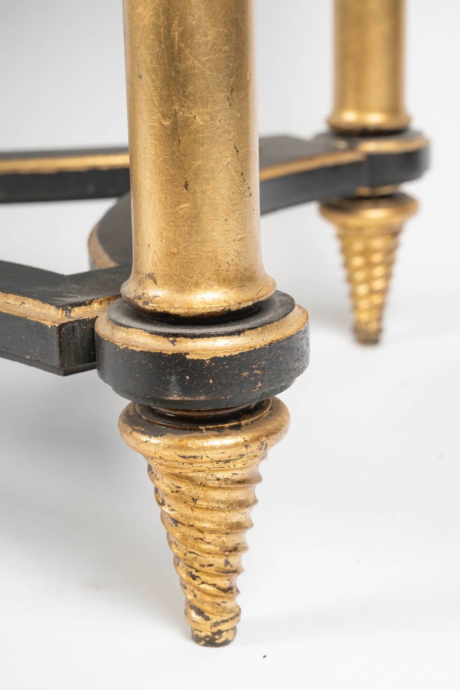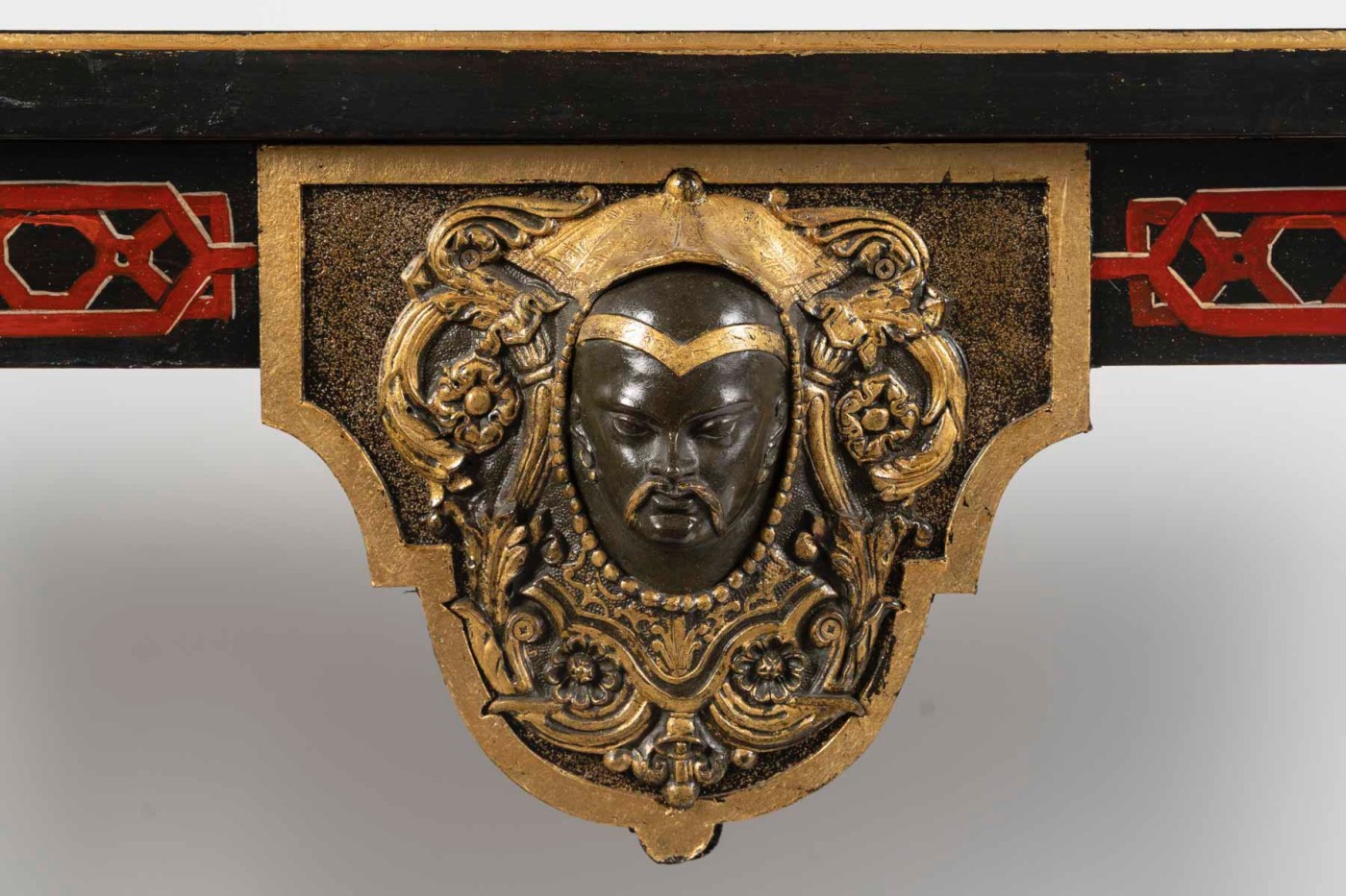 Importante console en bois entièrement sculpté, laqué noir et doré, reposant sur quatre montants tournés à l’imitation du bambou se terminant parr des pieds toupies, réunis par une entretoise centrée d’un plateau circulaire.