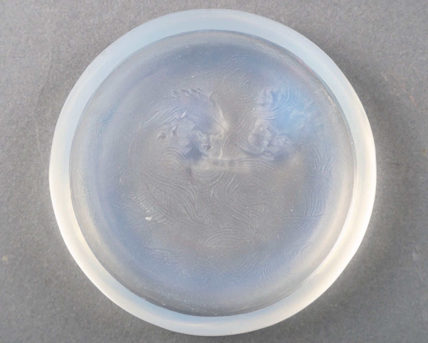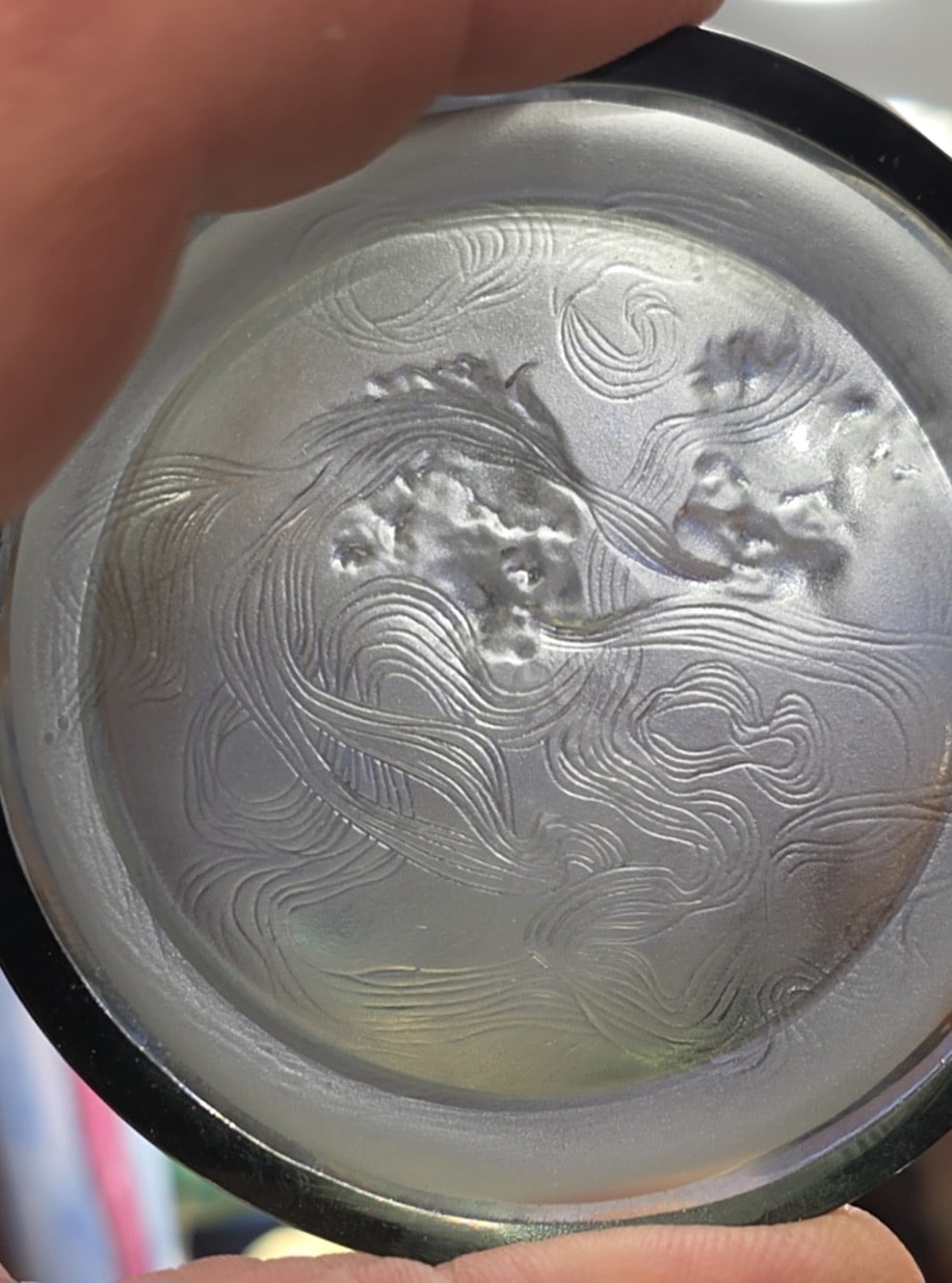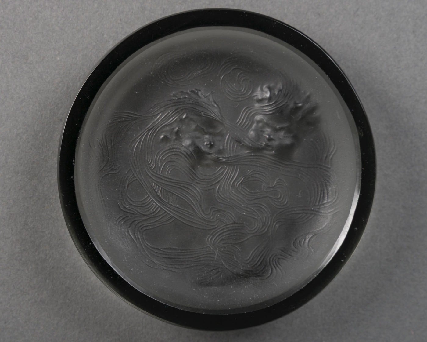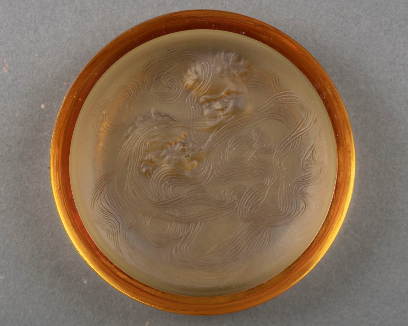 Le décor figure deux têtes ailées — allégories du vent d’Ouest — dont les chevelures se dé-ploient en un réseau de volutes enveloppantes. Cette composition circulaire, parfaitement adaptée à la fonction d’objet, illustre la capacité de Lalique à intégrer sculpture, lumière et usage domestique dans une synthèse décorative totale.