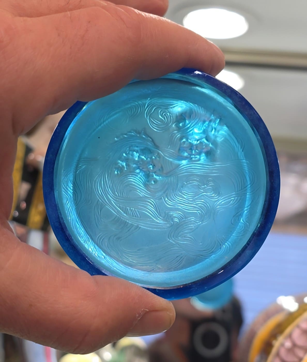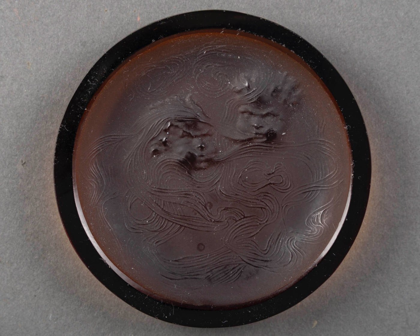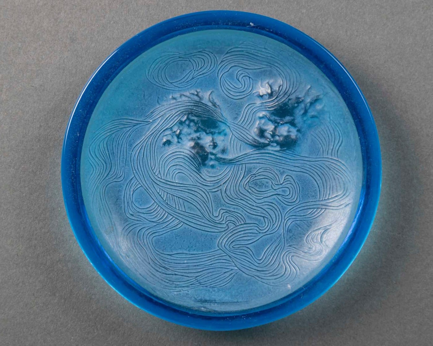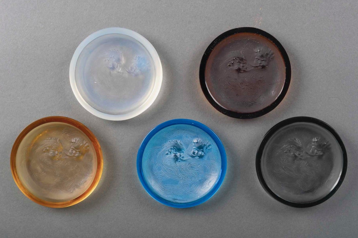 Le relief, d’une grande subtilité, capte la lumière et révèle la profondeur des teintes selon l’angle d’éclairage. La réunion des cinq coloris permet une lecture comparative exceptionnelle du travail chromatique de Lalique :